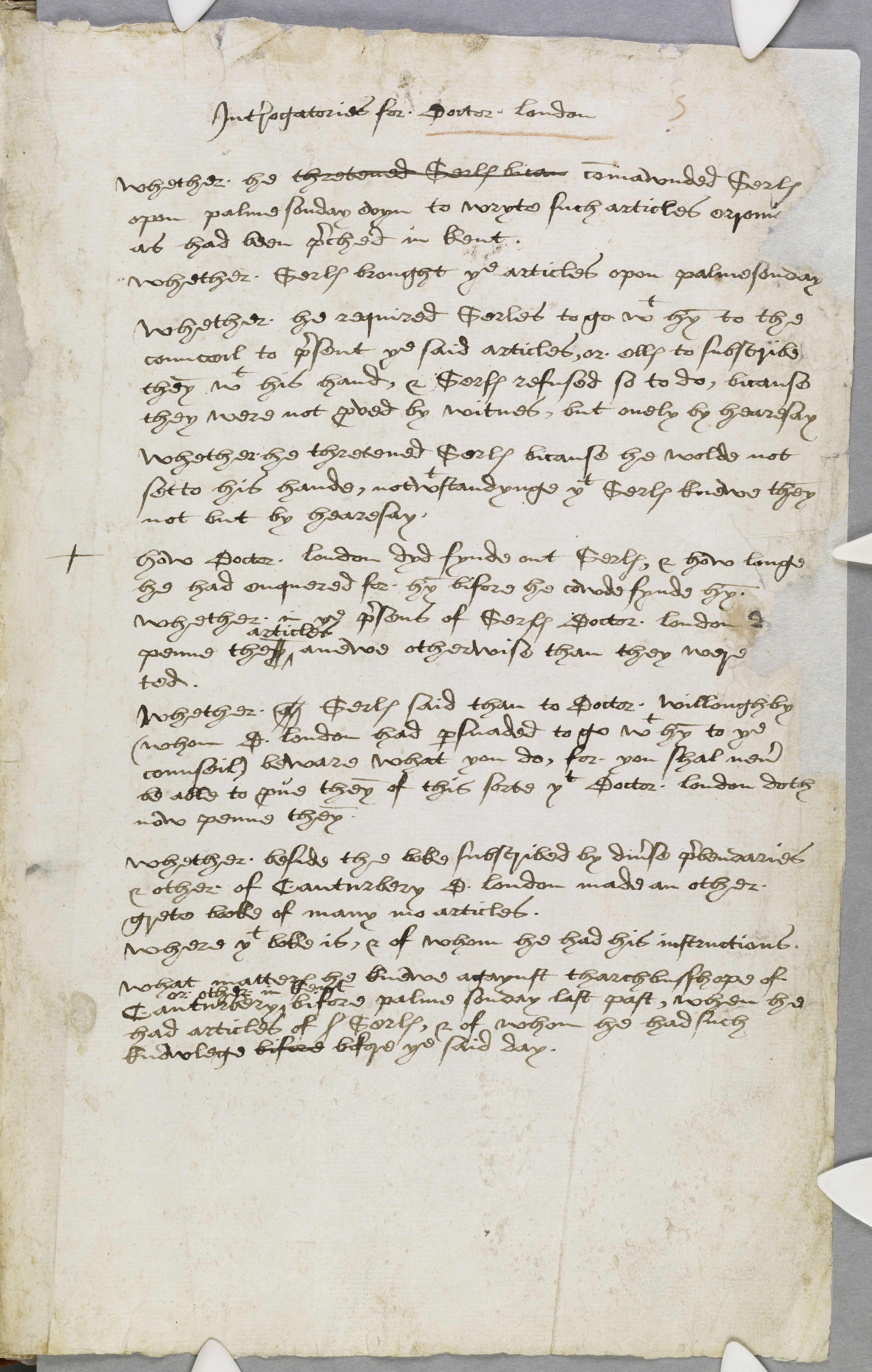 Where that boke is, & of whom he had his instructions. What matters he knewe agaynst tharchbusshope of Canturbery or other in Kent, bifore palme sonday last past, when he had articles of Sir Serles, & of whom he had such knowlege bifore before the said day.