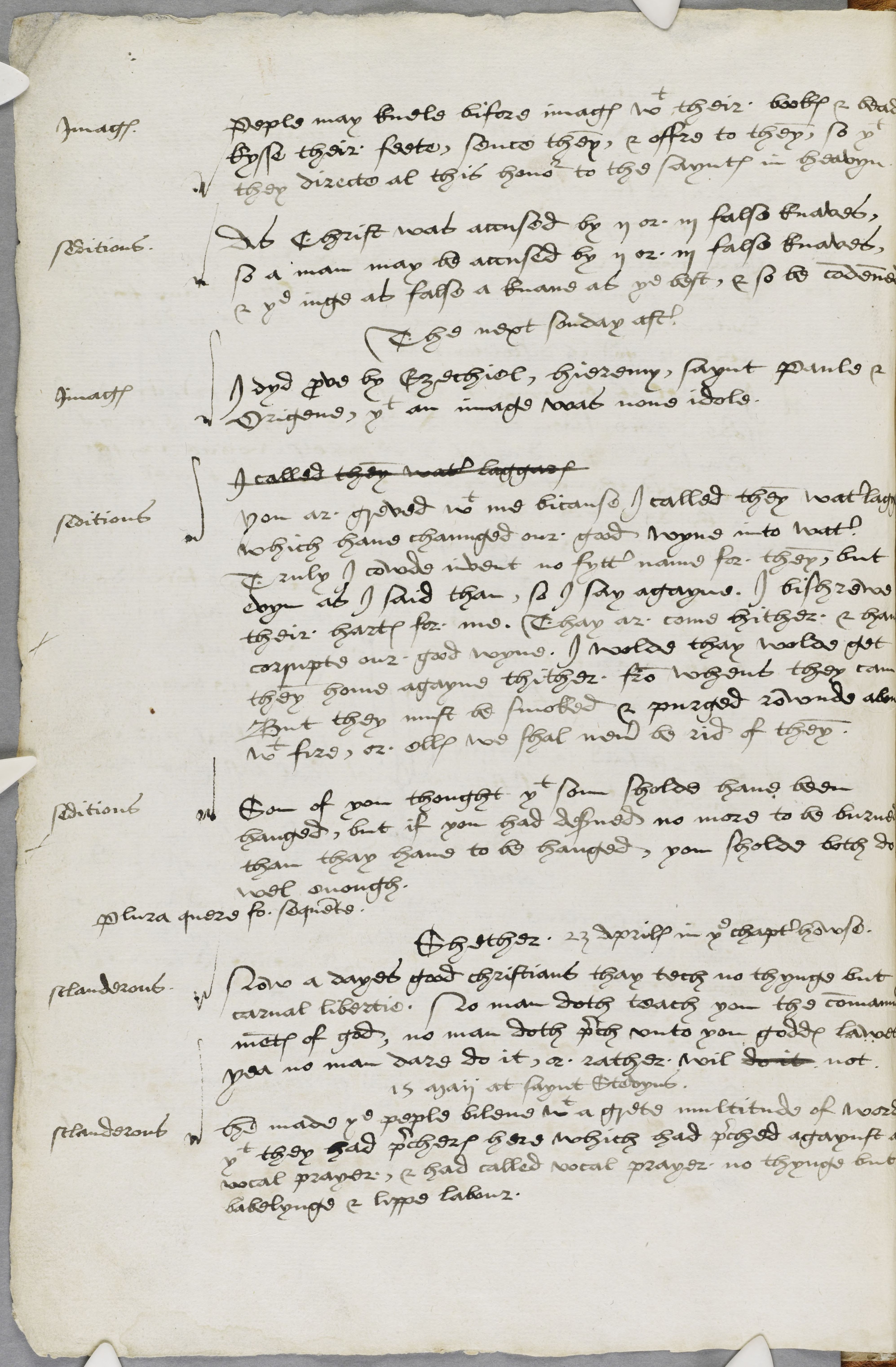 (fn. 11) "People may kneel before images with their books or beads, kiss their feet, sence them and offer to them, so that they direct all this honour to the Saints in heaven." Margin : "Images." (fn. 11) "As Christ was accused by 2 or 3 false knaves, so a man may be accused by 2 or 3 false knaves, and the judge as false a knave as the best, and so be condemned." Margin : "Seditious." The next Sunday after. (fn. 11) "I did prove by Ezechiel, Hieremy, St. Paul and Origen that an image was none idol." Margin : Images. (fn. 11) "You are grieved with me because I called them waterlaggers which have changed our good wine into water. Truly I could invent no fitter name for them; but even as I said then, so I say again. I beshrew their hearts for me. They are come hither and have corrupt our good wine. I would they would get them home again thither from whence they came. But they must be smoked and purged round about with fire, or else we shall never be rid of them." Margin : "Seditious." (fn. 11) "Some of you thought that some should have been hanged, but if you had deserved no more to be burned than they have to be hanged you should both do well enough." Margin : "Seditious." "Prima qure fo. sequente." iii. Shether, 23 Aprilis, in the Chapter house. (fn. 11) "Nowadays, good Christians, they teach nothing but carnal liberty, no man doth teach you the Commandments of God; no man doth preach unto you God's laws; yea, no man dare do it, or rather will not." Margin : "Slanderous." 15 Maii, at St. Stevyns. (fn. 11) "He made the people believe with a great multitude of words that they had preachers here which had preached against vocal prayer, and had called vocal prayer nothing but babbling and lip labor." Margin : "Slanderous."