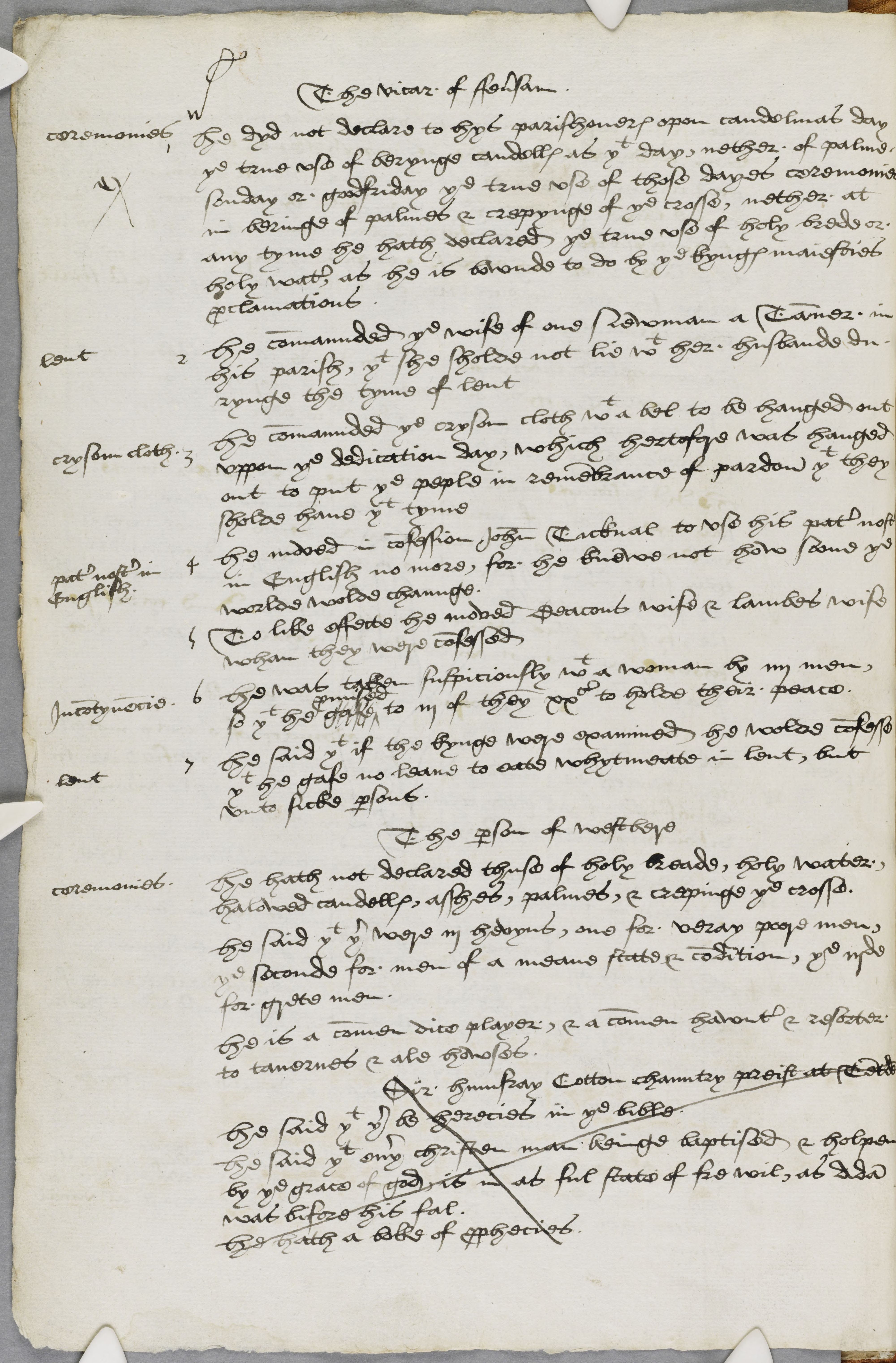 He dyd not declare to hys parishoneres opon candelmas day the true use of berynge candelles as that day, nether of palme sonday or goodfriday the true use of those dayes ceremonies in beringe of palmes & crepynge of the crosse, nether at any tyme he hath declared the true use of holy brede or holy water, as he is bownde to do by the kynges maiesties proclamations.