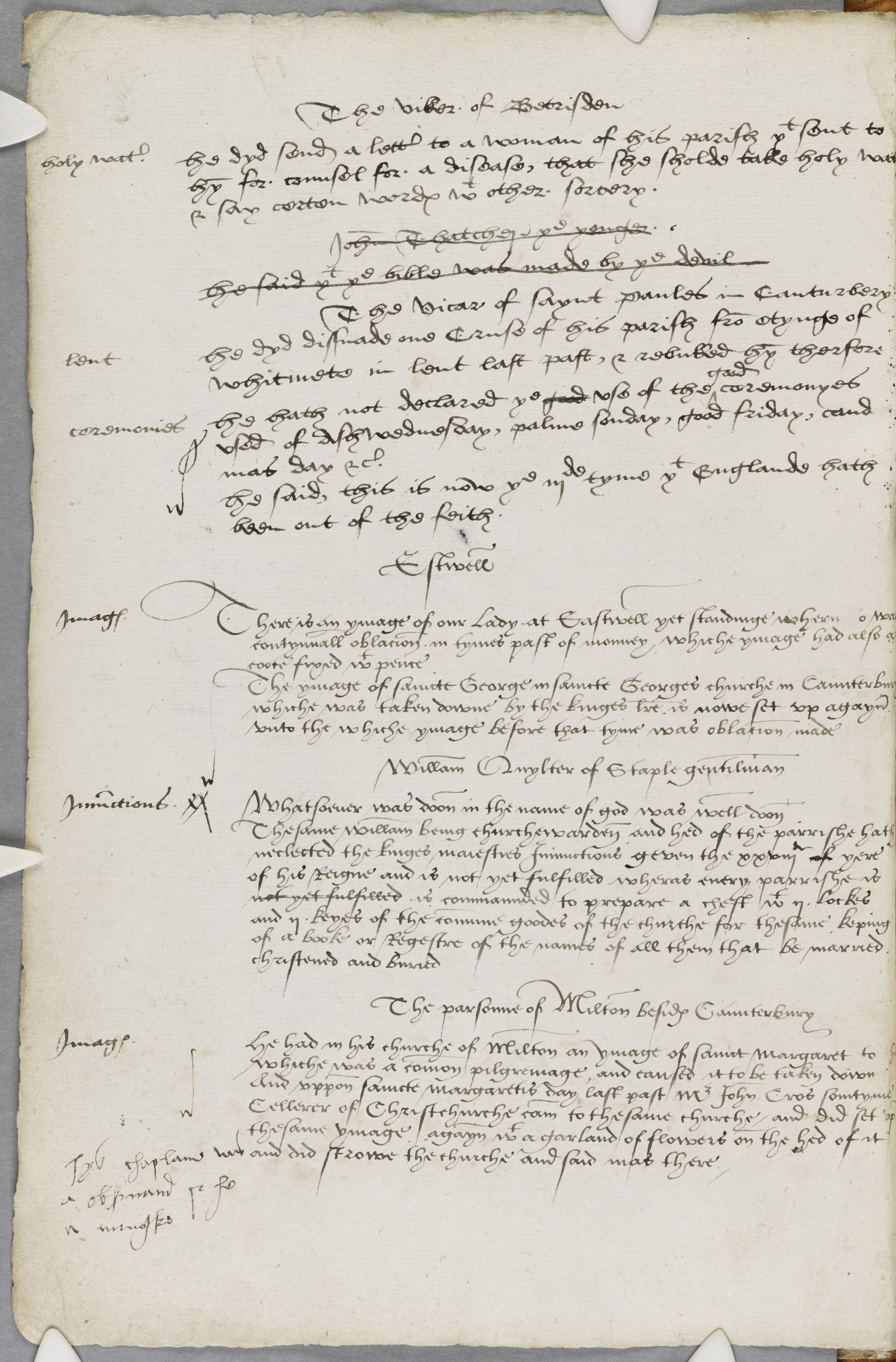 xxii. The Vicar of Betrisden. "He did send a letter to a woman of his parish that sent to him for counsel for a disease, that she should take holy water and say certain words, with other sorcery." Margin : "Holy water." xxiii. [John Thatcher the younger. ["He said that the Bible was made by the Devil."] (fn. 14) xxiv. The Vicar of St. Paul's in Canterbury. "He did dissuade one Cruse, of his parish, from eating of white meat in Lent last past, and rebuked him therefor." Margin : "Lent." "He hath not declared the use of good ceremonies used of Ash Wednesday, Palm Sunday, Good Friday, Cand[le]mas day, &c." Margin : "Ceremonies." (fn. 11) "He said 'This is now the 3d time that England hath been out of the faith.'" (fn. 15) xxv. Estwell. "There is in an image of Our Lady at Estwell yet standing, whereunto was continual oblation in times past of money; which image had also a coat fixed with pence." Margin : "Images." xxvi. William Quilter of Staple, gentleman. (fn. 11) Whatsoever was done in the name of God was well done. "The same William, being churchwarden and head of the parish, hath neglected the King's Majesty's injunctions given the 28th (fn. 16) year of his reign and is not yet fulfilled, whereas every parish is commanded to prepare a chest with two locks and two keys, of the common goods of the church, for the same (qu. safe?) keeping of a book or register of the names of all them that be married, christened and buried." Margin : "Injunctions." xxvii. The Parson of Milton besides Canterbury. (fn. 11) "He had in his church of Milton an image of St. Margaret, to which was a common pilgrimage, and caused it to be taken down. And upon St. Margaret's day last past Mr. John Cros, sometime cellarer of Christchurch, came to the same church and did set the same image again with a garland of flowers on the head of it, and did strowe the church and said mass there." Margin : "Images." In another hand : "His chaplain was a Observand and he a mungke."
