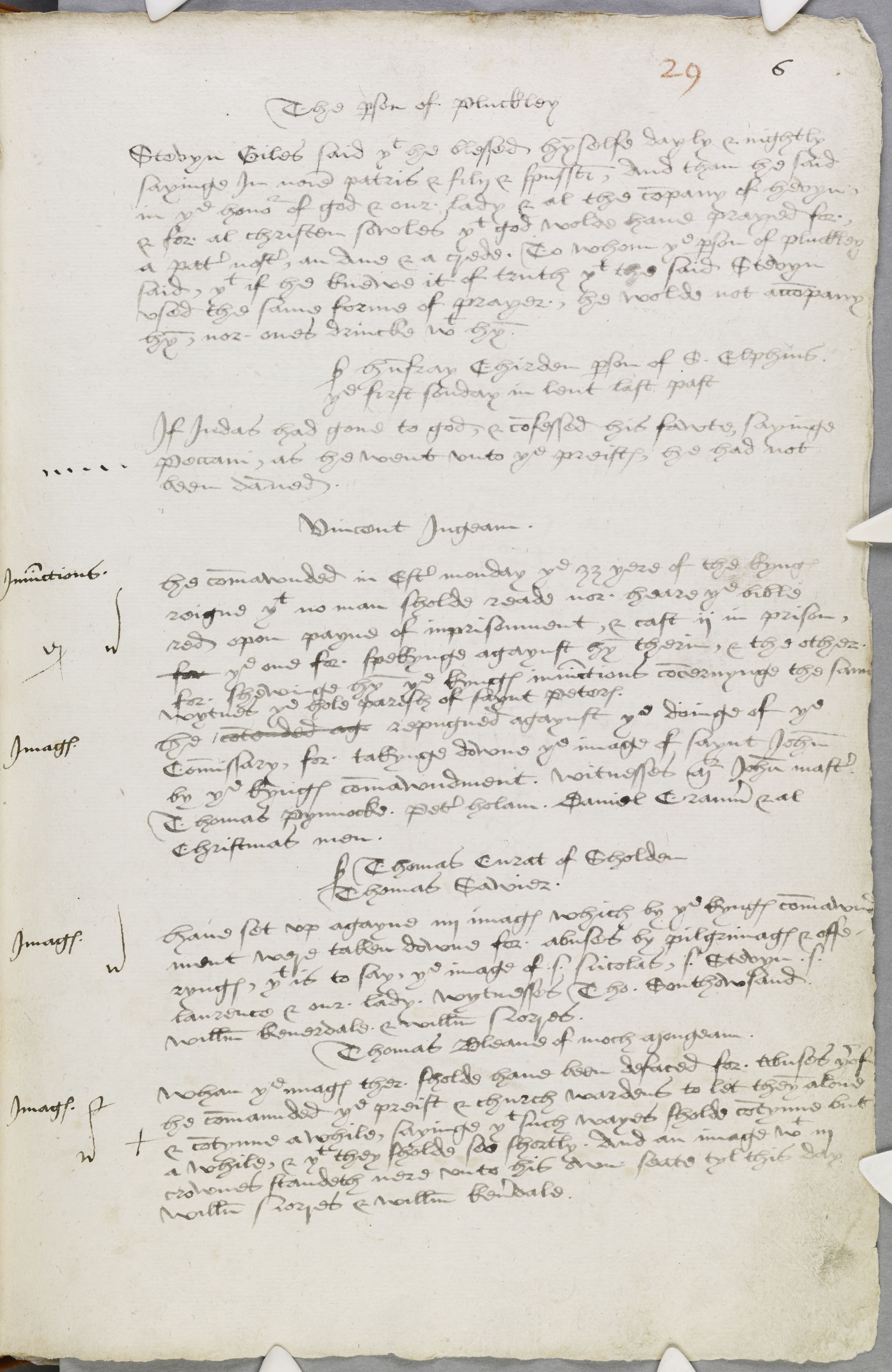 VI. Depositions against the following persons : i. The Parson of Pluckley :Steph. Giles said that he blessed himself daily and nightly saying In nomine Patris, &c.; "and then he said, in the honor of God and Our Lady and all the Company of Heaven and for all Christian souls that God would have prayed for, a Paternoster, an Ave and a Creed. To whom the parson of Pluckley said that if he knew it of truth that the said Stevyn used the same form of prayer, he would not accompany him, nor once drink with him." ii. (fn. 11) "Sir Humfray Chirden parson of St. Elphins ye first Sunday in Lent last past :""If Judas had gone to God and confessed his fault, saying Peccavi as he went in to the priests, he had not been damned." iii. (fn. 11) Vincent Ingeam :(1) He commanded, on Easter Monday 33 Hen. VIII., that no man should read or hear the Bible read on pain of imprisonment, and cast two in prison, the one for speaking against him therein, the other for showing him the King's injunctions concerning the same. Witness, the whole parish of St. Peter's.In margin : "Injunctions." (2) He repugned against the doing of the Commissary in taking down the image of St. John by the King's commandment. Witnesses, Mr. John Master, Thomas Pynnocke, Peter Holam, Daniel Cranmer, "and al Christmas men" (sic). Margin : "Images." iv. (fn. 11) "Sir Thomas Curat of Sholden [and] Thomas Sawier" have set up again 4 images taken down by the King's commandment for abuses by pilgrimages and offerings, viz., the images of St. Nicholas, St. Stephen, St. Laurence, and Our Lady. Witnesses, Thos. Southowsand, Wm. Kenerdale, and Wm. Norres. Margin : "Images." v. (fn. 11) Thomas Bleane of North Mongeam, when the images should have been defaced, commanded the priest and churchwardens to let them alone, "saying that such ways should continue but a while, and that they should see shortly. And an image with three crowns standeth near unto his own seat till this day. [Witnesses,] Wm. Norres and Wm. Kenerdale. Margin : "Images."