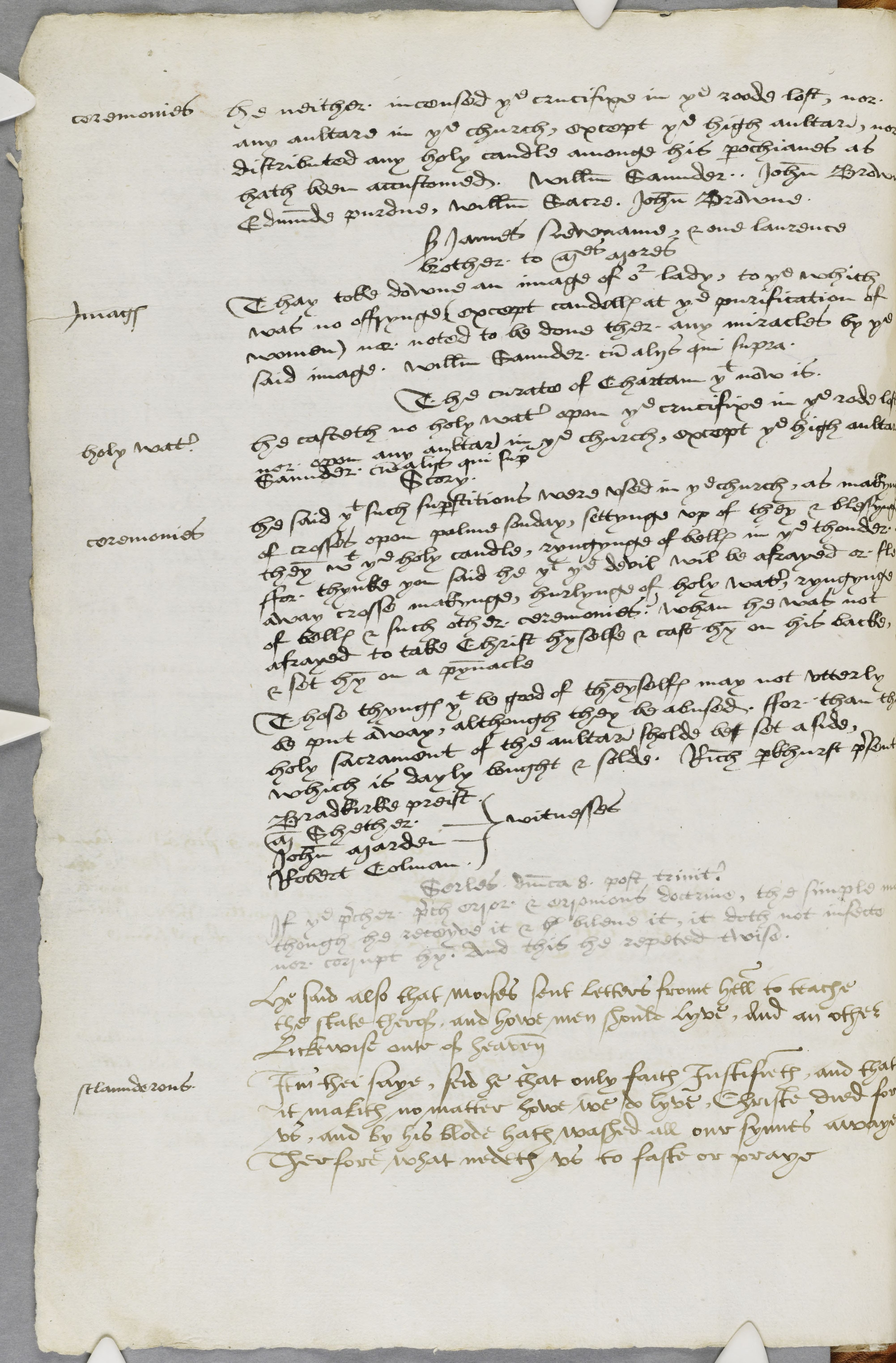 he neither incensed the crucifixe in the roode loft, nor any aultare in the church, except the high aultare, nor distributed any holy candle amonge his parochianes as hath been accustomed. William Saunder. John Brown Edmunde purdue, william Sacre. John Browne.