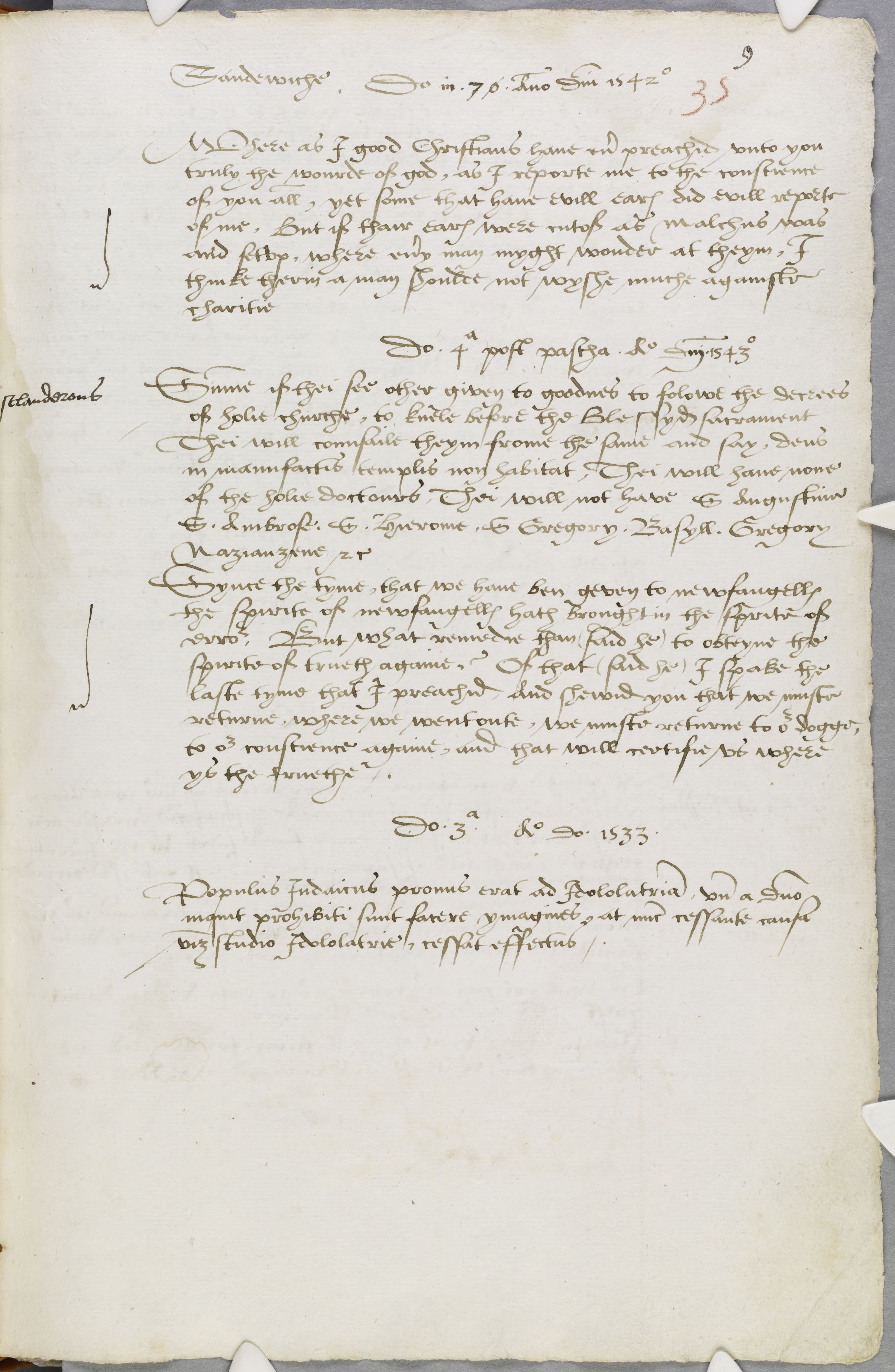 xxiv. Sandwiche. "Do. in 70 (Septuagesima Sunday) Anno Domini 1542." "Whereas I, good Christians, have ever preached unto you truly the word of God, as I report me to the conscience of you all, yet some that have evil ears did evil report of me. But if their ears were cut off as Malchus' was and set up where every man might wonder at them, I think therein a man should not wish much against charity." "Do. 4a post pascha Ao. D'ni. 1543.Some, if they see other given to goodness to follow the decrees of the Holy Church, to kneel before the Blessed Sacrament, they will counsel them from the same and say Deus in manufactis templis non habitat. They will have none of the holy doctors. They will not have St. Augustine, St. Ambrose, St. Hierome, St. Gregory, Basyll, Gregory Nazianzene, &c." "Since the time that we have been given to newfangells the spirit of newfangells hath brought in the spirit of error. But what remedy then, said he, to obtain the spirit of truth again? Of that, said he, I spake last time that I preached, and showed you that we must return where we went out. We must return to our dog, to our conscience again, and that will certify us where is the truth. "Do. 3a, Ao Do. 1533 (sic).Populus Judaicus pronus erat ad idolatriam, unde a Domino, inquit, prohibiti sunt facere ymagines; at nunc, cessante causa, viz. studio idolatri, cessat effectus."
