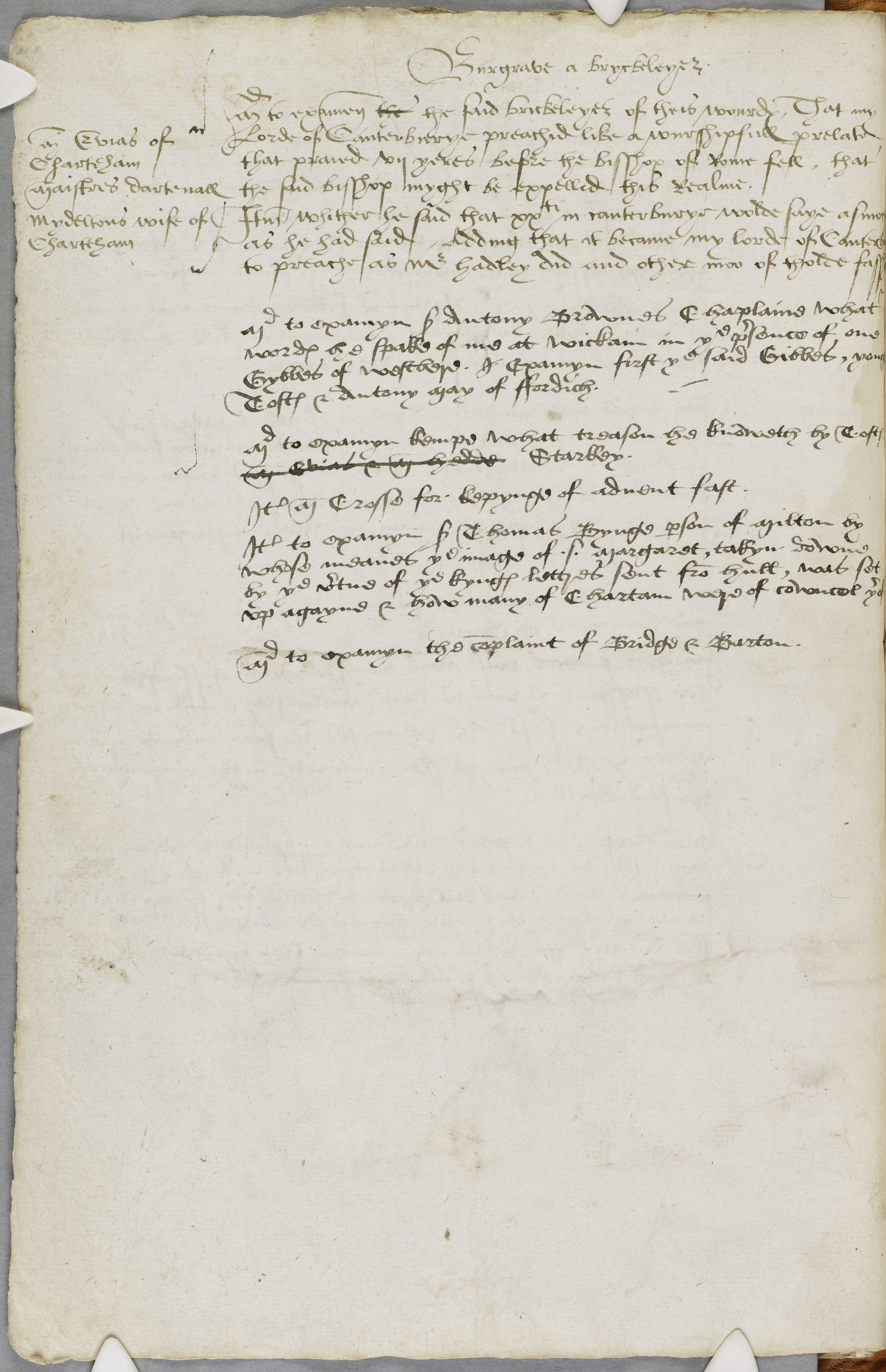 Memorandum to examen the the said brickeleyer of theis wourdes, That my Lorde of Canterburye preachid like a wurshipfull prelate that praied vii yeres before the bisshop of Rome fell, that the said bisshop myght be expelled this Realme. Item whither he said that xxti in canterburye wolde saye asmoch as he had said, Adding that it became my lorde of Canterbury to preache as Mr. hadley did and other moo of tholde fasshion