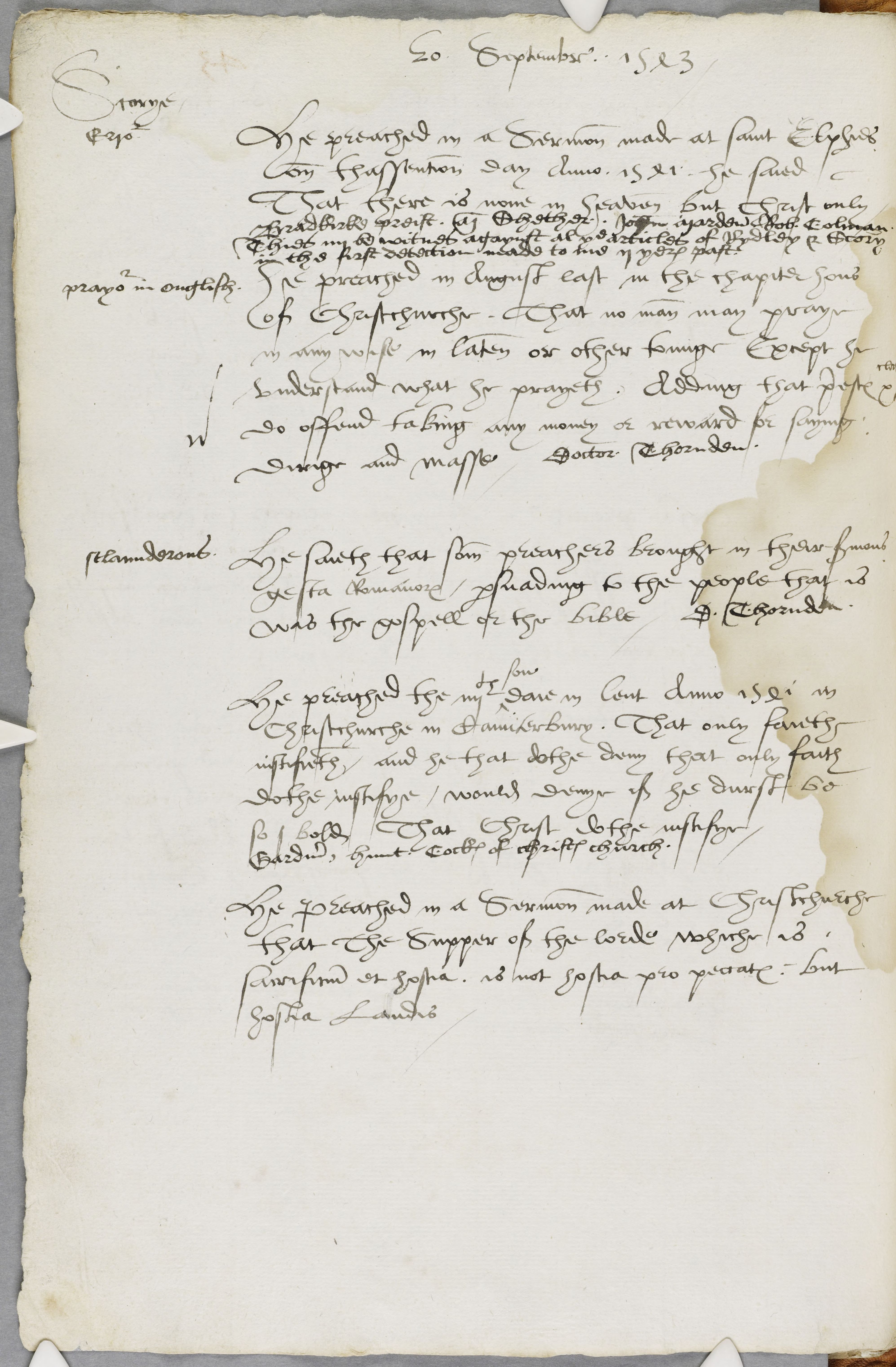 He preached in a Sermon made at saint Elphies on thassention day Anno 1541. he saied That there is none in heaven but Christ only Bradkirke preist. Mr Shether. John marden Rob Colman. Thies iiii be witnes agaynst al the articles of Rydley & Scory in the first detection made to me ii yeres past.