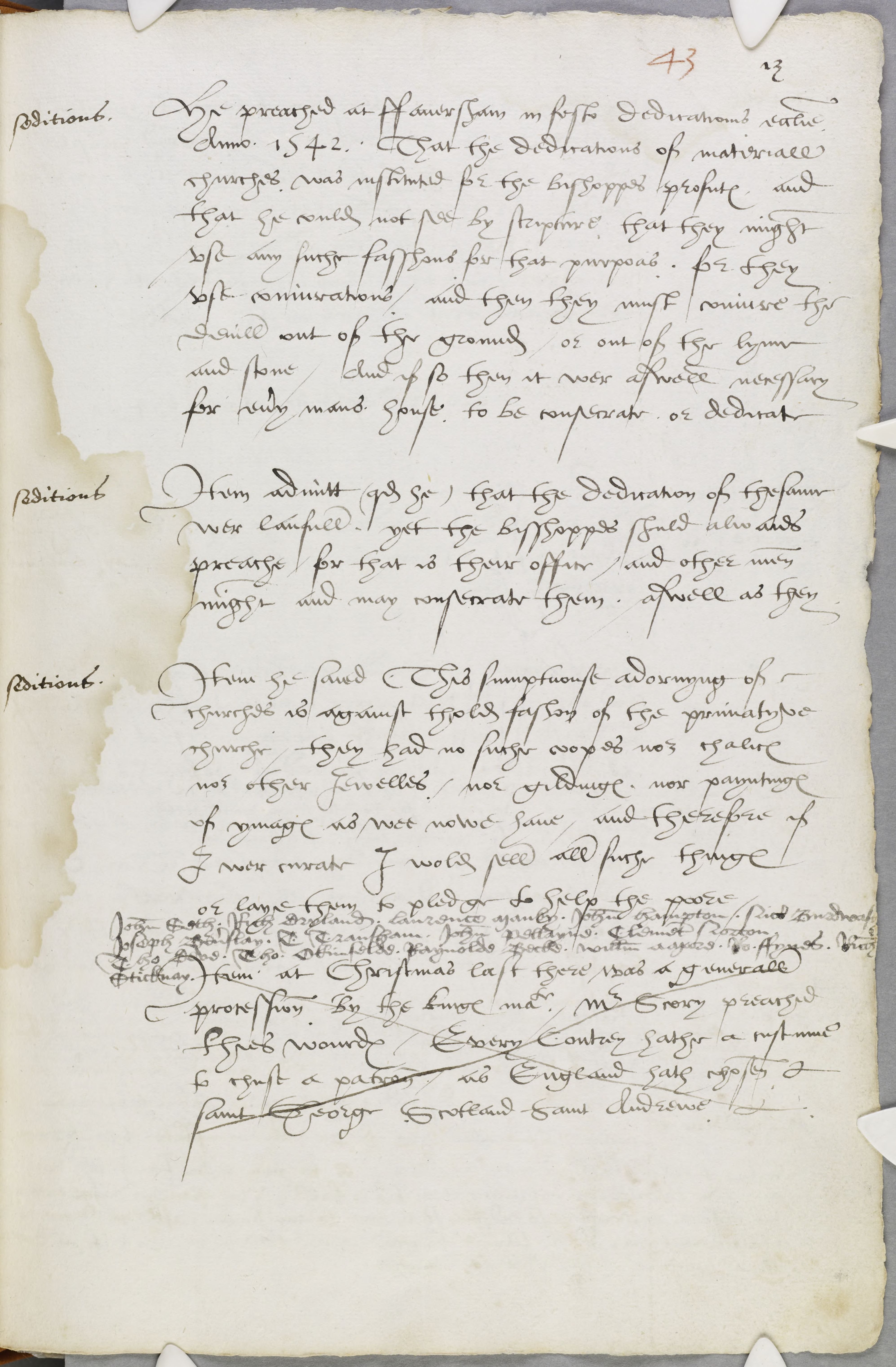 "He preached at Faversham in festo Dedicationis ecclesie Anno 1542 that the dedications of material churches was instituted for the Bishops' profits, and that he could not see by Scripture that they might use any such fashions for that purpose; for they use conjurations and then they must conjure the Devil out of the ground, or out of the lime and stone; and if so, then it were as well necessary for every man's house to be consecrate or dedicate. Item, admit, quod he, that the dedication of the same were lawful, yet the Bishops should always preach, for that is their office, and other men might and may consecrate them as well as they. Item, he said This sumptuous adorning of churches is against the old fashion of the primitive Church. They had no such copes or chalices nor other jewels, nor gildings, nor paintings of images as we now have, and therefore if I were curate I would sell all such things, or lay them to pledge to help the poor." (Note by Cranmer : John Seth, Rich. Dryland, Lawrence Manby, John Hampton, Nich. Burdwast, Joseph Beverslay, T. Transham, John Pellayne, Clement Norton, Tho. Dove, Tho. Okinfelde, Raynold Becke, Will'm a Moore, Ro. Fynes, Rich. Sticknay.) ["Item, at Christmas last there was a general procession by the King's Majesty. Mr. Scory preached these words : Every country hath a custom to choose a patron, as England hath chosen St. George, Scotland St. Andrew