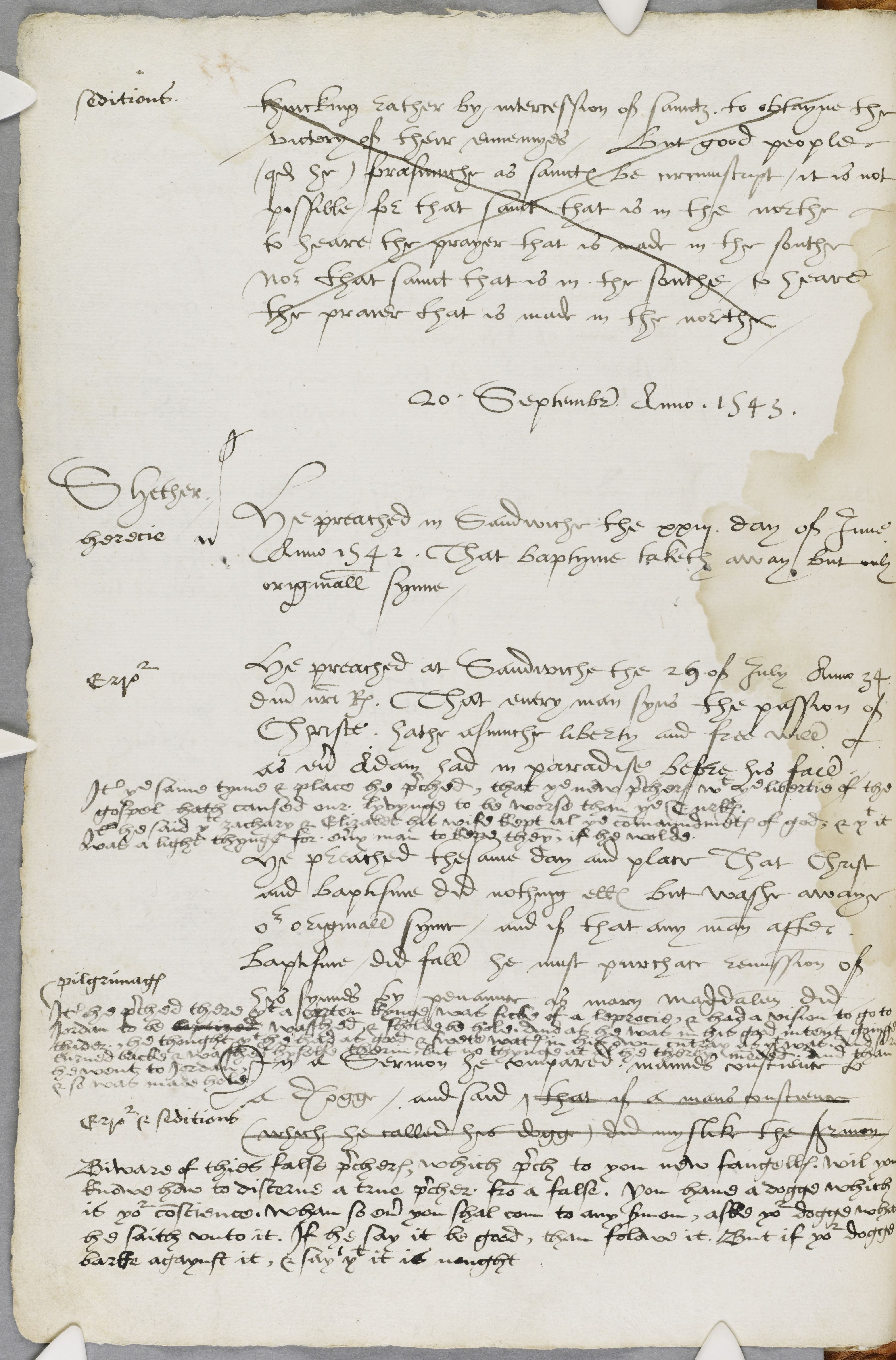 He preached at Sandwich, 23 June 1542 that Baptism takes away only original sin (Cr. "Heresy"); and on the 29 July 34 Hen. VIII. that every man since the Passion of Christ has as much free will as Adam had in Paradise (Cr. "Error"); also that the new preachers with the liberty of the Gospel have caused our living to be worse than the Turks; that Zachary and Elizabeth his wife kept all the commandments, and that it was a light thing for every man to keep them if he would; that if a man sinned after baptism he must purchase remission by penance like Mary Magdalen; also of a king that had a leprosy and had a vision to go to Jordan to wash and be made whole; but in going he thought the well waters of his own country would be as good and turned back and washed in them, but, not being cured, went to Jordan and so was made whole. He compared a man's conscience to a dog, and said "Beware of these false preachers, which preach to you new fangells. Will you know how to discern a true preacher from a false? You have a dog, which is your conscience. Whensoever you shall come to any sermon ask your dog what he saith unto it. If he say it be good, then follow it; but if your dog bark against it and say that it is naught,