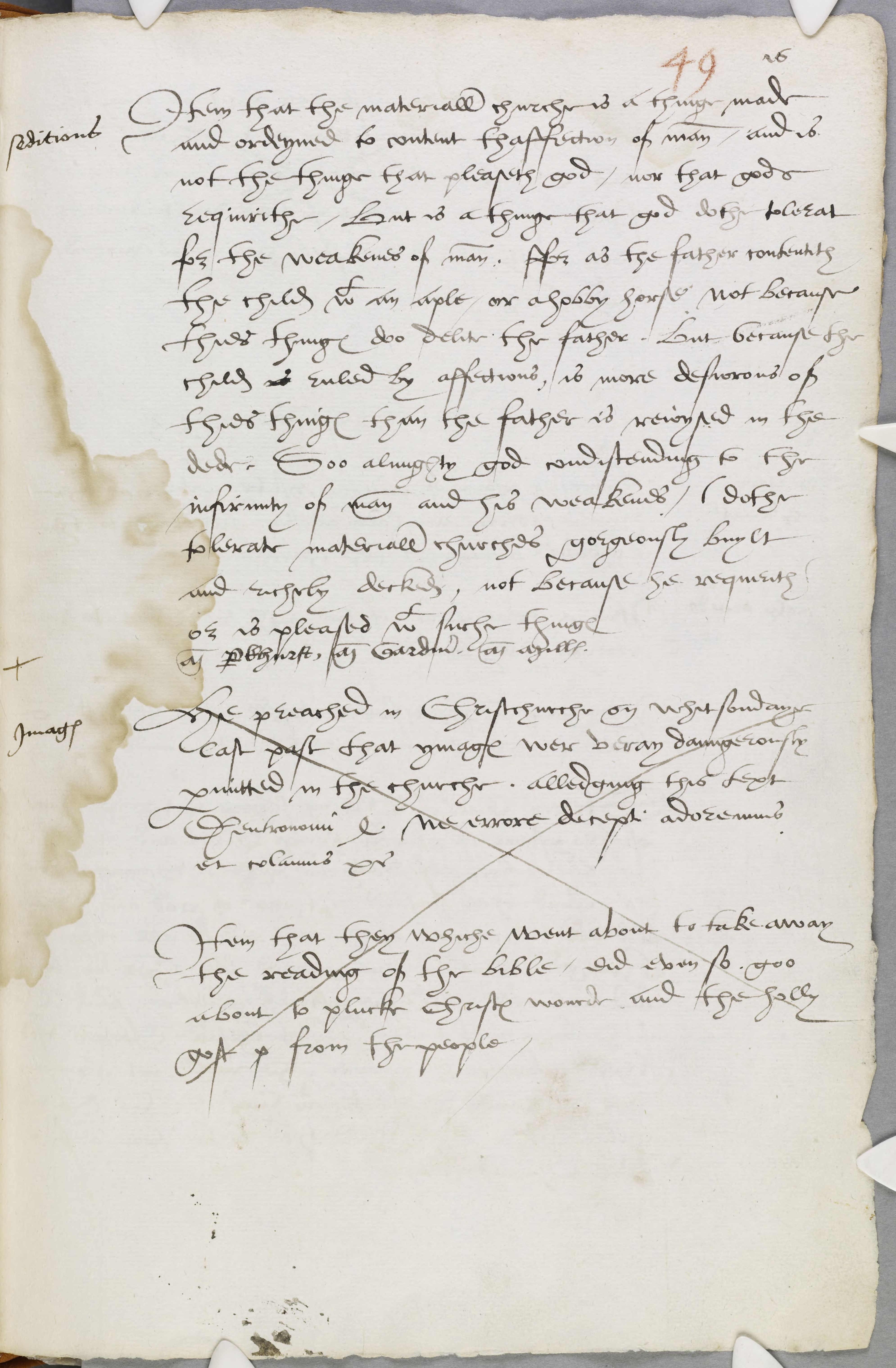Item that the materiall churche is a thinge made and ordeyned to content thaffection of man, and is not the thinge that pleaseth god / nor that gods requirith / But is a thinge that god dothe tolerat for the weakenes of man. ffor as the father contentith the child with an aple, or a hobby horse not because thies thinges doo delite the father. but because the child is ruled by affections, is more desierous of thies thinges than the father is reioysed in the dede. Soo almighty god condiscending to the infirmity of man and his weakenes, (dothe tolerate materiall churches gorgeously buylt and richely decked, not because he requirith or is pleased with suche thinges