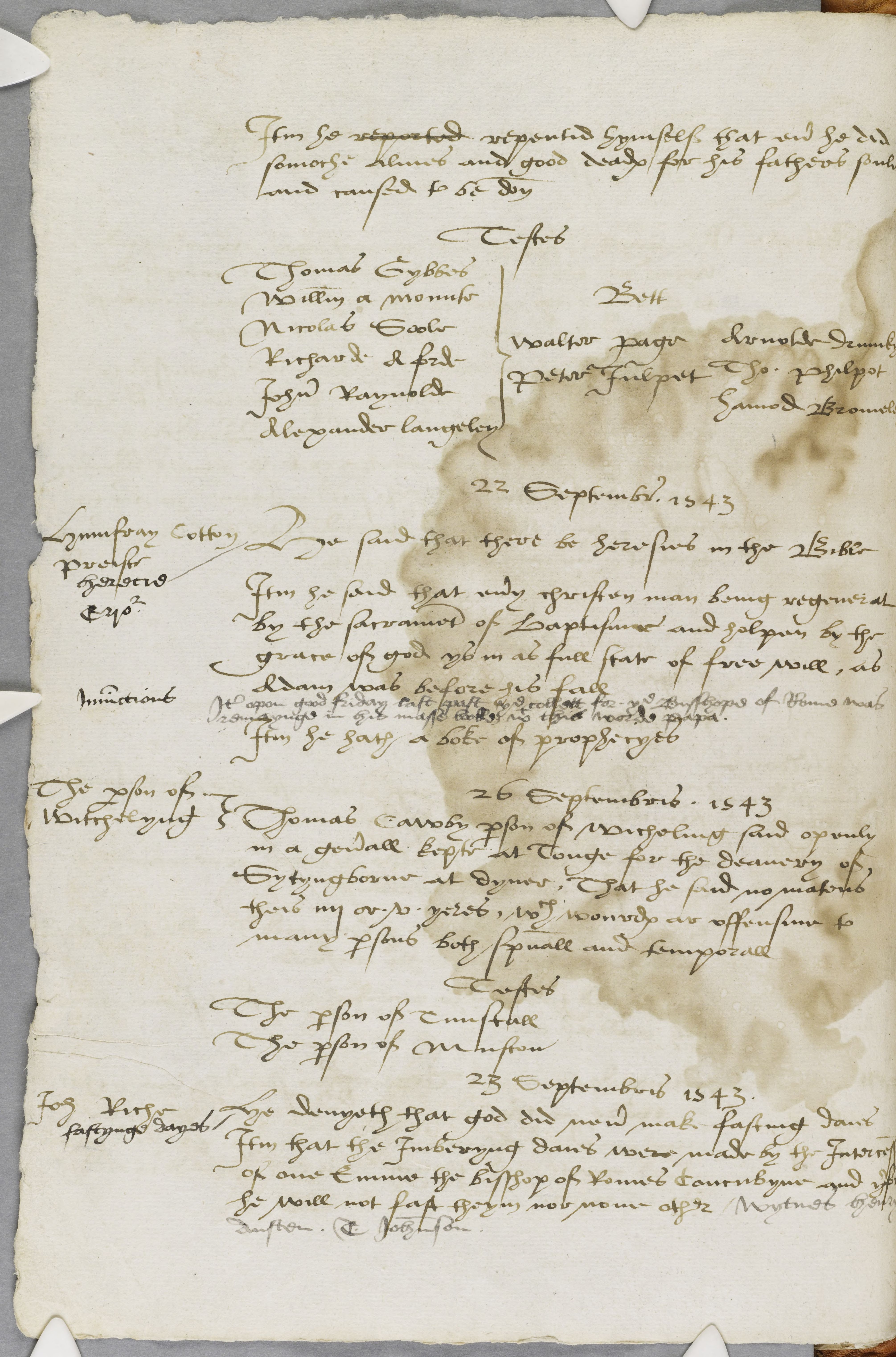 He repented that ever he did so much good deeds for his father's soul. 22 Sept. 1543.Humfray Cotton, priest, "said there be heresies in the Bible" and "that every Christian man being regenerate by the Sacrament of baptism and holpen by the Grace of God is in as full state of free will as Adam was before his fall. (Cr. interlines : "Upon Good Friday last the collect for the Bishop of Rome was remaining in his Mass book, with this word Papa.") He has a book of prophecies. 26 Sept. 1543."Thomas Cawby, parson of Wicheling, said openly in a general (sic) kept at Tonge for the deanery of Sittingbourne at dinner that he said no matins these four or five years; which words are offensive to many persons, both spiritual and temporal." 23 Sept. 1543.John Riche denies that God ever made fasting days. "Item, that the Imberyng days were made by the intercession of one Emme, the Bishop of Rome's concubine, and therefore he will not fast them, nor none other."