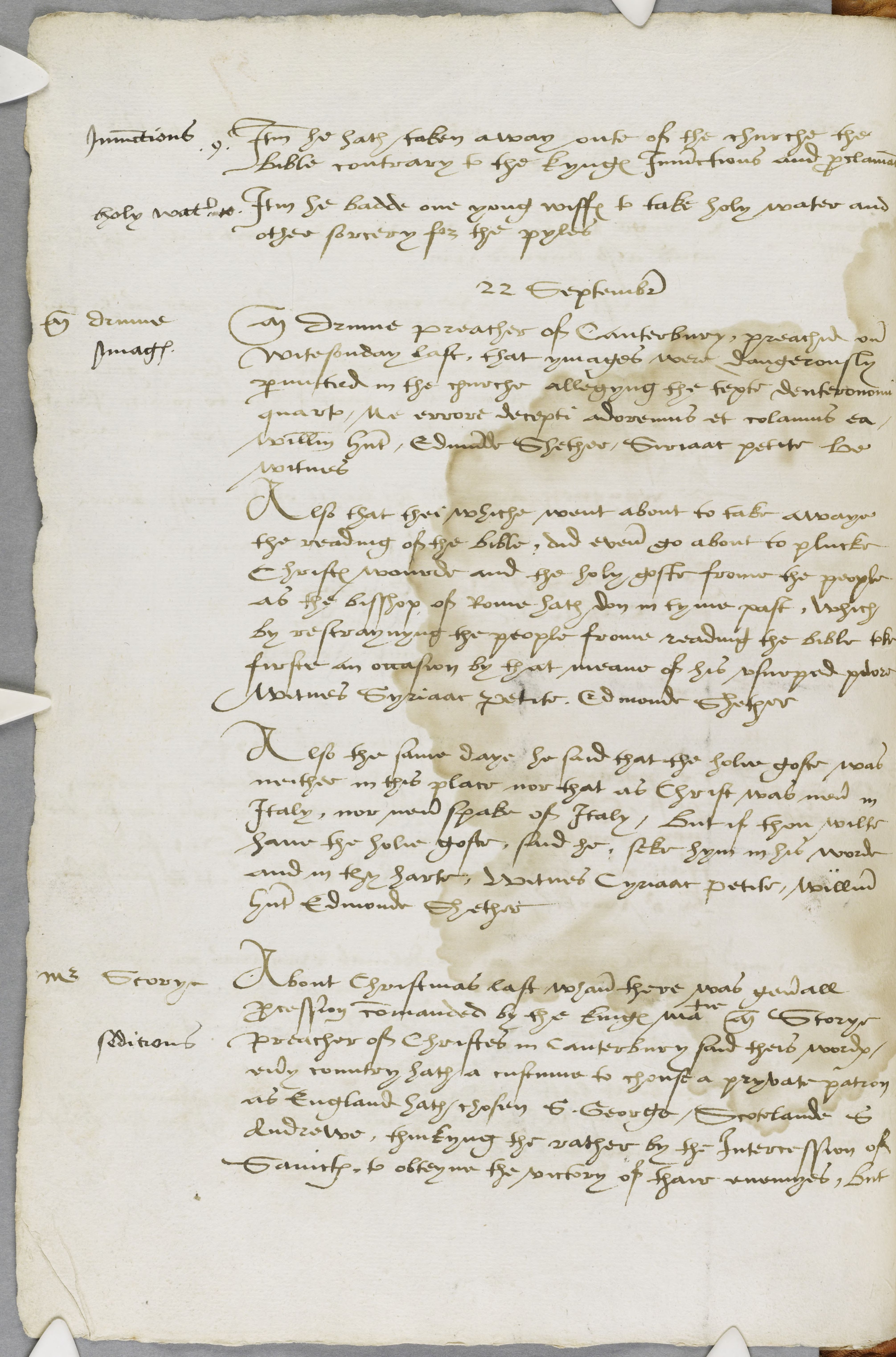 He has taken away the Bible out of the church, contrary to the King's injunctions. He bade one Young wife take holy water and other sorcery for the piles. 22 Sept.Mr. Drumme, preacher of Canterbury, preached on Whitsunday last that images were dangerously permitted in the church, alleging Deut. iv "Ne errore decepti adoremus et colamus ea; also "that they which went about to take away the reading of the Bible did even go about to pluck Christ's words and the Holy Ghost's from the people, as the Bishop of Rome hath done in time past; which, by restraining the people from reading the Bible, took first an occasion by that mean of his usurped power," Also that the Holy Ghost was neither in this or that, &c. (see above). Mr. Scorye. "About Christmas last when there was a general procession commanded by the King, Mr. Scorye, preacher of Christ's [church] in Canterbury, said these words : Every country hath a custom to choose a private patron, as England hath chosen St. George," &c. (see p. 305).