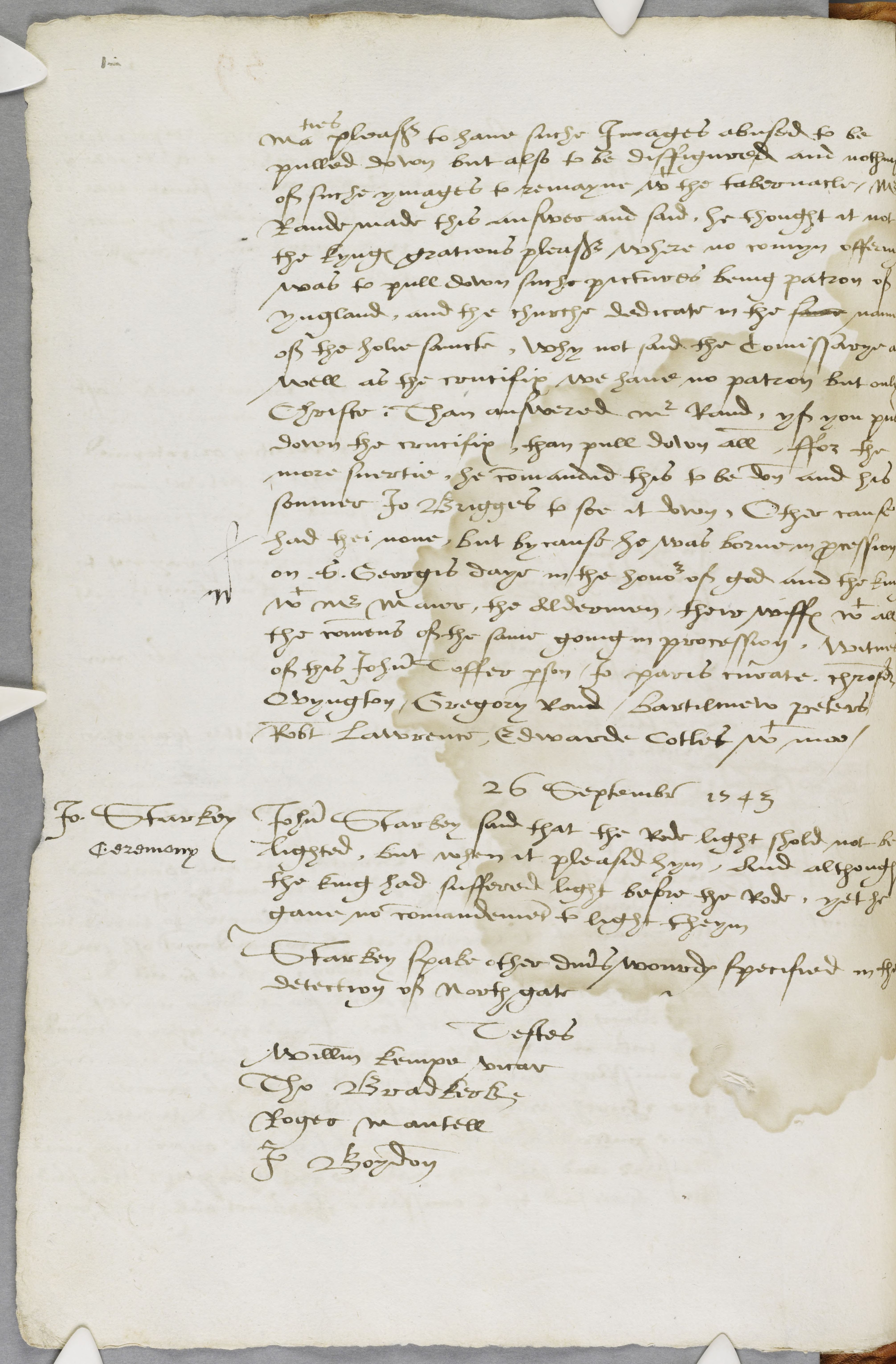 Majesty's pleasure to have such images abused to be pulled down, but also to be disfigured, and nothing of such images to remain, with the tabernacle. Mr. Rande made this answer and said he thought it not the King's gracious pleasure, where no common offering was, to pull down such pictures, being patron of England and the church dedicate in the name of the holy Saint. Why not, said the Commissary, as well as the Crucifix? We have no patron but Christ. Then answered Mr. Rand If you pull down the Crucifix, then pull down all. For the more surety he commanded this to be done, and his sumner, John Brigges, to see it done. Other cause had they none but because he was borne in procession on St. George's day in the honor of God and the King, with Mr. Mayor, the aldermen, their wives, with all the commons of the same going in procession. Witness of this John Toffer, parson, John Paris, curate, Christopher Ovyngton, Gregory Rond, Bartilmew Peters, Robert Lawrence, Edward Cotles, with moo." 26 Sept."John Starkey said that the rood light should not be lighted but when it pleased him, and although the King had suffered light before the rood yet he gave no commandment to light them." "Starkey spake other words specified in the detection of North gate."