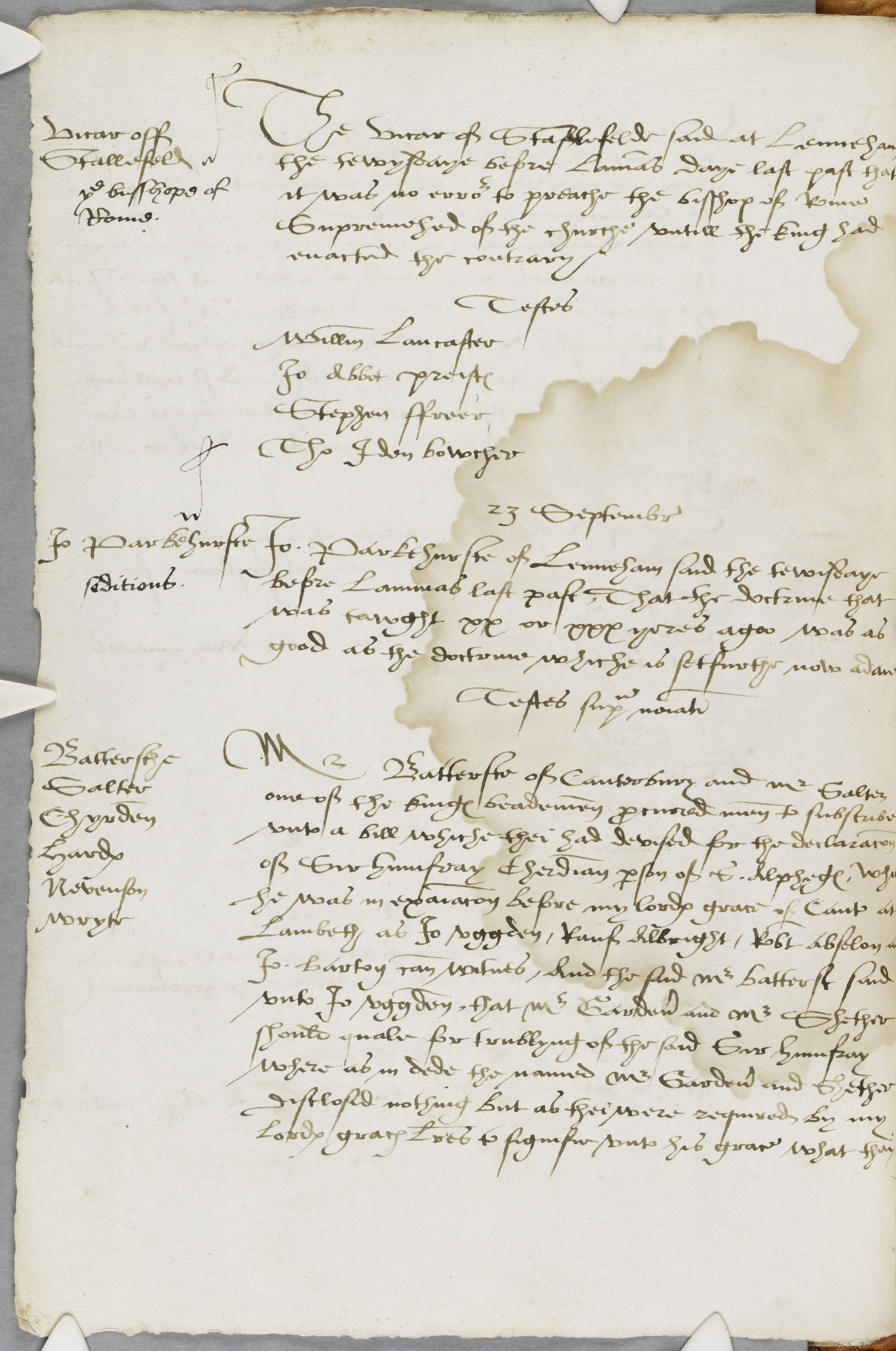 Mr. Batterste of Canterbury and Mr. Salter one of the kinges beademen procured men to subscribe unto a bill whiche thei had devised for the declaracion of Sir humfray Cherdian parson of S. Alpheges, while he was in examinacion before my lordes grace of Canterbury at Lambeth as Jo uggden, Rauf Albright, Robert abselon and John barton cam witnes, And the said Mr. batterst said unto Jo uggden, that Mr Gardener and Mr. Shether should quale for trublyng of the said Sir humfray where as in dede the named Mr. Gardener and Shether disclosid nothing but as thei were required by my lordes graces lettres to signifie unto his grace what they