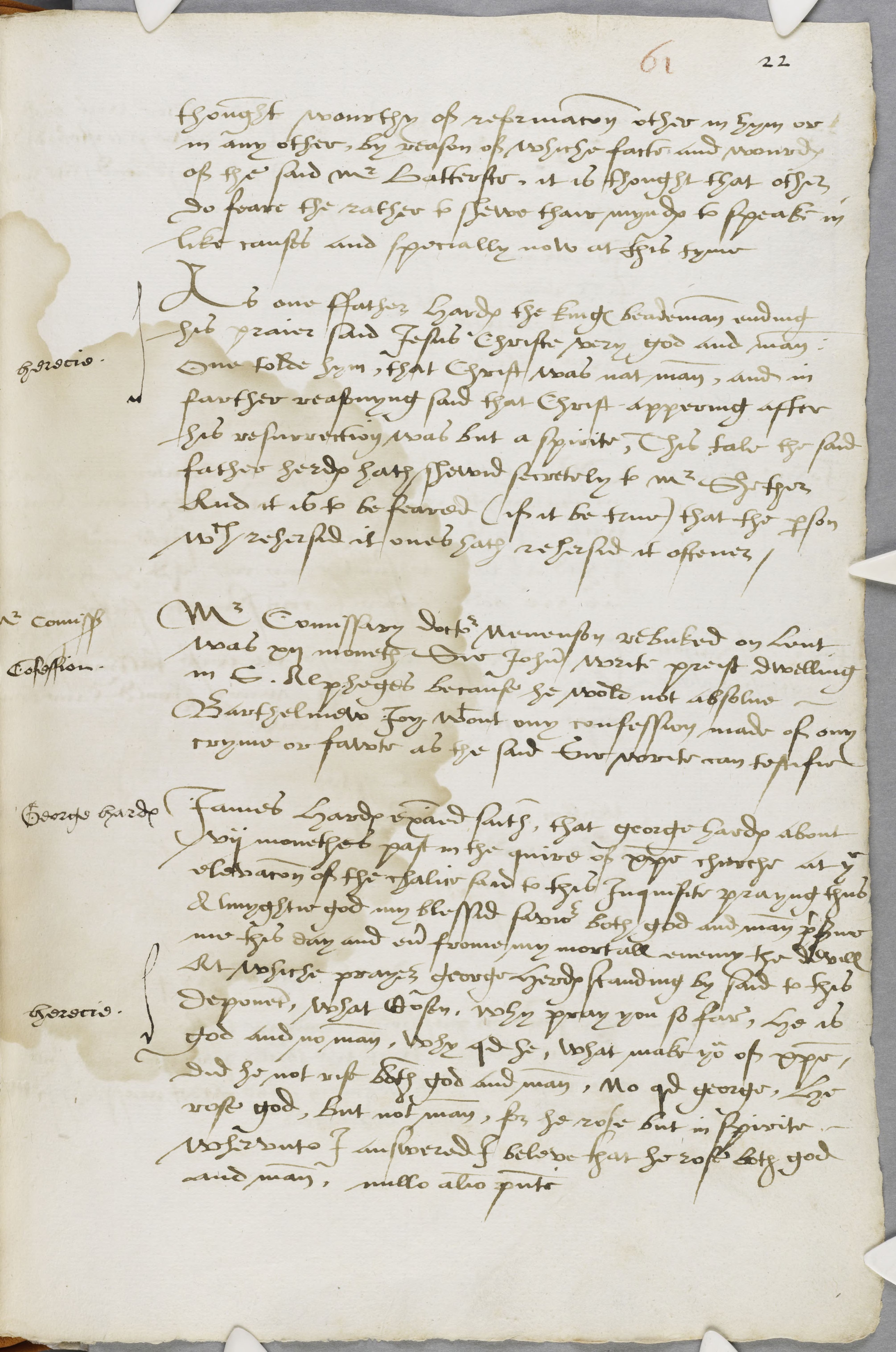 thought worthy of reformation, other in him or in any other; by reason of which fact and words of the said Mr. Batterste it is thought that other do fear the rather to show their minds to speak in like causes, and specially now at this time." "As one Father Hardes, the King's beadman, ending his prayer, said, Jesus Christ very God and man, one told him that Christ was not man, and in further reasoning said that Christ appearing after his resurrection was but a spirit. This tale the said Father Herdes hath showed secretly to Mr. Shether, and it is to be feared (if it be true) that the parson, which rehearsed it once hath rehearsed it oftener." "Mr. Commissary, Dr. Nevenson, rebuked, on Lent was 12 month, Sir John Write, priest, dwelling in St. Alphege's because he would not absolve Barthelmew Joy without any confession made of any crime or fault as the said Sir Write can testify." Jas. Hardes examined says "that George Hardes about 7 months past in the choir of Christchurch at the elevation of the Chalice said to this inquisite praying thus : Almighty God, my blessed Saviour, both God and man, preserve me this day and ever from my mortal enemy the Devil. At which prayer George Herdes, standing by, said to this deponent, What, cousin? Why pray you so far? He is God and no man. Why, quod he, what make you of Christ? Did he not rise, both God and man? No, quod George. He rose God, but not man, for he rose but in Spirit, Whereunto I answered, I believe that he rose both God and man; nullo alio presente."