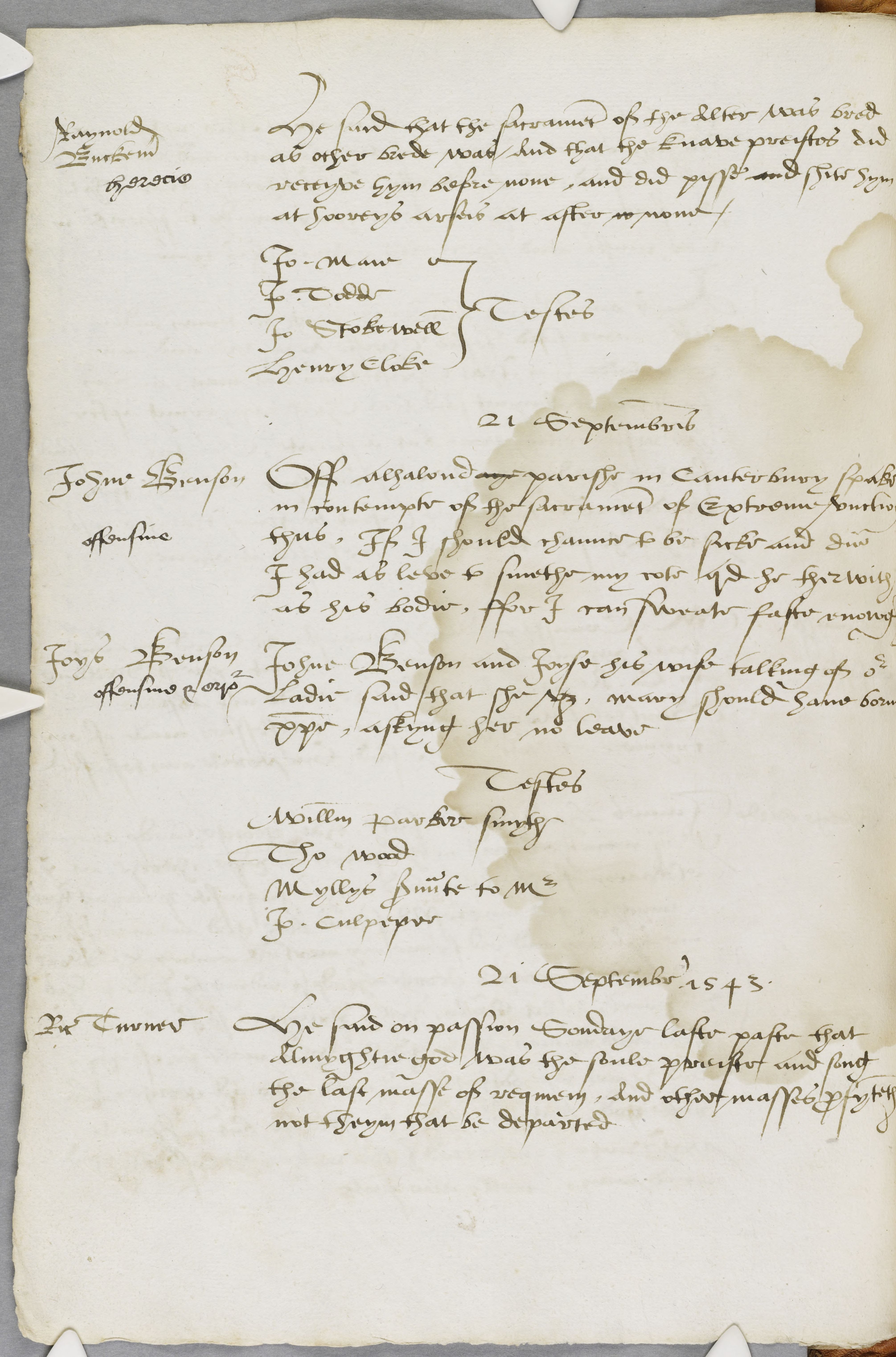 Raymond Buckemer said "that the Sacrament of the Altar was bread as other bread was, and that the knave priests did receive him before noon and did piss and shit him at hooreys arses at afternoon." 21 Sept.John Benson of Alhalond parish in Canterbury "spake in contempt of the Sacrament of extreme unction thus : If I should chance to be sick and die I had as leve to smethe my cote, quod he, therewith as his body; for I can sweat fast enough." "John Benson and Joyse his wife talking of Our Lady said that she, viz. Mary, should have borne Christ asking her no leave." 21 Sept. 1543.Ric. Turner said on Passion Sunday that Almighty God was the soul priest and sung the last mass of requiem, and other masses profiteth not them that be departed.