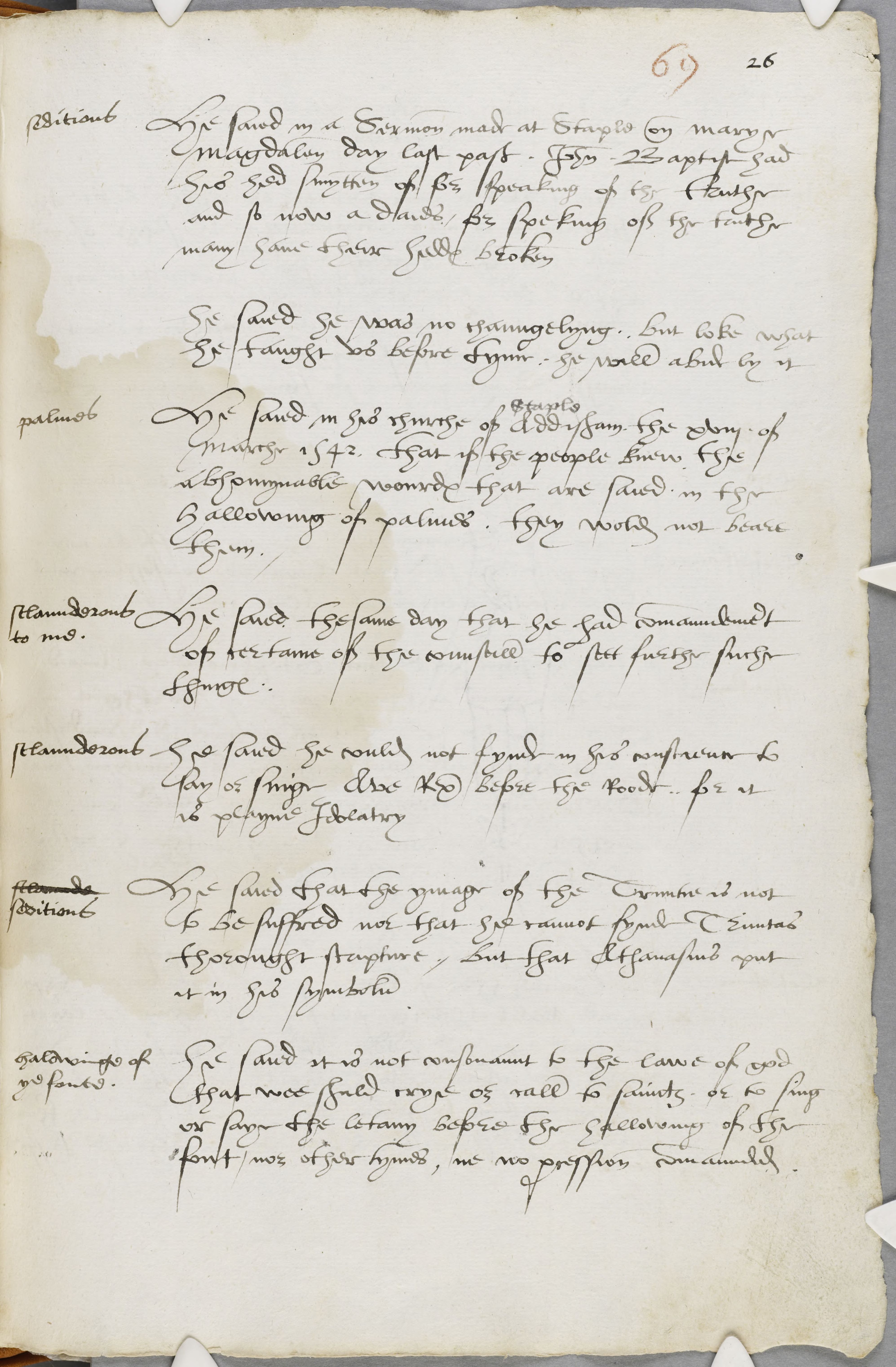 He said in a sermon at Staple on Mary Magdalen's day : "John Baptist had his head smitten off for speaking of the truth; and so, nowadays, for speaking of the truth, many have their heads broken." He said he was no changeling but would abide by what he said. He said in his ch. of Addisham (Cr. has written "Staple" over) 18 March, 1542, that if the people knew what abominable words are said in the hallowing of palms, they would not bear them; also, that he had commandment of certain of the Council to set forth such things; that he could not find in his conscience to say or sing Ave Rex before the rood, for it was plain idolatry; that the image of the Trinity is not to be suffered and he cannot find Trinitas throughout Scripture, but that Athanasius put it in his Symbolum; that it is not consonant to the law of God that we should cry or call to Saints, or sing or say the litany before the hallowing of the font, "nor other times, ne no procession commanded."