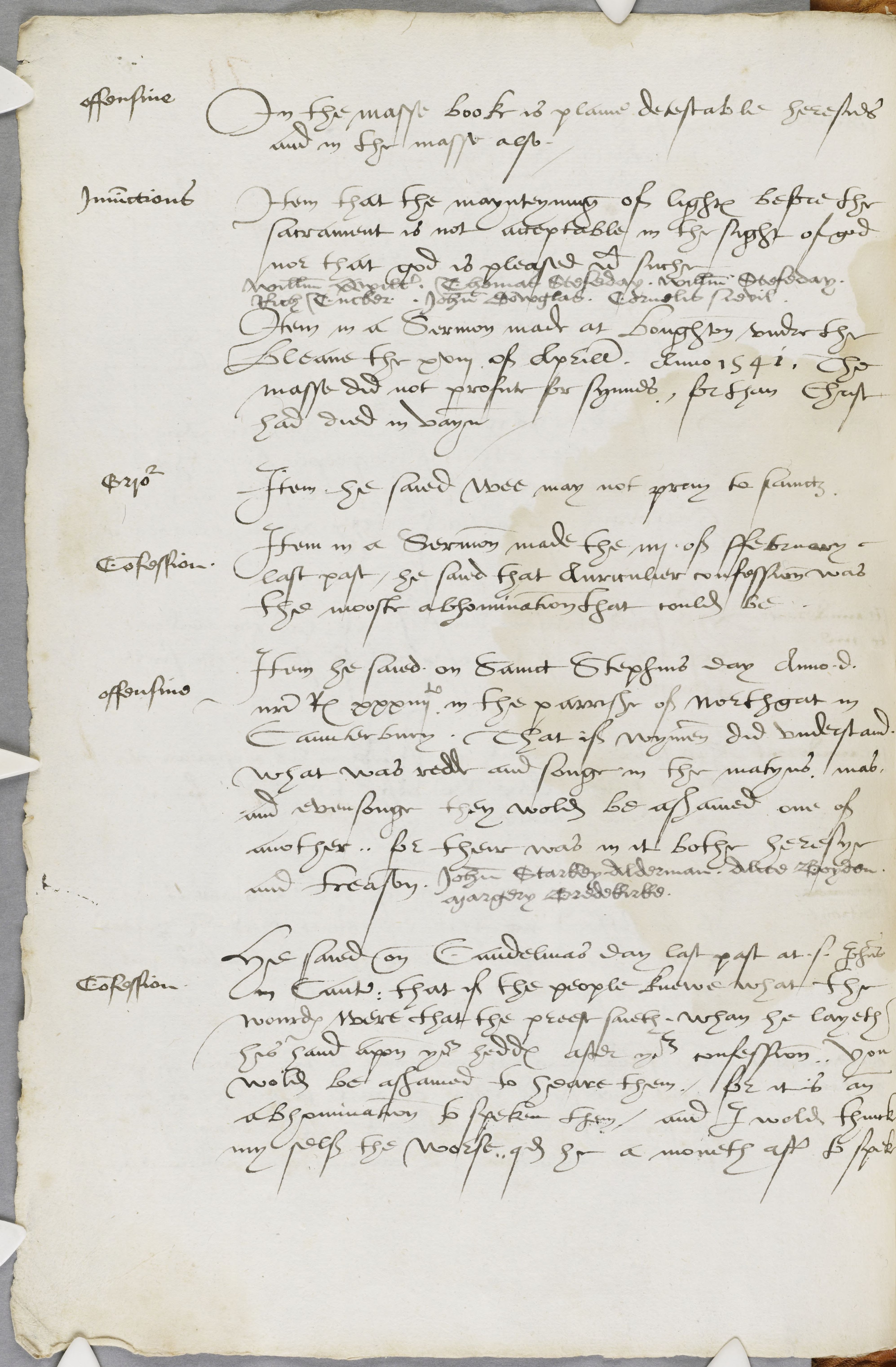 Item he saied on Sainct Stephins day Anno domino nostro Regis xxxiiiito in the parrishe of northgat in Caunterbury. That if wymen did understand what was redde and songe in the matyns. mas, and evensonge they wold be ashamed one of another: for their was in it bothe heresye and treason. John Starkey Alderman. Alice Boydon. Margery Bredekirke.