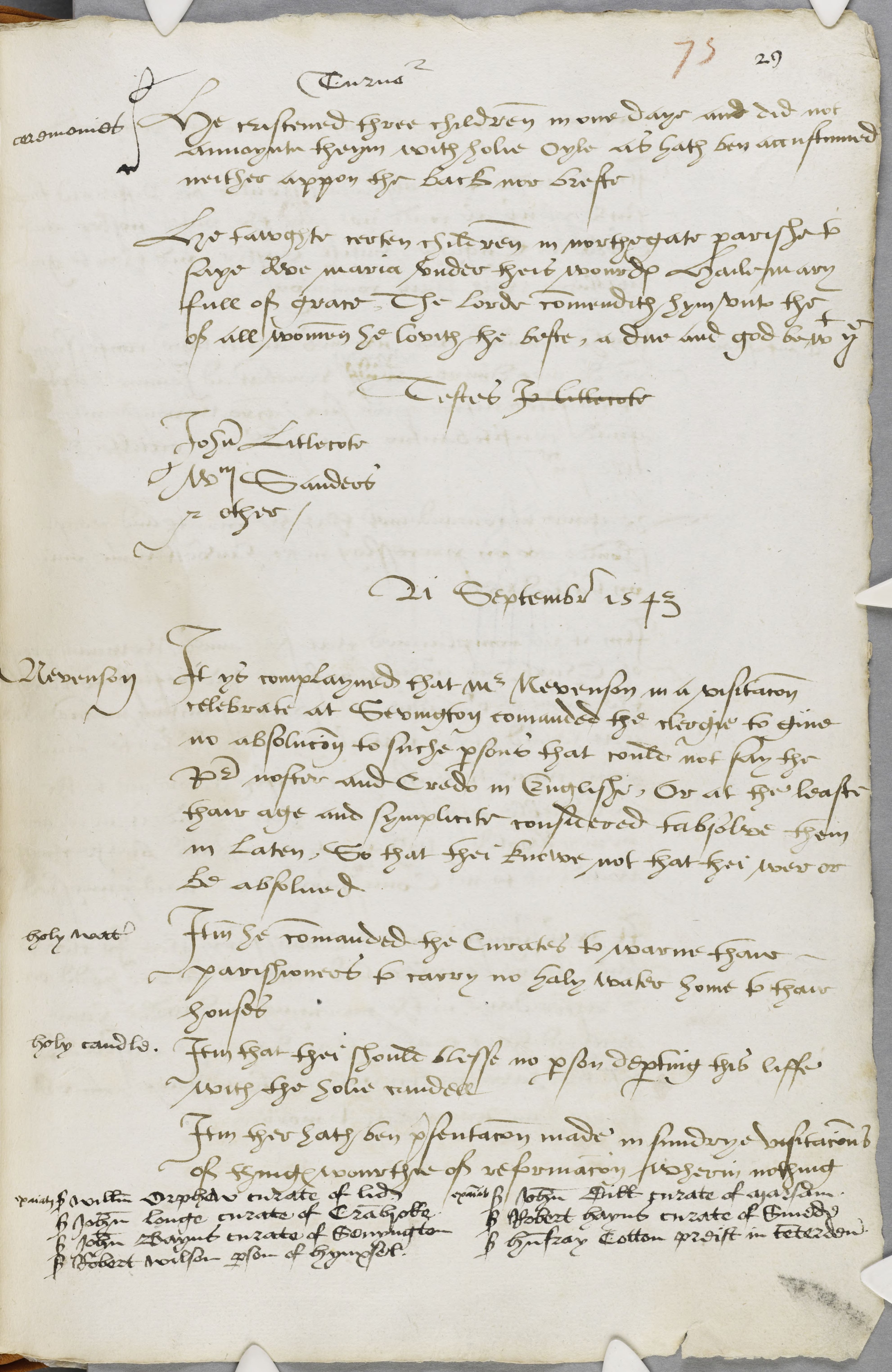 It ys complayned that Mr. Nevenson in a visitacion celebrate at Sevington comanded the clergie to give no absolucion to suche persons that could not say the pater noster and Credo in Englishe, Or a the leaste thair age and symplicite considered tabsolve them in Laten, So that thei knowe not that thei wer or be absolved