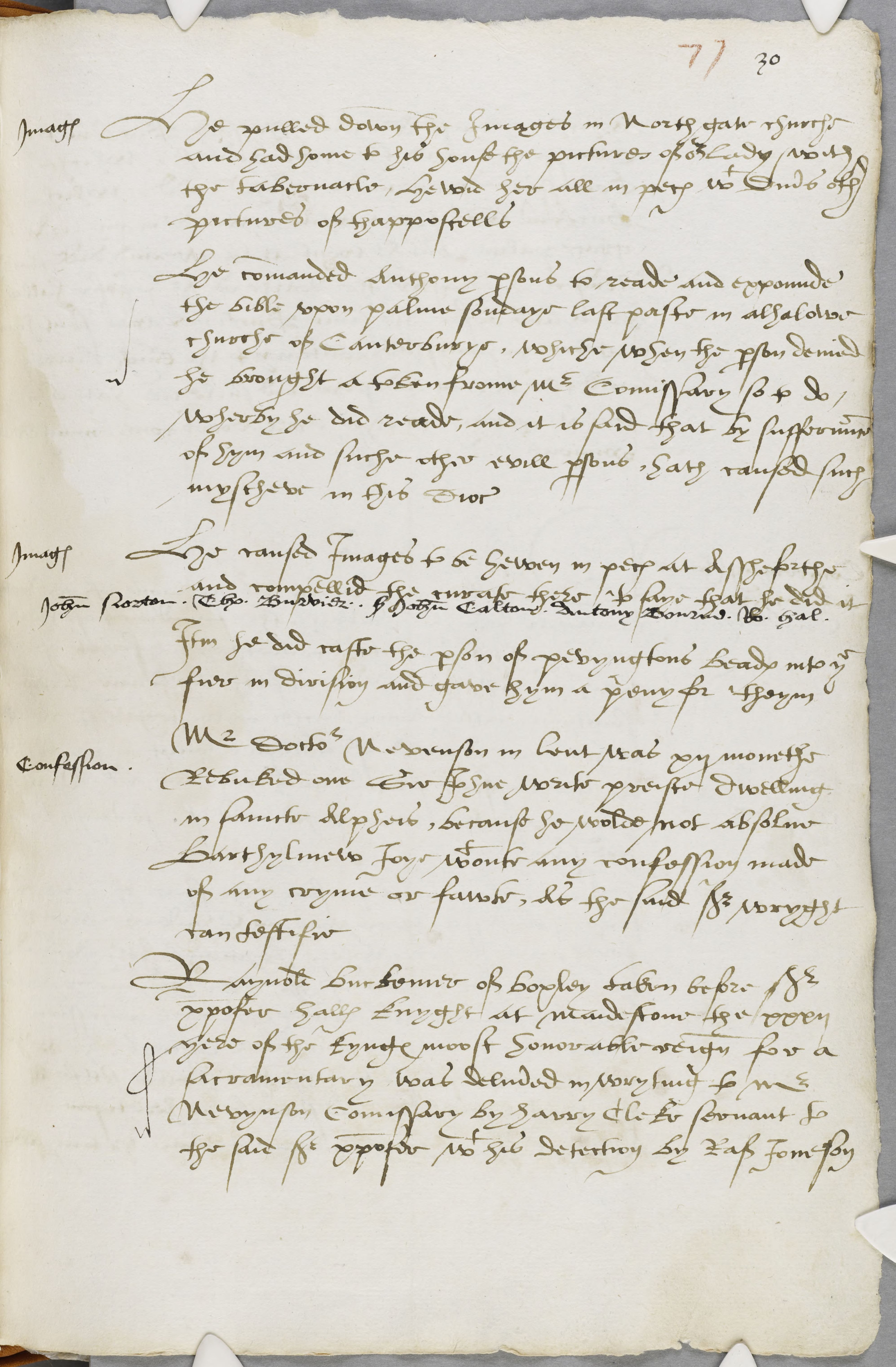 He pulled down the images in Northgate ch., and had home to his house the pictures of Our Lady with the tabernacle, and hewed her all in pieces, with other pictures of the Apostles. He commanded Anth. Persons to read and expound the Bible on Palm Sunday in All Hallows' ch. Canterbury; which when the parson refused, he brought a token from Mr. Commissary so to do; "whereby he did read, and it is said that by sufferance of him and such other evil persons, hath caused such mischief in this diocese." He caused images to be hewn in pieces at Ashford and compelled the curate to say he did it. He cast the parson of Pevyngton's beads into the fire in derision and gave him a penny for them. "Dr. Nevinson in Lent was 12 month rebuked one Sir John Write, priest dwelling in St. Alpheis, because he would not absolve Bartylmew Joye without any confession made of any crime or fault." Raynold Buckemer of Boxley taken before Sir Chr. Halles, knt., at Maidstone 32 H. VIII. for a sacramentary "was delivered in writing to Mr. Nevinson, Commissary, by Harry Cleke, servant to the said Sir Christopher, with his detection by Raf Joneson;