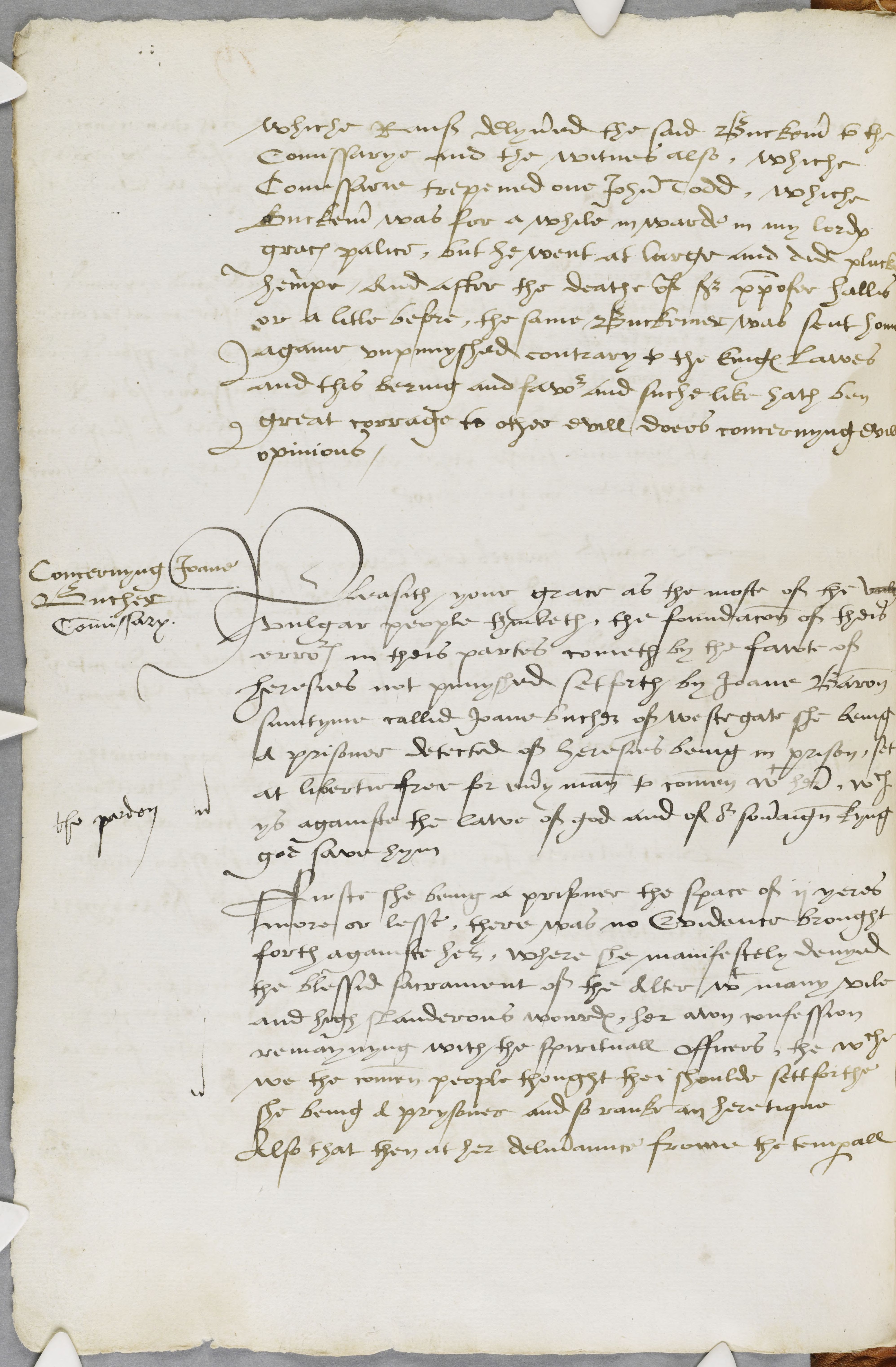 "Pleaseth your Grace, most of the vulgar people think the foundation of these errors in these parts cometh by the fault of heresies not punished set forth by Joan Baron, sometime called Joan Bucher of Westgate, she being a prisoner detect of heresies, being in prison, set at liberty, free for any man to common with her, which is against the law of God and of our Sovereign King." 1. She being a prisoner for 2 years, more or less, no evidence was brought against her, though she manifestly denied the Sacrament of the Altar with many slanderous words, her own confession remaining with the spiritual officers. 2. When delivered by the temporal