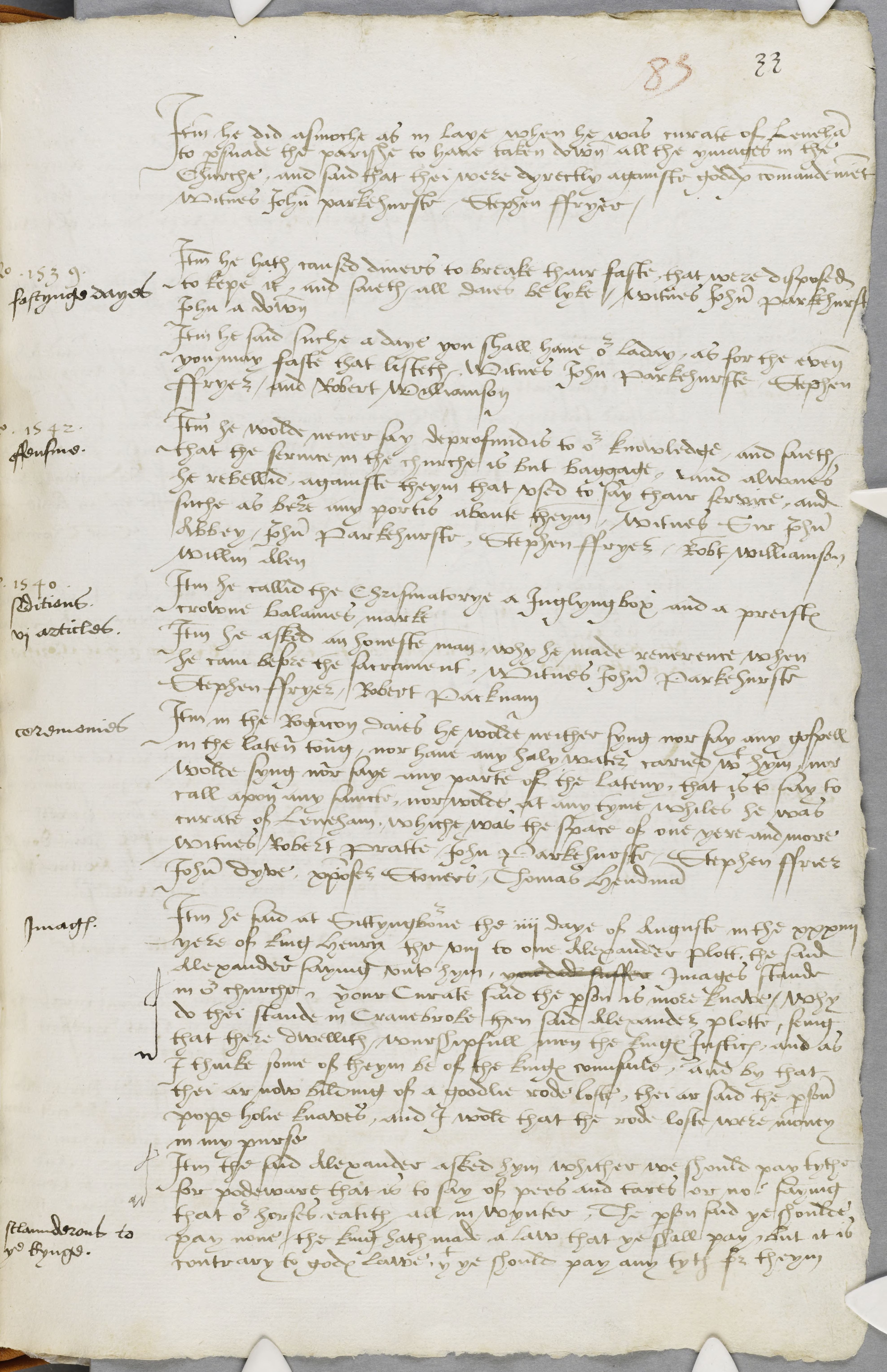 Item he asked an honeste man, why he made reverence when he cam before the sacrament, Witnes John Parkehurste Stephen ffryer / Robert Packnam