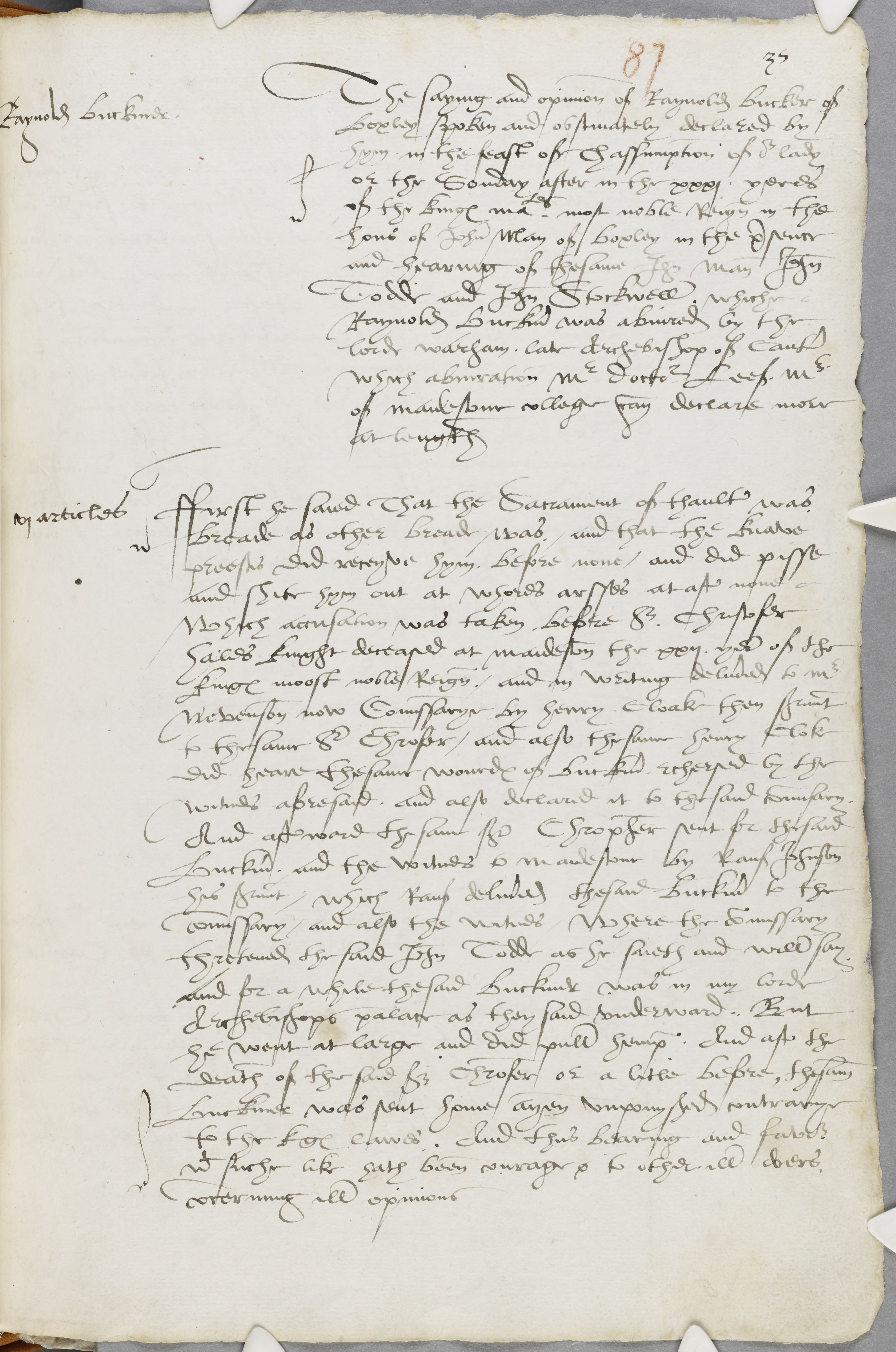 The saying and opinion of Raynold Bucker of Boxley spoken and obstinately declared by hym in the feast of thassumption of our lady or the Sonday after in the xxxi yeres of the kinges majestes most noble Reign in the hous of John May of Boxley in the presence and hearing of thesame John Man John Todd and John Stockwell. whiche Raynold Buckmer was abjured by the lorde warham. late Archebishop of Canterbury which abjuration Mr. Doctour Leef, Mr. of maidestone college can declare more at length