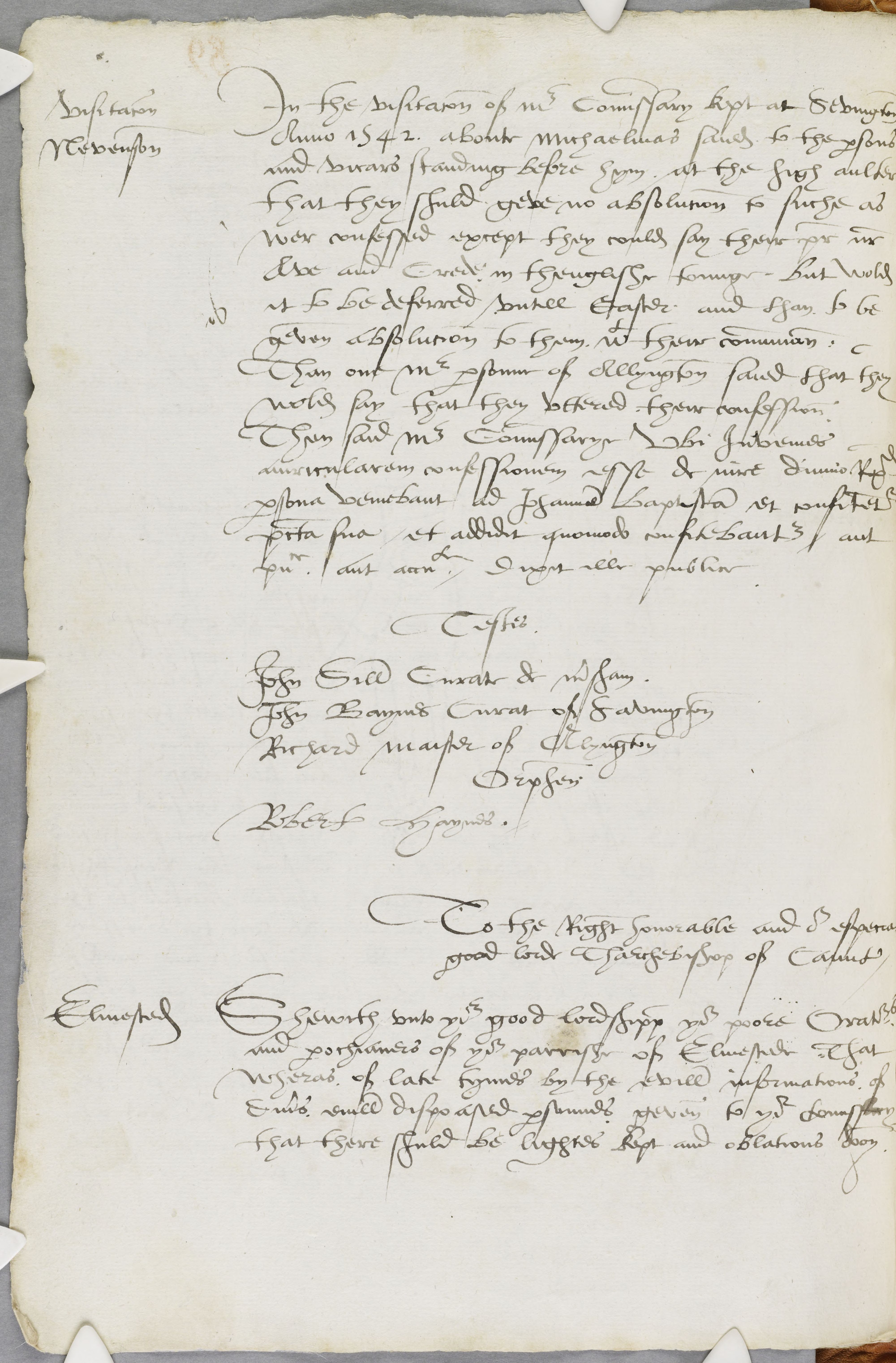 "In the visitation of Mr. Commissary kept at Sevington, Anno 1542, about Michaelmas, said to the said parsons and vicars standing before him at the high altar that they should give no absolution to such as were confessed except they could say their Paternoster, Ave and Creed in the English tongue, but would it be deferred until Easter and then to be given absolution to them with their Communion. Then one Mr. Parson of Allington (fn. 32) said that they would say that they uttered their confession. Then said Mr. Commissary Ubi invenies auricularem confessionem esse de jure divino? Respondit persona Venicbant ad Johannem Baptistam et confitentur peccata sua. Et addidit, Qomodo confitebantur, aut publice aut accurate? Dixit ille Publice." (NOTE:Summarized)Petition to Cranmer from the parishioners of Elmestede, representing that malicious and untrue information had been given to his Commissary that lights were kept and oblations done