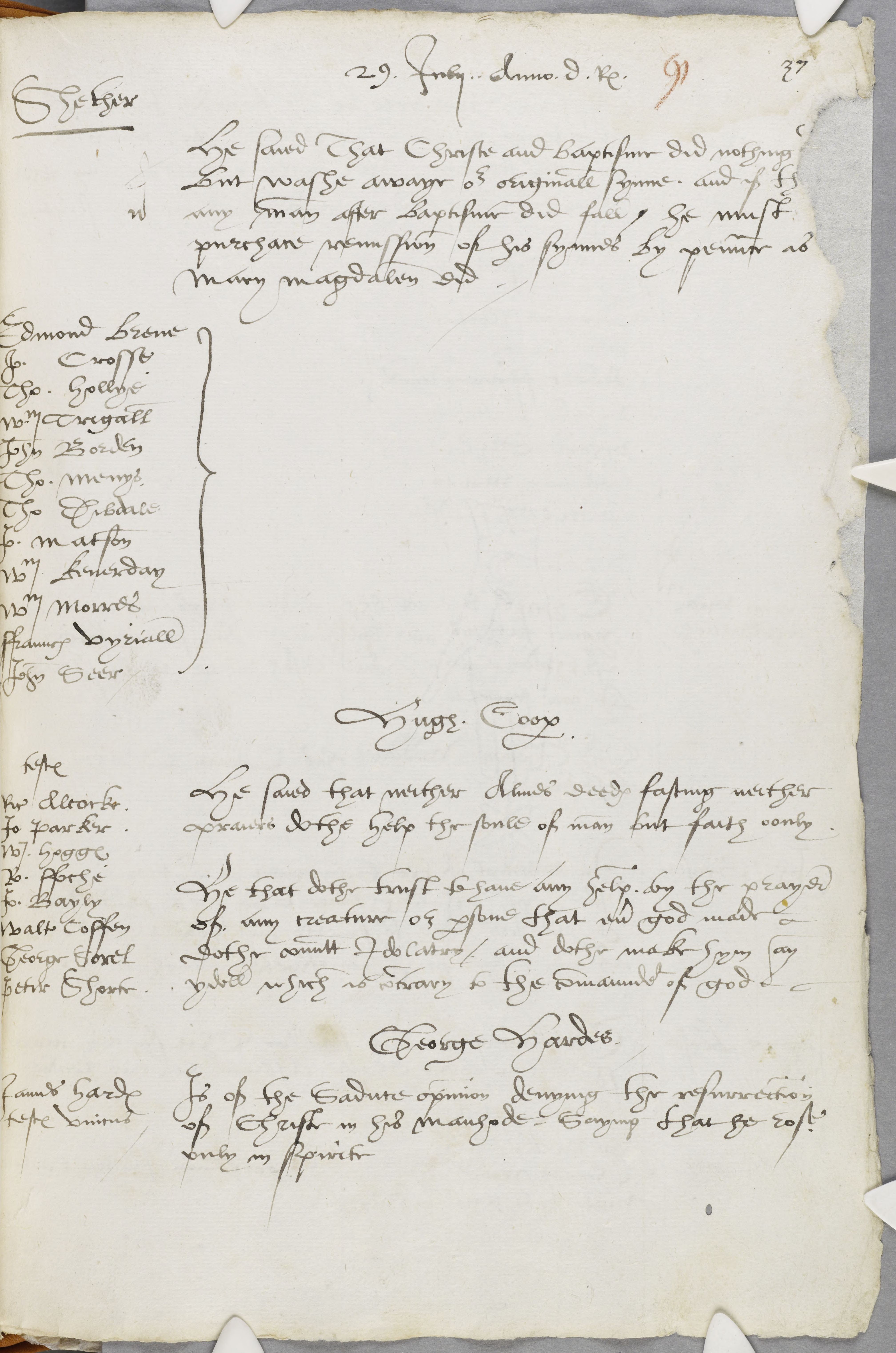 29 July.Shether. "That Christ and baptism did nothing [else] (fn. 32) but wash away our original sin, and if th[at] (fn. 33) any man after baptism did fall, he must purchase remission of his sins by penance as Mary Magdalene did." 12 witnesses. Hugh Cooper. That neither alms deeds, fasting nor prayer helped the soul of man, but faith only; that he that trusts to be helped by the prayer of any creature or person that ever God made doth commit idolatry. Eight witnesses. George Hardes "is of the Sadducee opinion, denying the resurrection of Christ in his manhood, saying, that He rose only in the Spirit." Jas. Hardes, only witness.