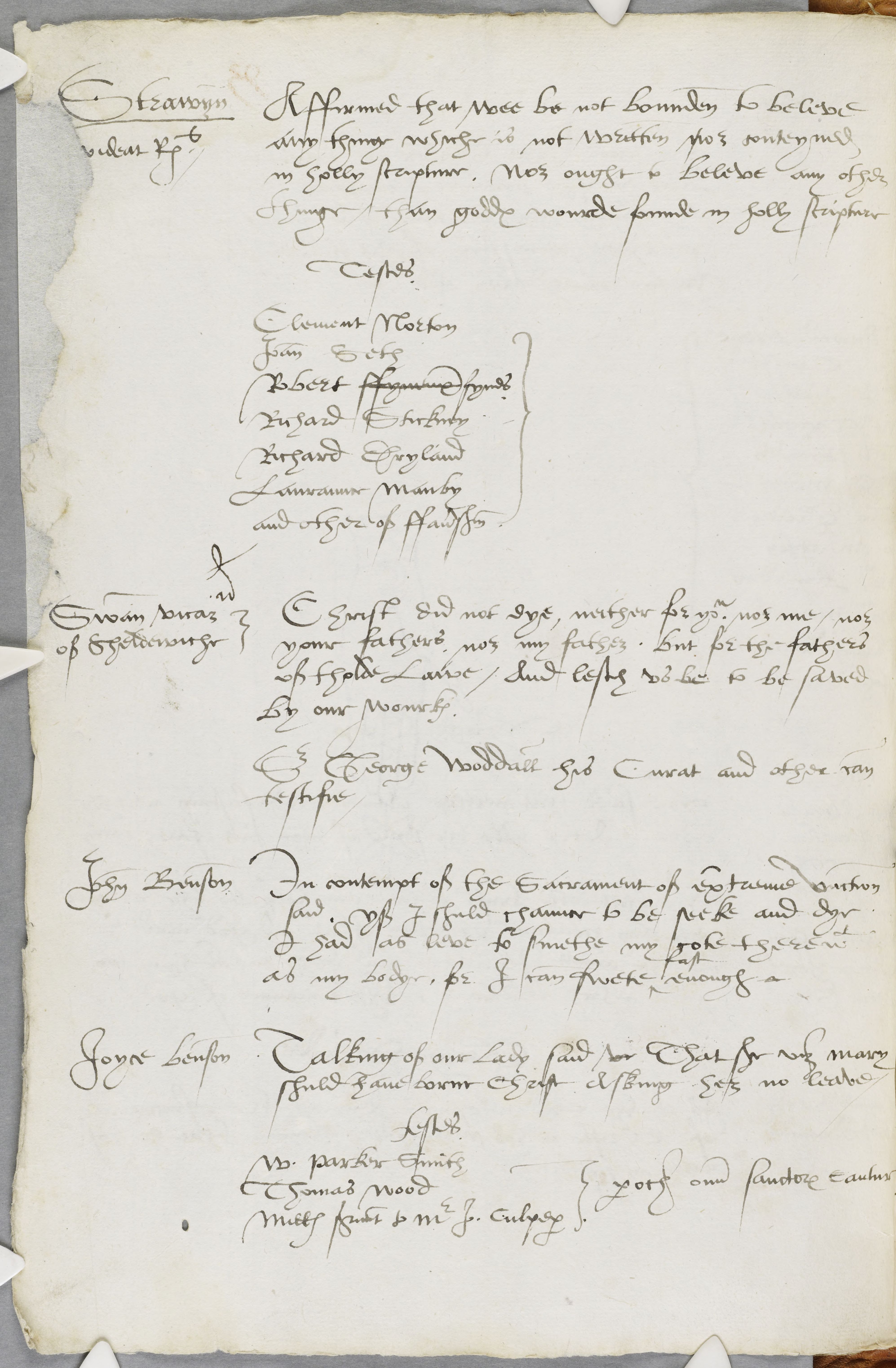 Strawyn "affirmed that we be not bounden to believe anything which is not written or contained in the Holy Scripture; nor ought to believe any other thing than God's word found in Holy Scripture." Six witnesses named "and other of Faversham." Swan, vicar of Sheldewiche. "Christ did not die, neither for you nor me, nor your father, nor my father, but for the fathers of the Old Law, and left us to be saved by our works." Ws. : "Sir Geo. Woddall his curate and other can testify." John Benson, "in contempt of the Sacrament of extreme unction, said If I should chance to be sick and die I had as leve to smethe my coat therewith as my body, for I can sweat fast enough." Joyce Benson, "talking of Our Lady, said that she, viz. Mary, should have borne Christ, asking her no leave." Three witnesses of the parish of All Saints, Canterbury, including Milles, servant to Mr. J. Culpeper.