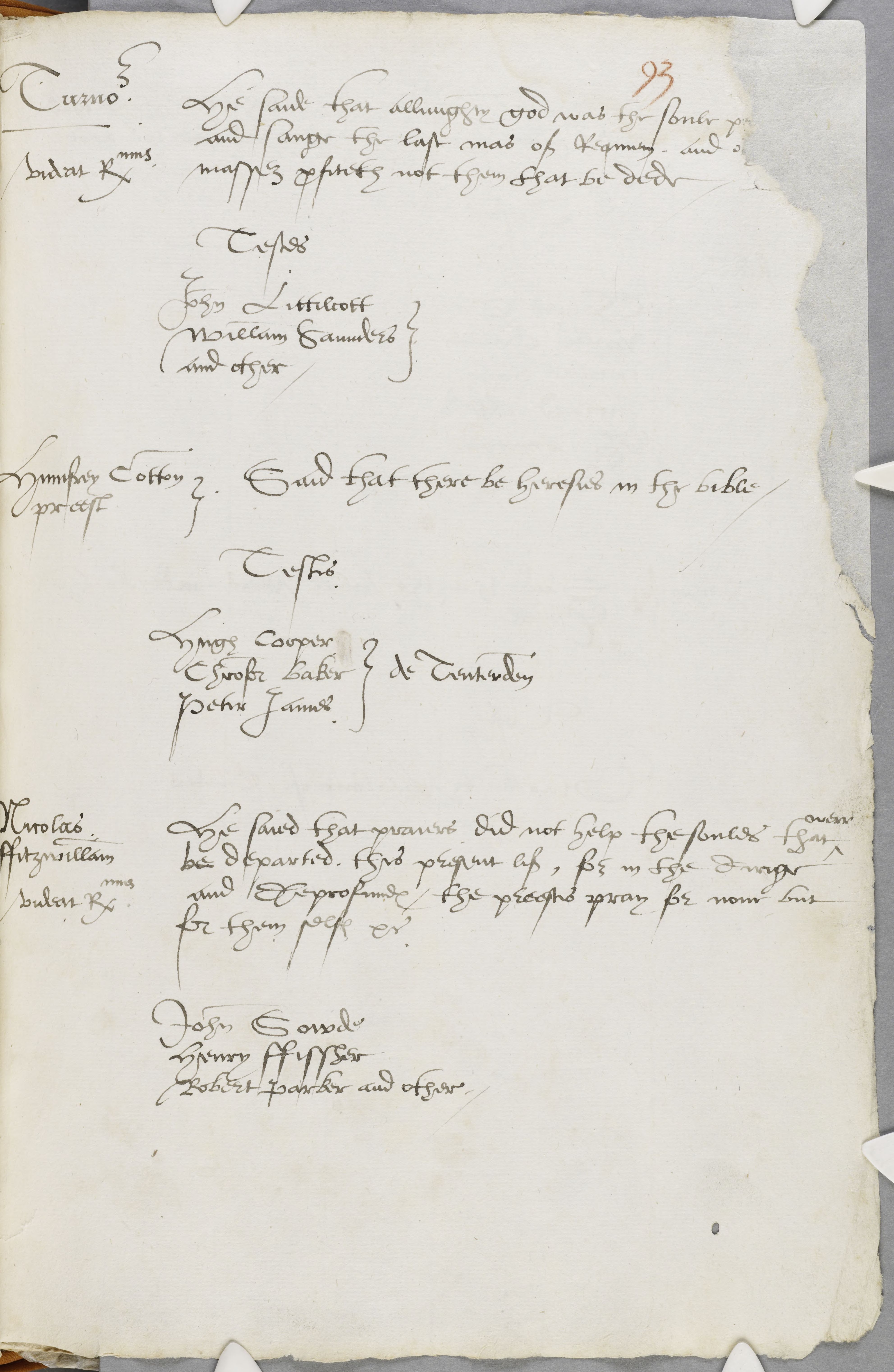 Turnour said "that Almighty God was the soul pr[iest], (fn. 34) and sang the last mass of requiem, and o[ther] (fn. 34) masses profiteth not them that be dead." 2 Ws. "and other." Humfrey Cotton, priest, "said that there be heresies in the Bible." 3 Ws. of Tenterden. Nicholas Fitzwilliam "said that prayers did not help the souls that were departed this present life, for in the dirige and de profundis the priests pray for none but for themselves, &c." 3 Ws. (Under Fitzwilliam's name is written in the same hand "Videat Reverendissimus").