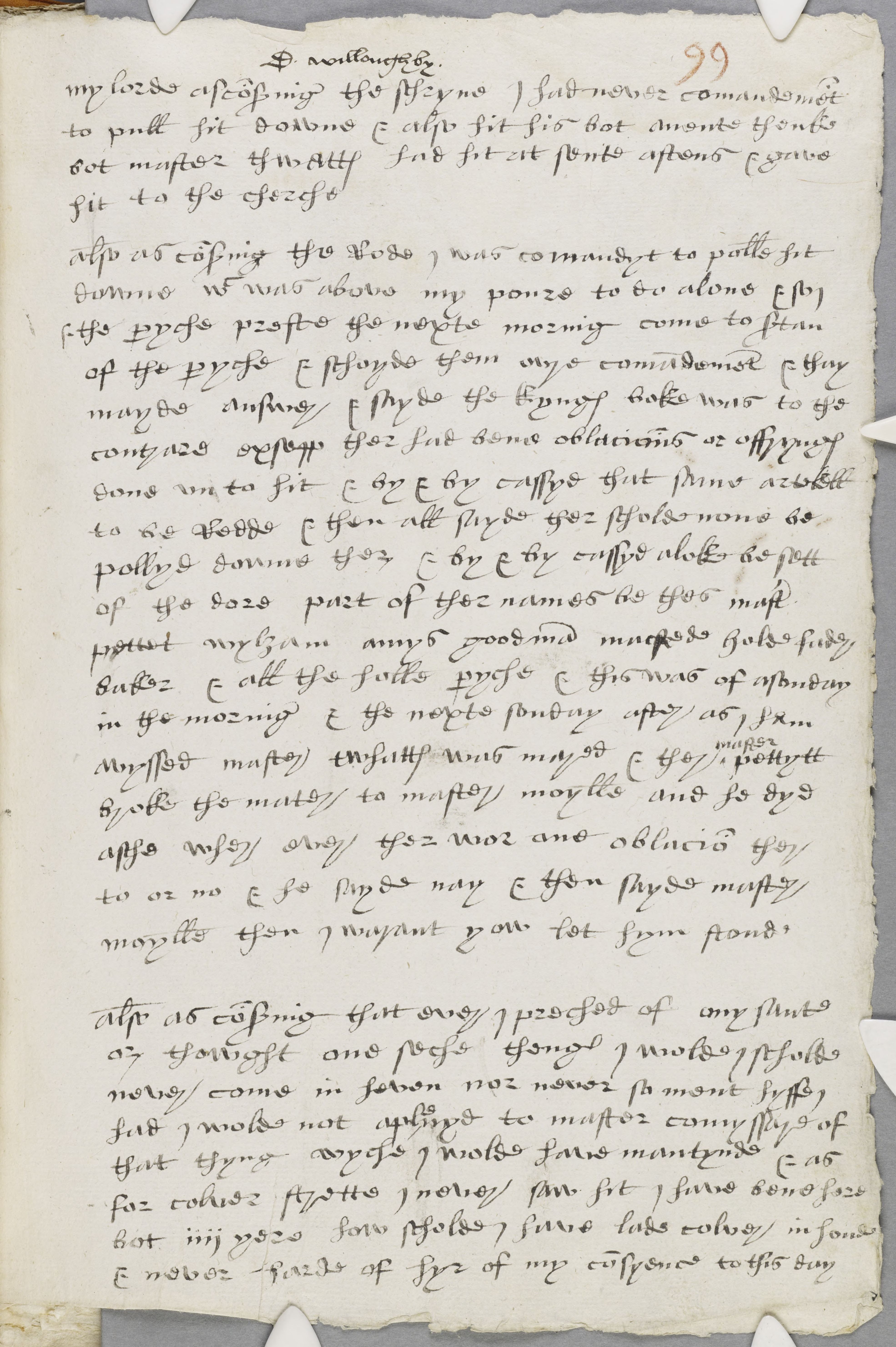 also as consernig the Rode I was comandyt to polle hit downe which was above my poure to do alone & so I & the paryche preste the nexte mornig come to sertan of the paryche & schoyde them oure comandement & thay mayde answer & sayde the kynges boke was to the contrare exsepp ther had bene oblacions or offrynges done un to hit & by & by cassyd that same artekell to be Redde & then all sayde ther scholde none be pollyd downe ther & by & by cassyd aloke be sett of the dore part of ther names be thes master pettet wylzam amys goodman macsede holde fader baker & all the holle paryche & this was of asonday in the mornig & the nexte sonday after as I ham avyssed master twhattes was mared & ther master pettytt broke the mater to master moylle and he dyd asche where ever there wor one oblacion ther to or no & he sayde nay & then sayde master moylle then I warrant you let hym stonde