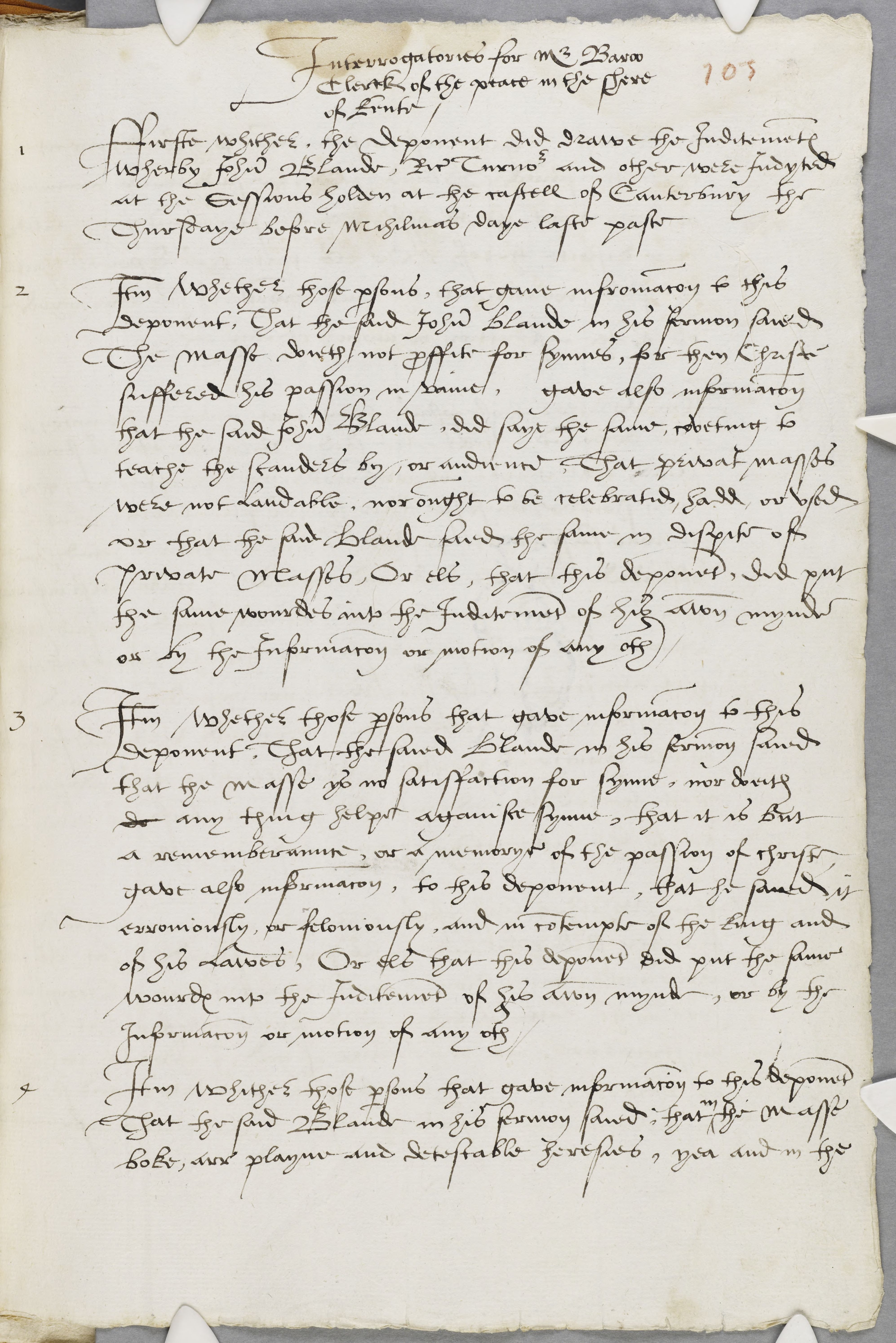 (NOTE: Summarized) XII. Interrogatories for Mr. Baroo, clerk of the peace in Kent. 1. Whether he drew the indictments against John Blande, Ric. Turnour and others indicted at Canterbury castle on Thursday before Michaelmas last. 2. Whether those persons who informed him that the said John Blande in his sermon said "The mass doth not profit for sins, for then Christ suffered his Passion in vain" gave also information that he wished to teach his audience that private masses were not laudable, &c., or whether deponent put words to that effect into the indictment, of his own mind or at the suggestion of others. 3. Whether those who accused Blande of saying in his sermon that the mass is no satisfaction for sin and only a remembrance of the Passion of Christ informed him also that he said it in contempt of the King's laws, or deponent put this into the indictment of his own mind, &c. 4. Whether those who accused him of saying that there were plain and detestable heresies in the mass book, yea, and in the