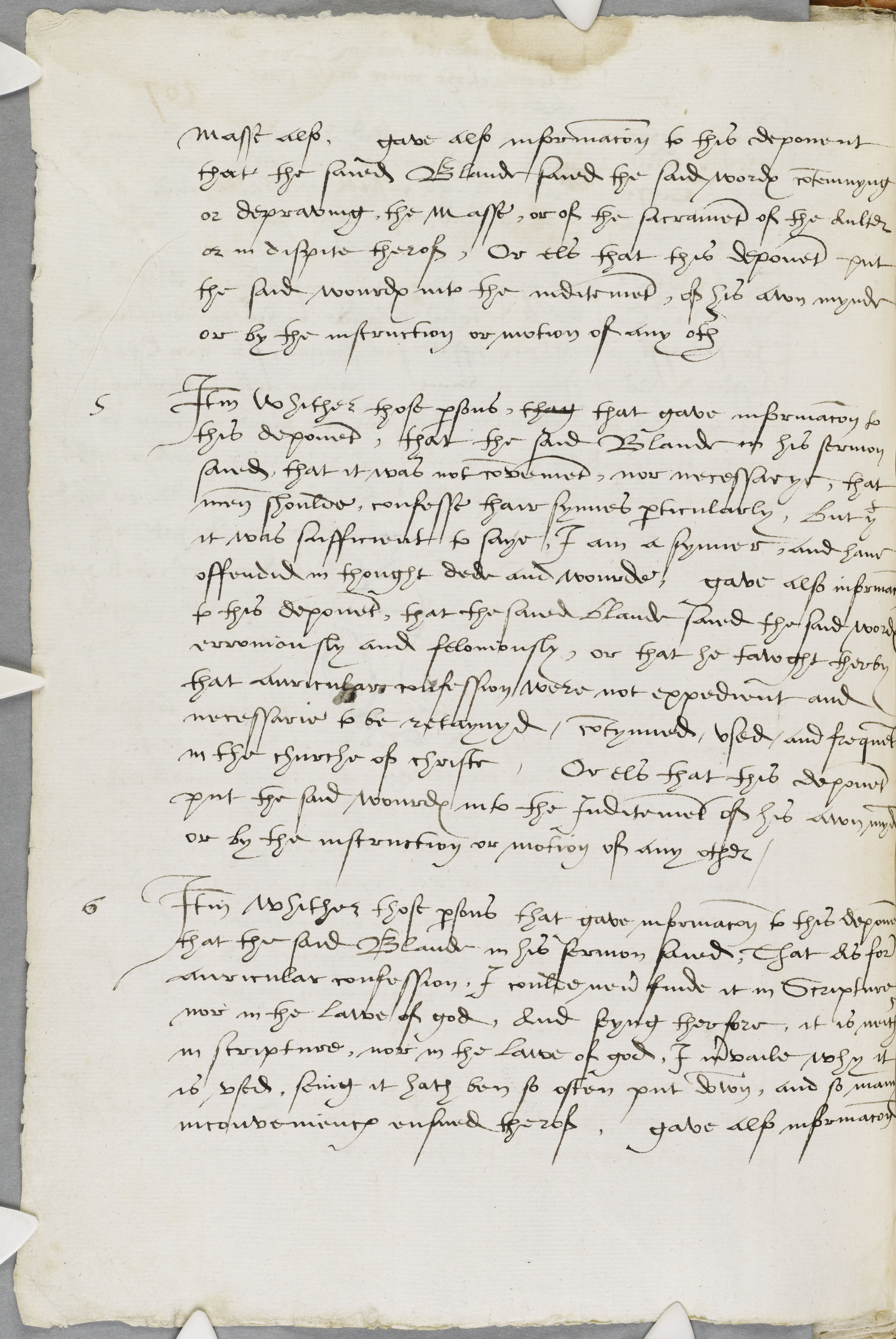 masse also, gave also informacion to this deponent that the saied Blande saied the said wordes conteinyng or depraving, the Masse, or of the sacrament of the Aulter or in dispite therof, Or els that this deponent put the said wourdes into the inditement, of his awn mynde or by the instruction or motion of any other