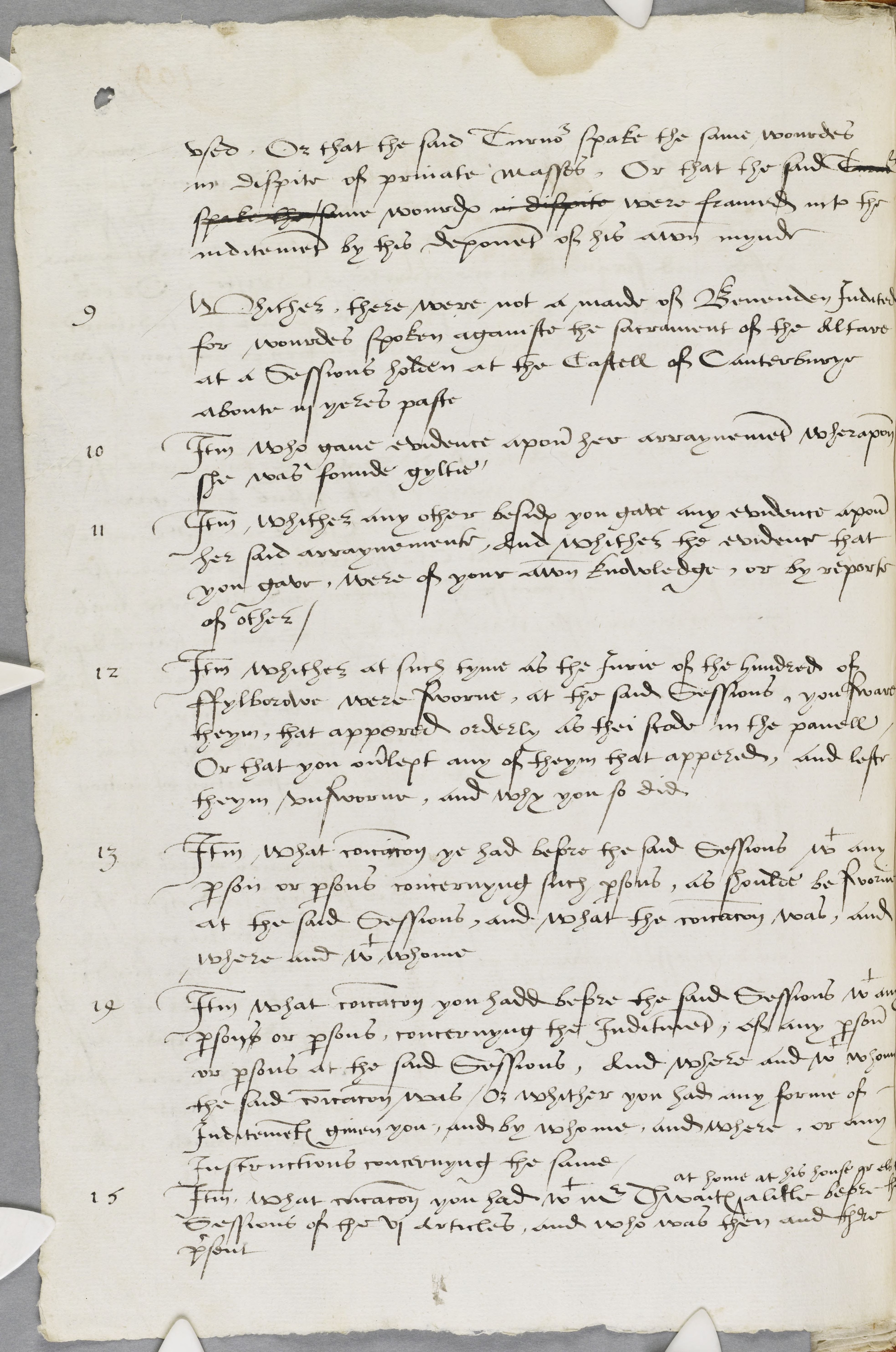 Item what communicacion you hadd before the said Sessions with any persons or persons, concernyng the Inditement, of any person or persons at the said Sessions, And where and with whome the said communicacion was / Or whither you had any forme of Inditementes given you, and by whome, and where, or any Instructions concernyng the same /