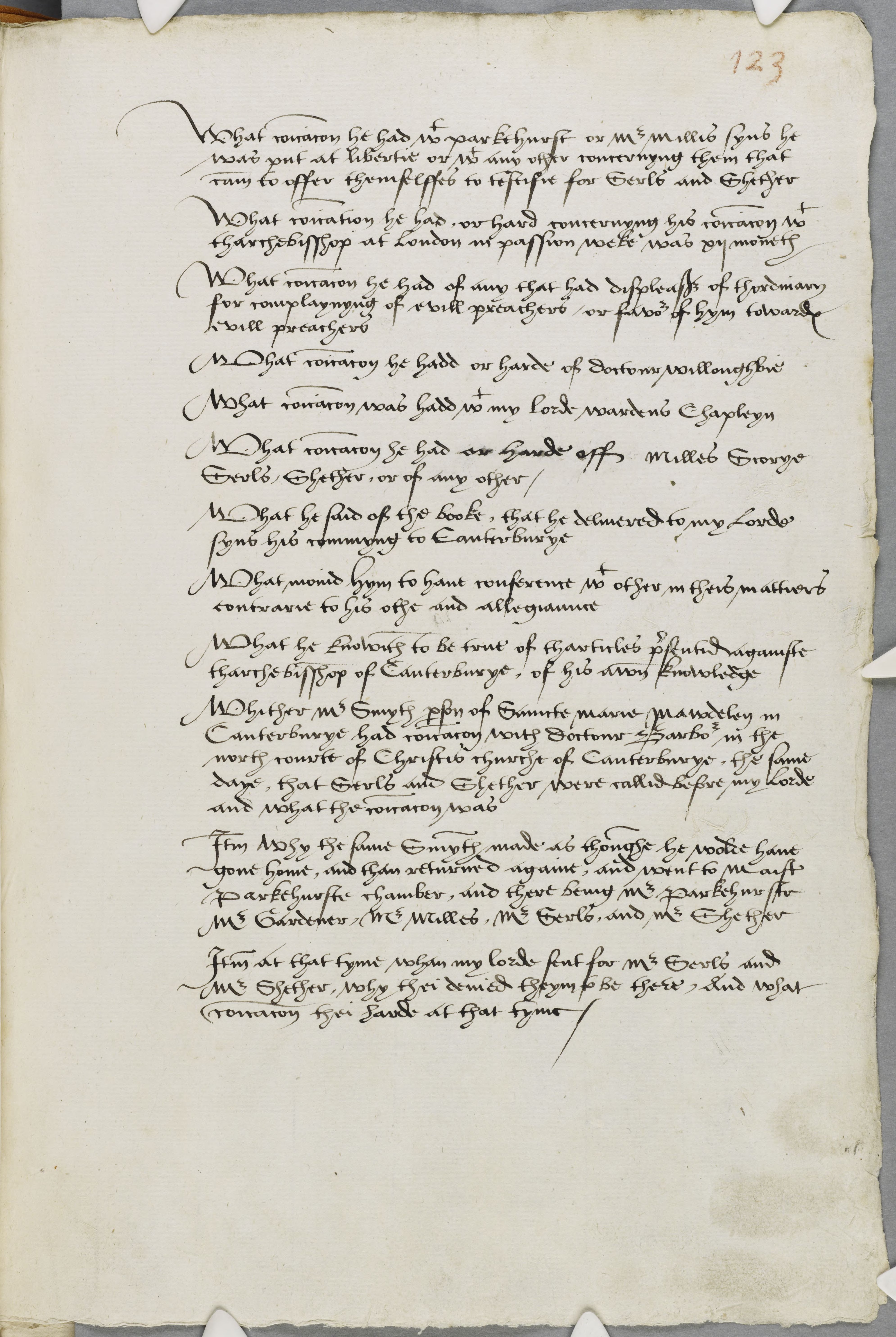 Item why the same Smyth made as thoughe he wolde have gone home, and than returned againe, and went to Maister Parkehurste chamber, and there being Mr. Parkehurste Mr. Gardener, Mr Milles, Mr. Serls, and Mr. Shether