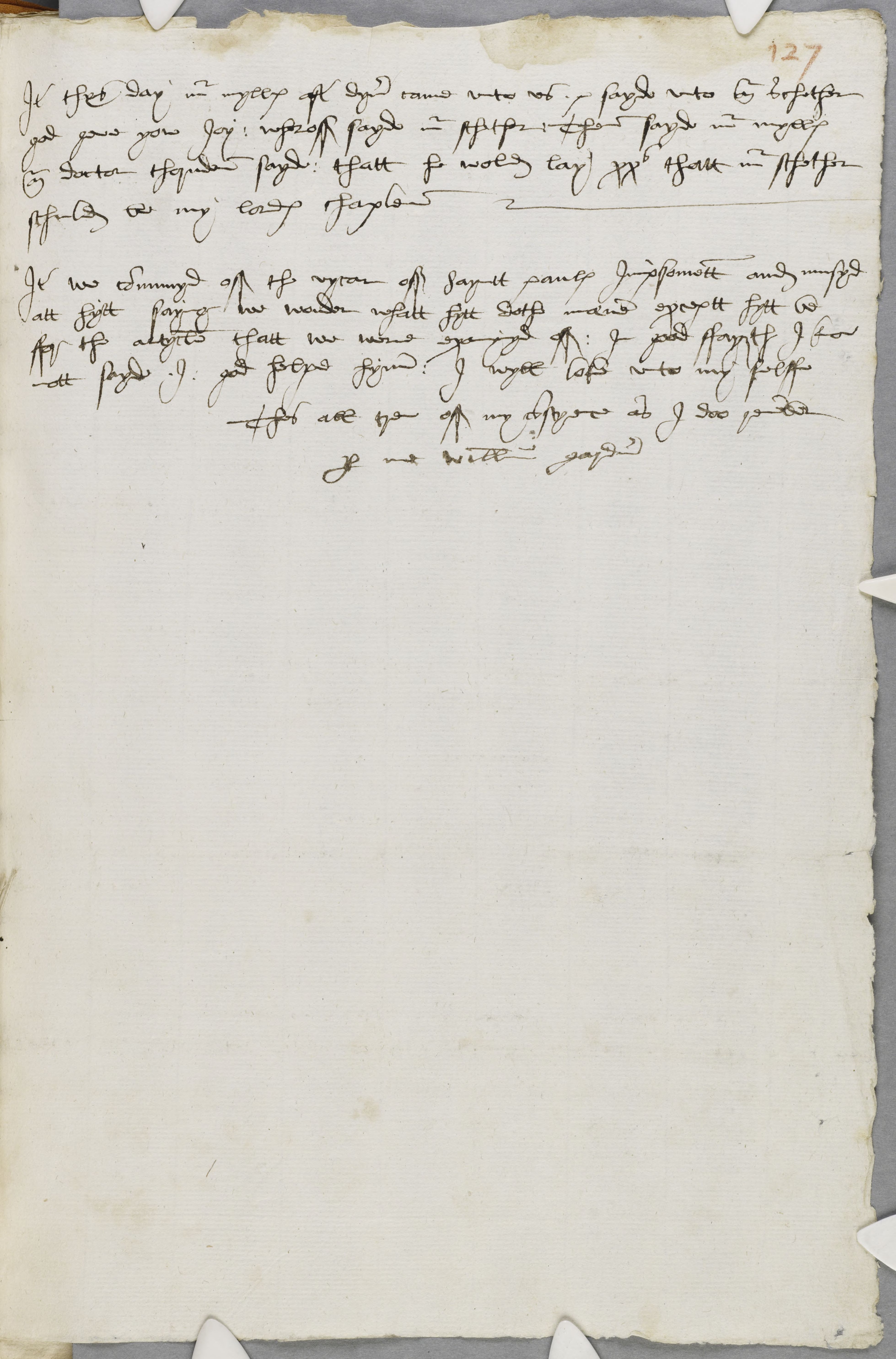 Item thys day Mr. mylles after dyner came unto us. & sayde unto Mr. schether god geve yow Joy: wheroff sayde Mr. schether: Ther sayde Mr. mylles Mr. doctor thornden sayde : thatt he wold lay xxs thatt Mr. schether schuld be my lordes chaplen