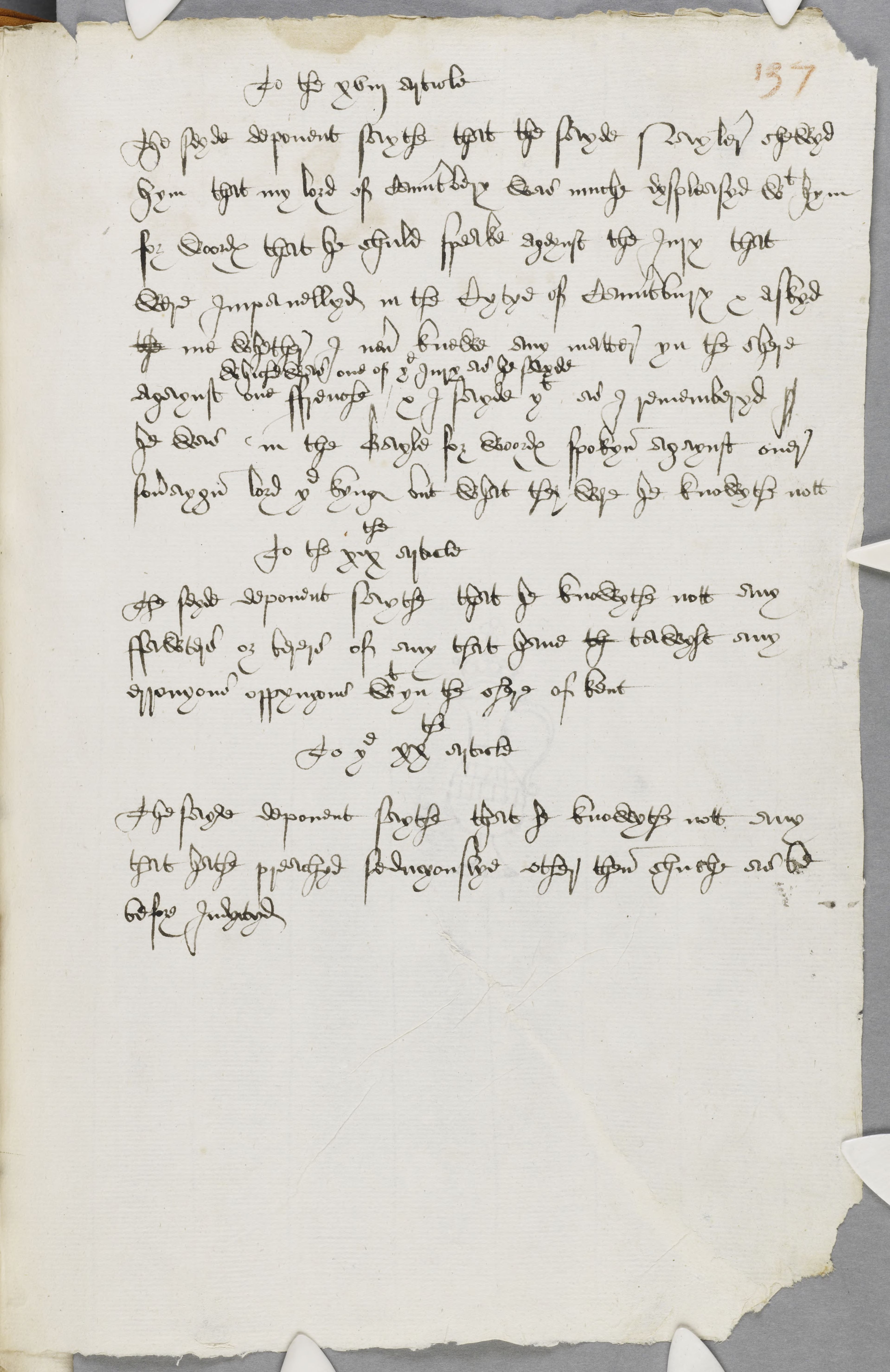 The seyde deponent saythe that the sayde Nayler shewyd hym that my lord of Caunterbury was muche dyspleasyd with hym for woordes that he shuld speake agaynst the Jury that were Impanellyd in the Cytye of Caunterbury & askyd the me Whether I never knewe any matter yn the shere agaynst one ffrenche whiche was one of the Jury as he sayde / & I sayde that as I rememberyd I he was in the Gayle for woordes spokyn agaynst ouer soveraygn lord the kyng but what they were he knowythe nott