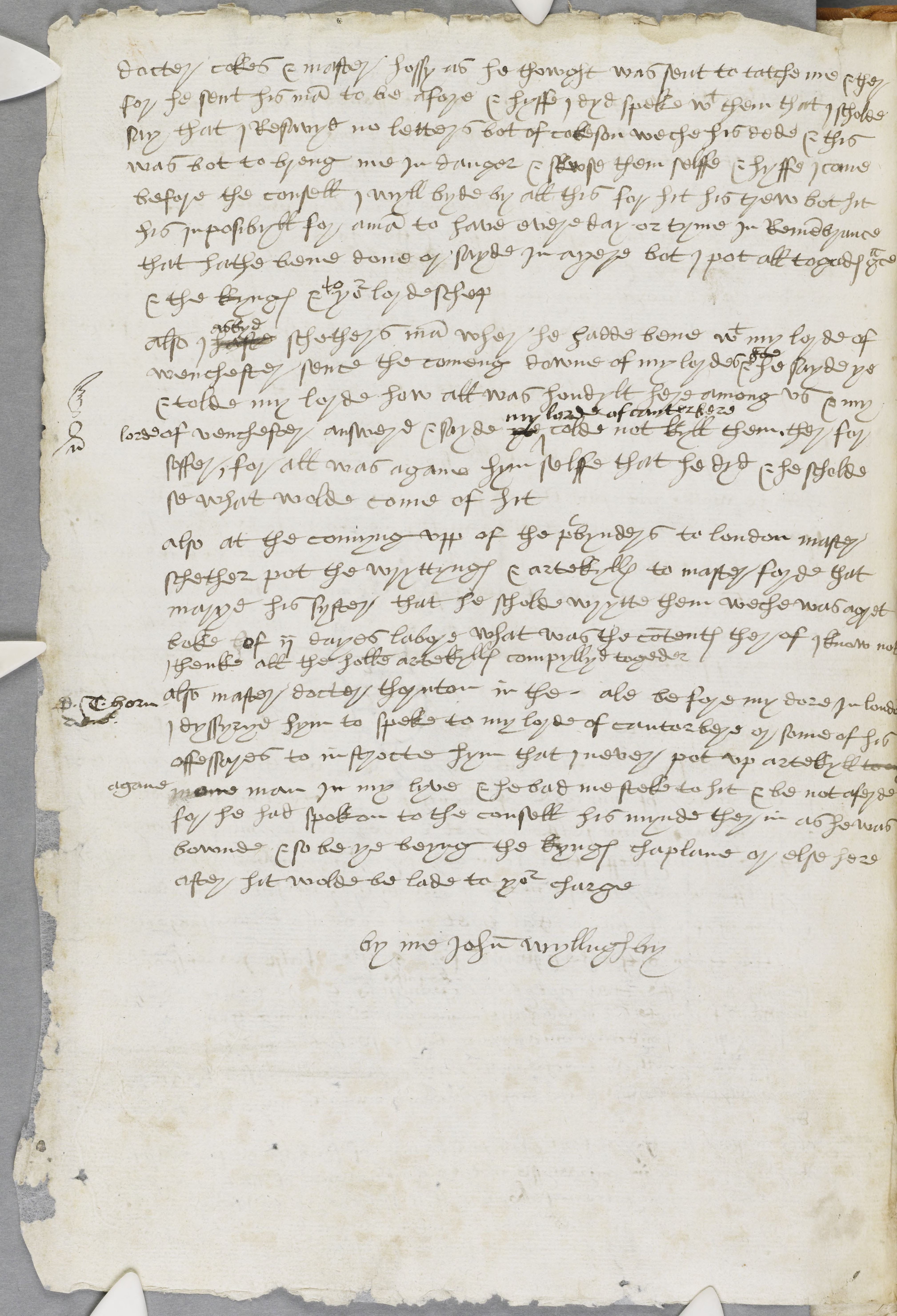 docter cokes & master hossy as he thowght was sent to tatche me & ther for he sent his man to be afore & hyffe I dyd speke with them that I scholde say that I Resayvyd no letters bot of cokeson weche his dede & this was bot to breng me In danger & fawse them selffe & hyffe I come before the consell I wyll byde by all this for hit his trew bot hit his Inposibyll for aman to have evere day or tyme In Remembrance that hathe bene done or sayde in ayere bot I pot all to godes grace & the kynges & to your lordeshep