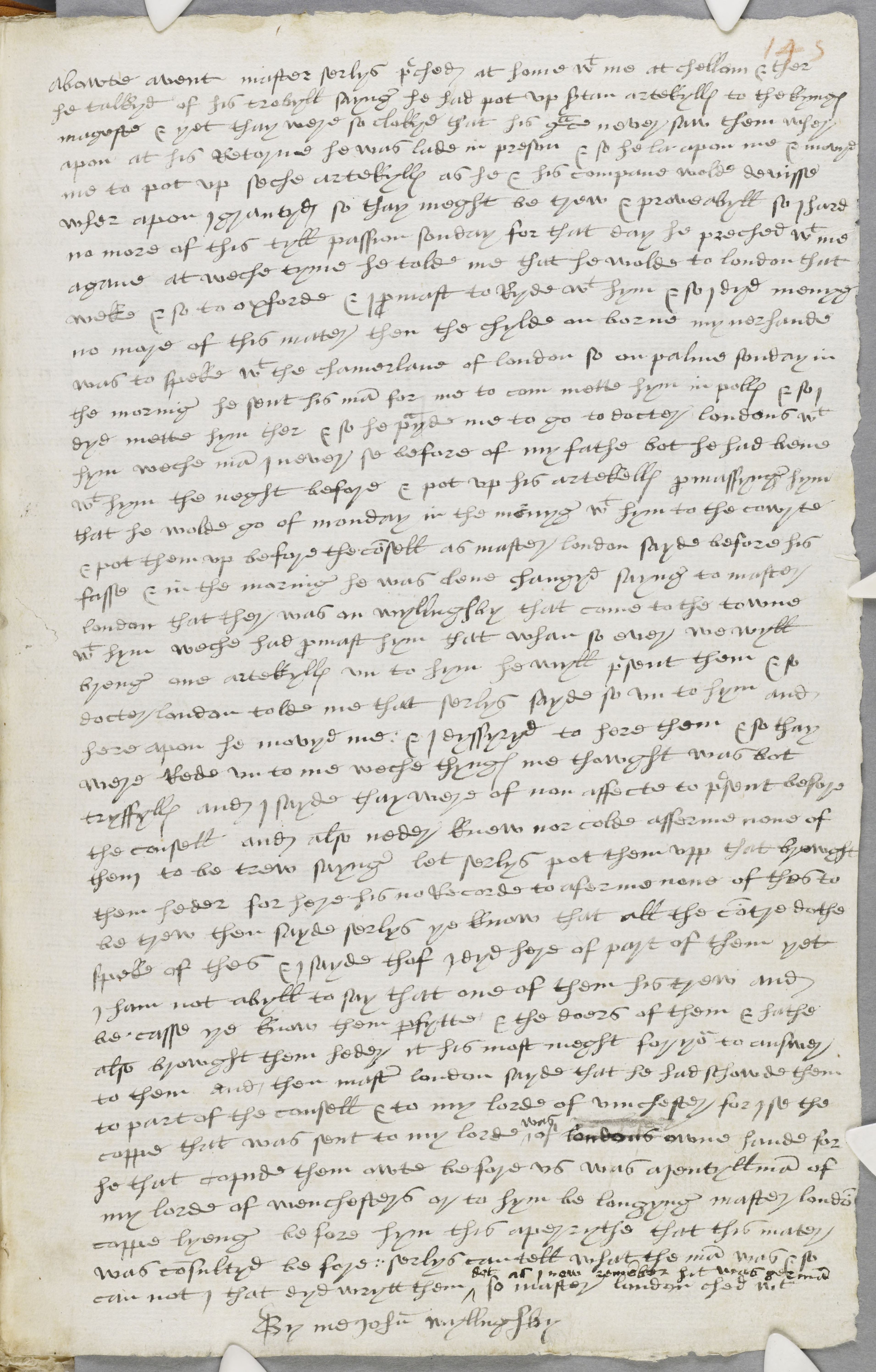 abowte avent master serlys preched at home with me at chellam & ther he talkyd of his trobyll sayng he had pot up sertan artekylles to the kynges mageste & yet thay were so clokyd that his grace never saw them wher apon at his Retorne he was lade in preson & so he lai apon me & movyd me to pot up seche artekylles as he & his compane wolde devisse wher apon I grantyd so thay meght be trew & proveabyll so I hard no more of this tyll passion sonday for that day he preched with me agane at weche tyme he tolde me that he wolde to london that weke & so to oxforde & I promast to Ryde with hym & so I dyd menyg no more of this mater then the chylde on borne my nerhande was to speke with the chamerlane of london so on palme sonday in the mornig he sent his man for me to com mette hym in polles & so I dyd mette hym ther & so he prayde me to go to docter londons with hym weche man I never se before of my fathe bot he had bene with hym the neght before & pot up his artekelles promassyng hym that he wolde go of monday in the mornyg with hym to the cowrte & pot them up before the consell as master london sayde before his fasse & in the mornig he was clene changyd sayng to master london that ther was on wyllughby that come to the towne with hym weche had promast hym that whan so ever we wyll breng ane artekylles un to hym he wyll present them & so docter london tolde me that serlys sayde so un to hym and here apon he movyd me: & I dyssyryd to here them & so thay were Rede un to me weche thynges me thowght was bot tryffylles and I sayde thay were of non affecte to present before the consell and also neder knew nor colde afferme none of them to be trew sayng let serlys pot them upp that browght them heder for here his no Recorde to aferme none of thes to be trew then sayde serlys ye know that all the contre dothe speke of thes & I sayde thos Ieyd here of part of them yet I ham not abyll to say that one of them his trew and be casse ye know them profytte & the doers of them & hathe also browght them heder it his most meght for you to answer to them. And then master london sayde that he had schowde them to part of the consell & to my lorde of vinchester for I se the coppie that was sent to my lorde was of londons owne hande for he that copide them owte before us was ajentyllman of my lorde of wenchesters or to hym be longyng master london coppie lyeng before hym this aperrythe that this mater was consultyd be fore: serlys can tell what the man was & so can not I that dyd wrytt them bot as i now remember hit was german so master london ched wt
