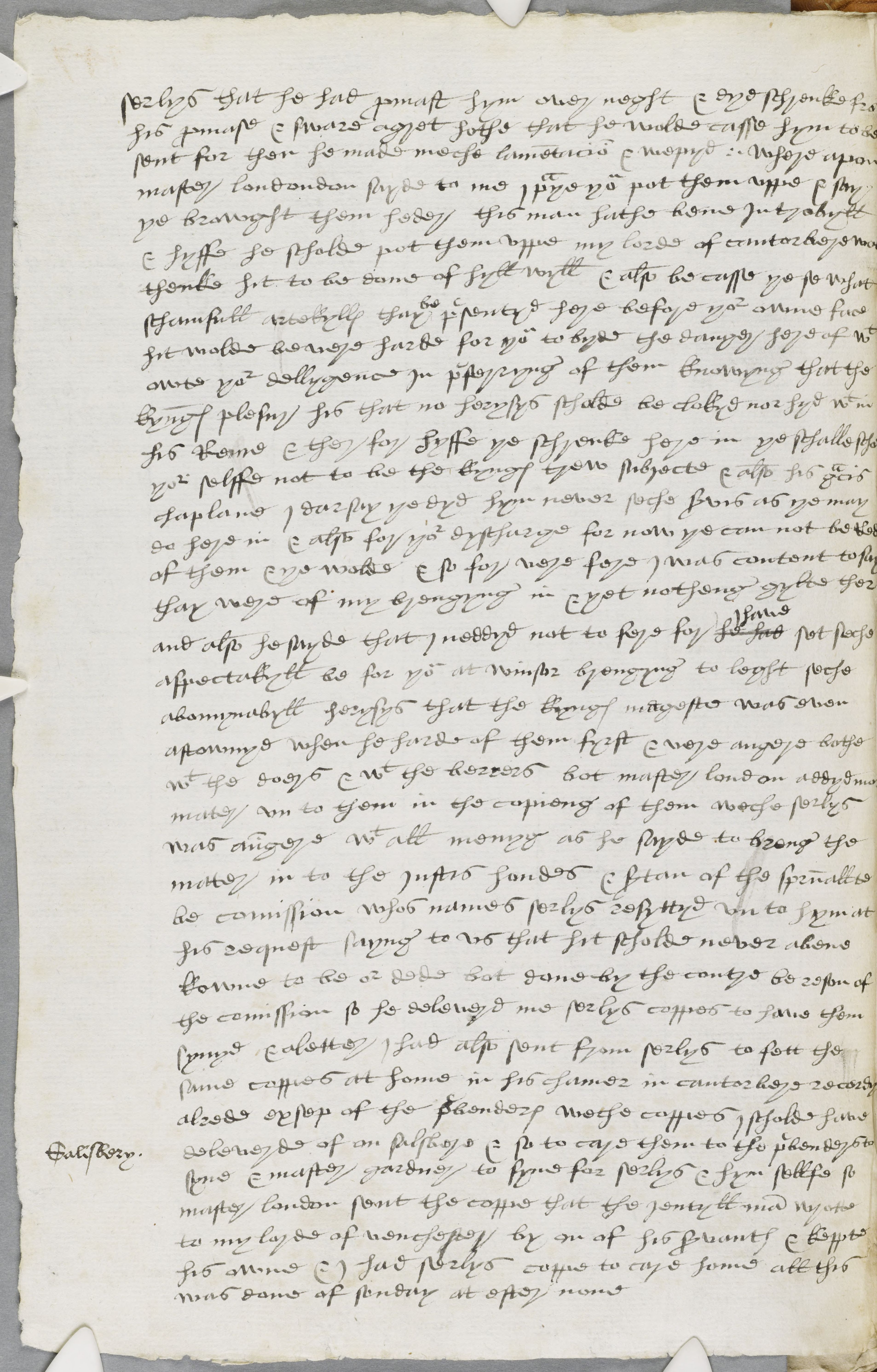 serlys that he had promast hym over neght & dyd schrenke from his promase & sware agret hothe that he wolde casse hym to be sent for then he made meche lamentacion & wepyd: where apon master londondon sayde to me I praye you pot them uppe & say ye browght them heder this man hathe bene introbyll & hyffe he scholde pot them uppe my lorde of cantorbere wold thenke hit to be done of hyll wyll & also be casse ye se what schamfull artekylles thay be presentyd here before your owne face hit wolde be vere harde for you to byde the danger here of with owte your dellygence in presterryng of them knowyng that the kynges plesur his that no herysys scholde be clokyd nor hyd with in his Reme & ther for hyffe ye schrenke here in ye schalle schow your selffe not to be the kynges trew subjecte & also his gracis chaplane I darsay ye dyd hym never seche servis as ye may do here in & also for your dyscharge for now ye can not be Red of them & ye wolde & so for vere fere I was content to say thay were of my brengyng in & yet notheng gylte ther and also he sayde that I neddyd not to fere for he had I have set seche aspectakyll be for you at winsor brengyng to leght seche abomynabyll herysys that the kynges mageste was even astownyd when he harde of them fyrst & vere angere bothe with the doers & with the berrers bot master london addyd more mater un to them in the copieng of them weche serlys was aungere with all menyg as he sayd to breng the mater in to the justis handes & sertan of the spirituallte be comission whos names serlys resyttyd un to hym at his request sayng to us that hit scholde never abene kowne to be or dede bot done by the contre be reson of the comission so he deleverd me serlys coppies to have them synyd & aletter I had also sent from serlys to sett the same coppies at home inhis chamer in cantorbere recordyd alrede exsep of the prebenderes weche coppies I scholde have