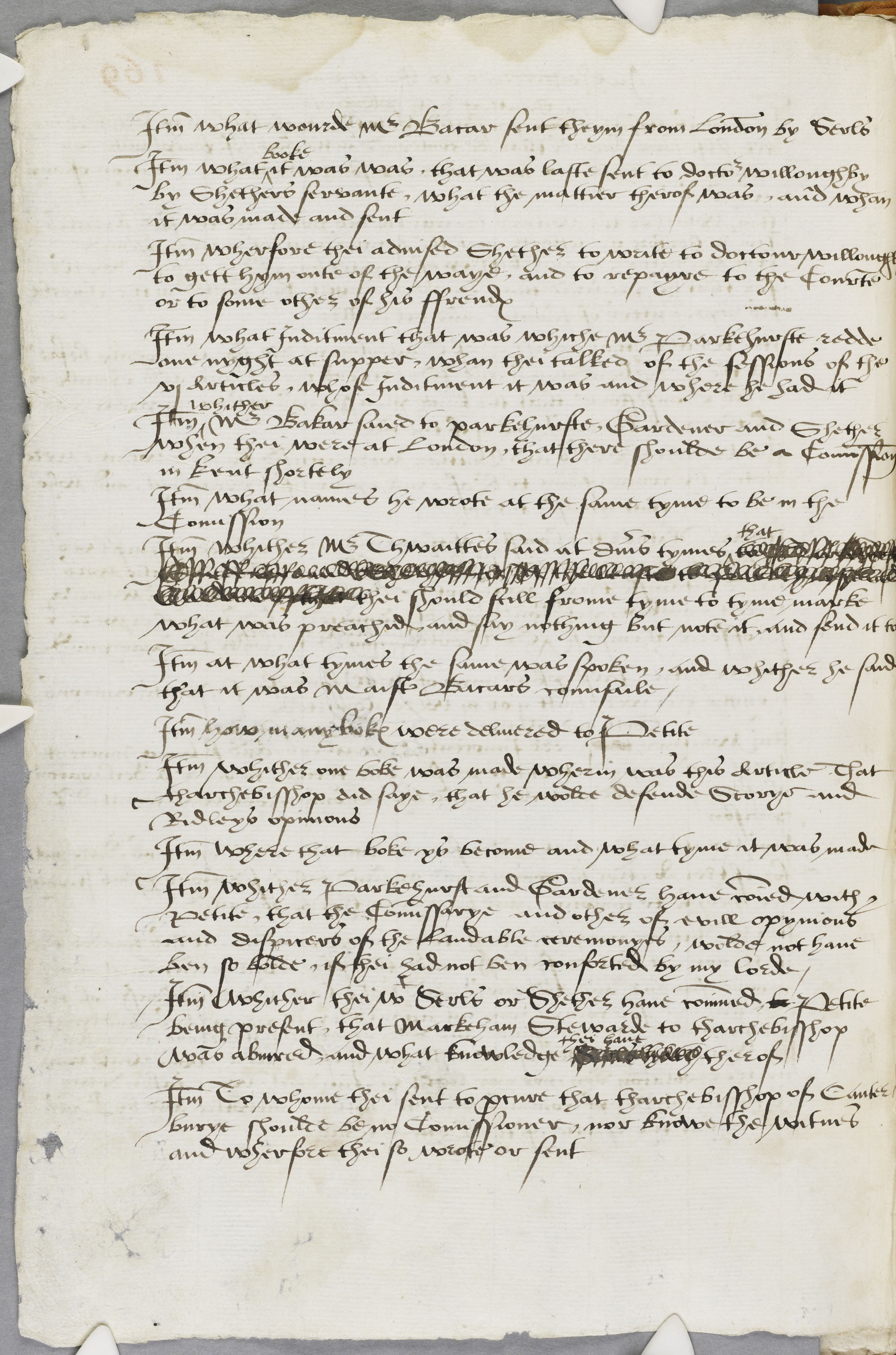 Item whither Parkehurst and Gardener have communied with Petite, that the Commissarye and other of evill opynions and dispicers of the laudable ceremonyes, wolde not have ben so bolde, if thei had not ben conforted by my lorde.