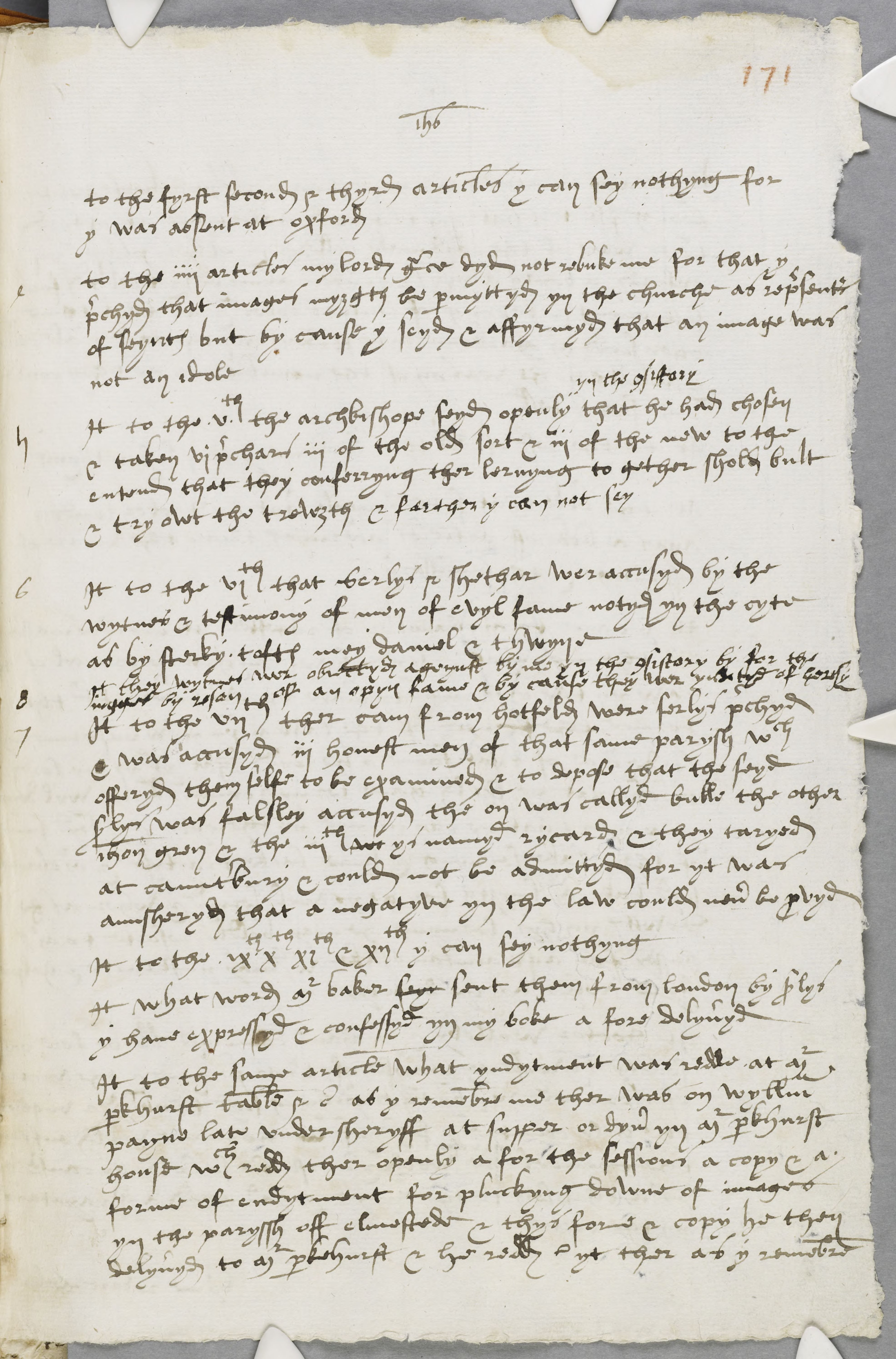 Item to the vth the archbishope seyd openly yn the consistorythat he had chosen & taken vi prechars iii of the old sort & iii of the new to the entend that they conferryng ther lernyng to gether shold bult & try owt the trewzth & farther y can not sey