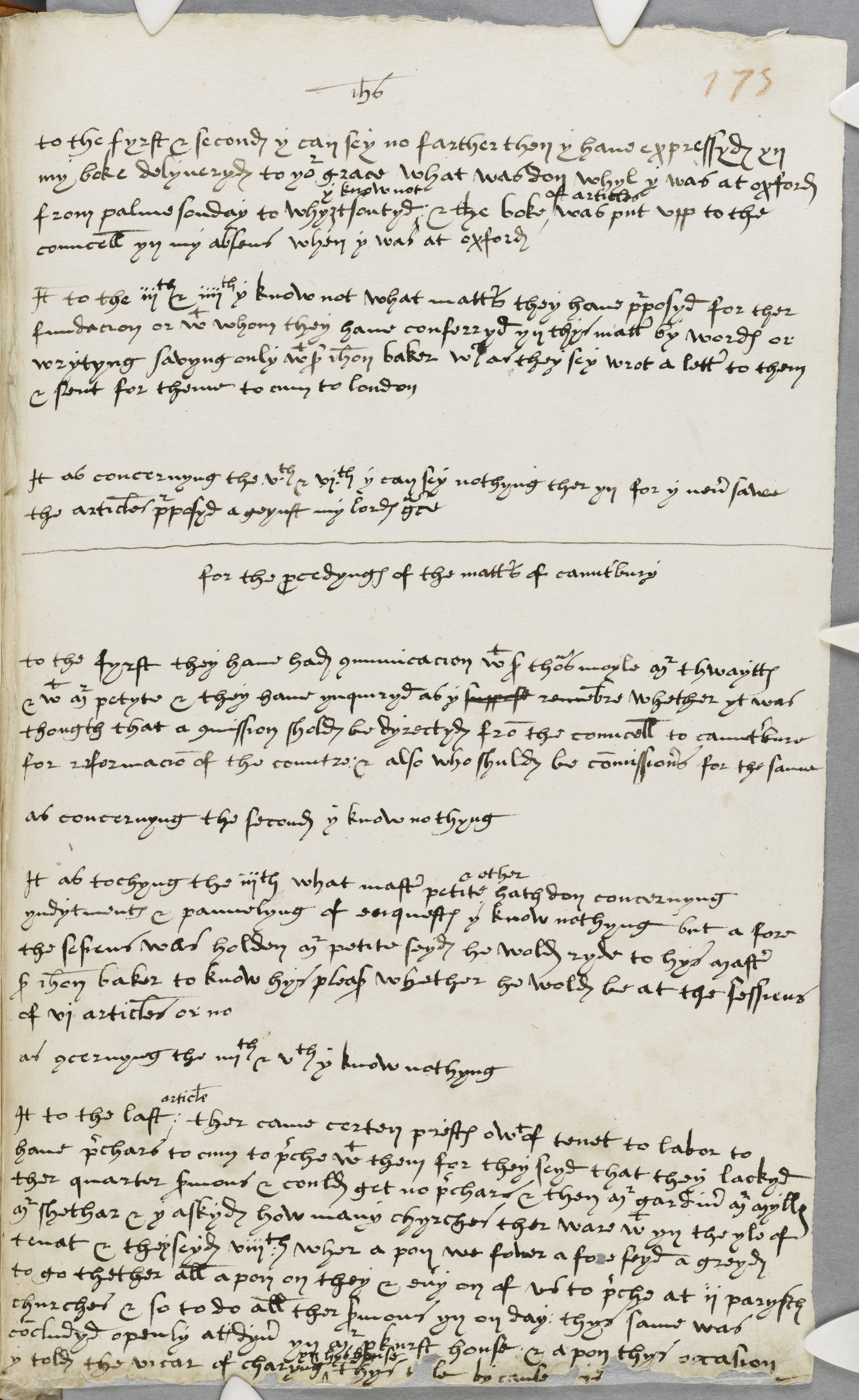 to the fyrst & second y can sey no farther then y have expressyd yn my boke delyveryd to your grace what was don whyl y was at oxford from palme sonday to whygthsontyd y know not : & the boke of articles was put upp to the councell yn my absens when y was at oxford.