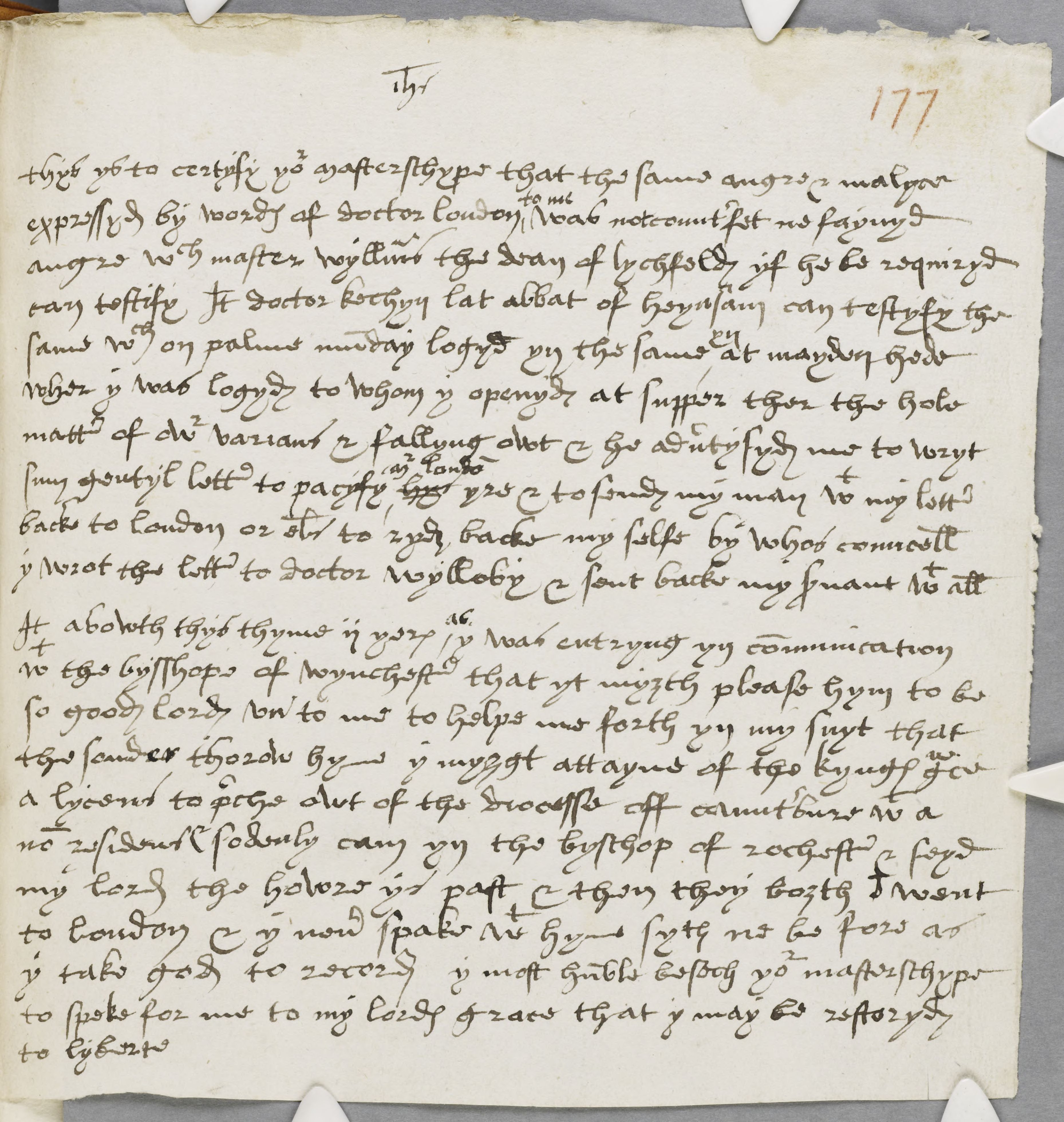 thys ys to certyfy your mastershype that the same angre & malyce expressyd by wordes of doctor london to me was not counterfet ne faynyd angre which master wyllyams the dean of lychfeld yf he be requiryd can testify Item doctor kechyn lat abbat of heynsam can testyfy the same which on palme munday logyd yn the same yn at maydenhede wher y was logyd to whom y openyd at supper ther the hole matter of owr varians & fallyng owt & he advertysyd me to wryt sum gentyl letter to pacyfy mr london hys yre & to sende my man with my letter backe to london or eles to ryd backe my selfe by whos councell y wrot the letter to doctor wylloby & sent backe my servant with all