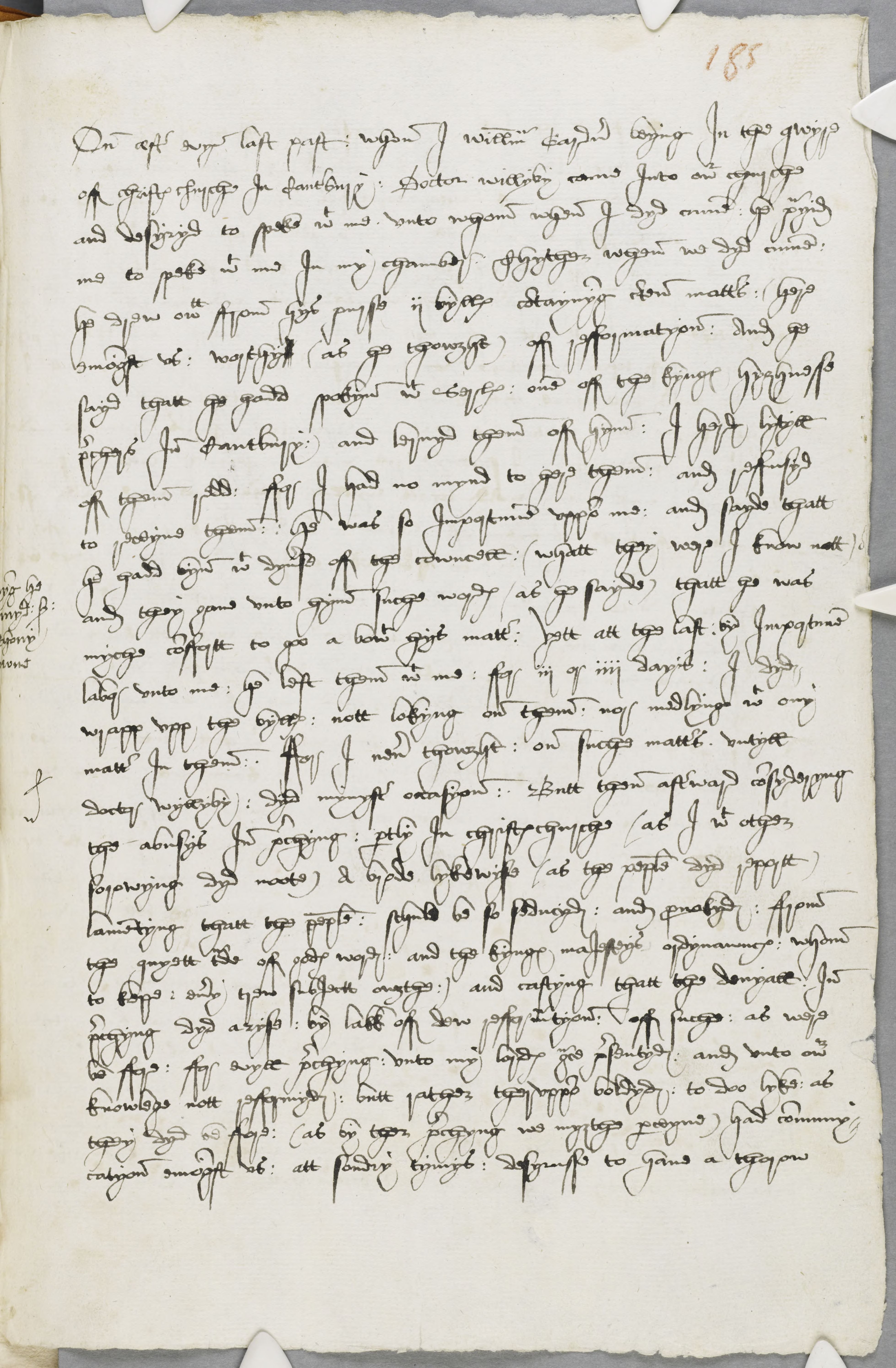 On aester evyn last past : when I william Gardner beyng In the qwyre off christes churche In Canterbury : Doctor willyby came Into owr churche and desyryd to speke with me. unto whom when I dyd cume : he prayid me to speke with me In my chamber Thyther when we dyd cume : he drew owtt ffrom hys purse ii bylles contaynyng certen matters : (here emongst us : worthy (as he thowght) off refformatyon: And he sayd thatt he hadd spokyn with Serles : one off the kynges hyghnesse prechers In Canterbury : and lernyd them off hym : I herd lytyll off them redd : ffor I had no mynd to here them : and reffusyd to receyve them : he was so Importune uppon me : and sayde thatt he hadd byn with dyverse off the cowncell : (whatt they were I know nott) and they gave unto hym suche wordes (as he sayde) thatt he was myche conffortt to goo a bowt hys matter : yett att the last : by Importune labor unto me : he left them with me : ffor iii or iii dayis : I dyd wrapp upp the bylles : nott lokyng on them : not medlyng with any matter In them : . ffor I never thowght : on suche matters. untyll doctor wyllyby : dyd mynyster occasyon : Butt then afterward consyderyng the abusys In prechyng : partly In christes churche (as I with other sorowyng dyd noote) A brode lykewyse (as the people dyd reportt) lamentyng thatt the people : schuld be so seducyd : and provokyd : ffrom the quyett trade off godes word : and the kynges maJesteys ordynaunces : whom to kepe : every trew subjectte owghte :) and castyng thatt the denyall : In prechyng dyd aryse : by lakk off dew refformatyon : off suche : as were be ffore : ffor evyll prechyng : unto my lordes grace presentyd : and unto owr knowlege nott refformyd : butt rather theruppon boldyd : to doo lyke : as they dyd beffore : (as by ther prechyng we myghte perceyve) had communy- catyon emongst us : att sondry tymys : desyrusse to have a thorow