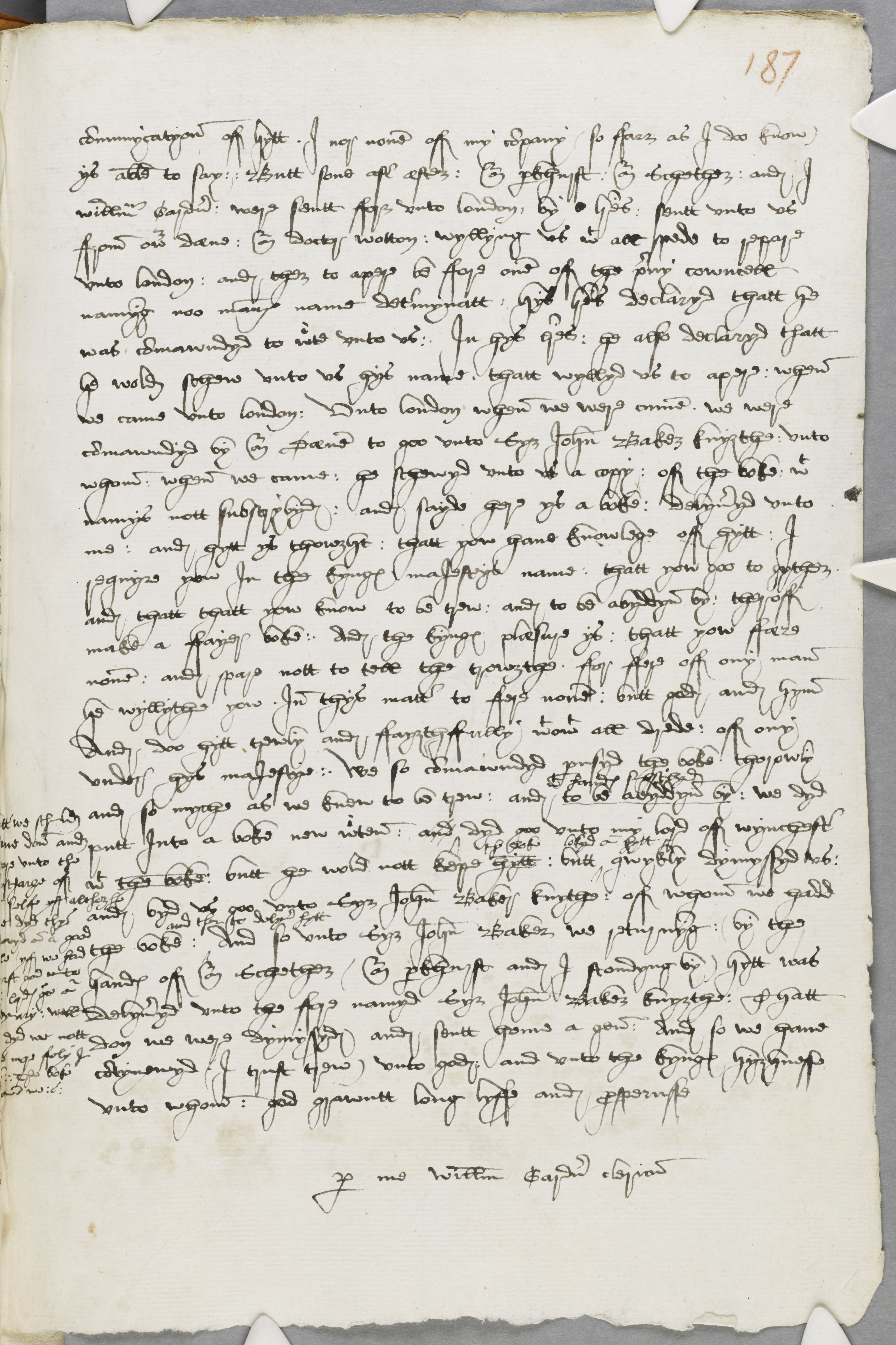 communycatyon off hytt. I nor none off my company (so ffarr as I doo know) ys able to say: Butt sone after aester : Mr parkhurst: Mr Schether: and I william Gardner: were sentt ffor unto london, by lettres : sentt unto us from owr daene: Mr doctor wotton: wyllyng us with all spede to repare unto london: and ther to apere be ffore one off the privy cowncell namyng noo manes name determynatt: hys lettres declaryd thatt he was commawndyd to write unto us: In hys lettres: he also declaryd thatt he wold schew unto us hys name. thatt wyllyd us to apere: when we came unto london: Unto london when we were cume we were commawndyd by Mr Daene to goo unto Syr John Baker knygthe: unto whom: when we came: he schewyd unto us a copy: off the boke: with namys nott subscrybyd: and sayde here ys a boke: delyveryd unto me: and hytt ys thowght: thatt yow have knowlege off hytt: I requyre yow In the kynges majesteys name: thatt yow goo to gyther and thatt thatt yow know to be trew: and to be abyddyn by: theroff make a ffayer boke: And the kynges plaesure ys: thatt yow ffare none: and spare nott to tell the trowthe. ffor ffere off ony man he wyllythe yow. In thys matter to ffere none: butt god and hym