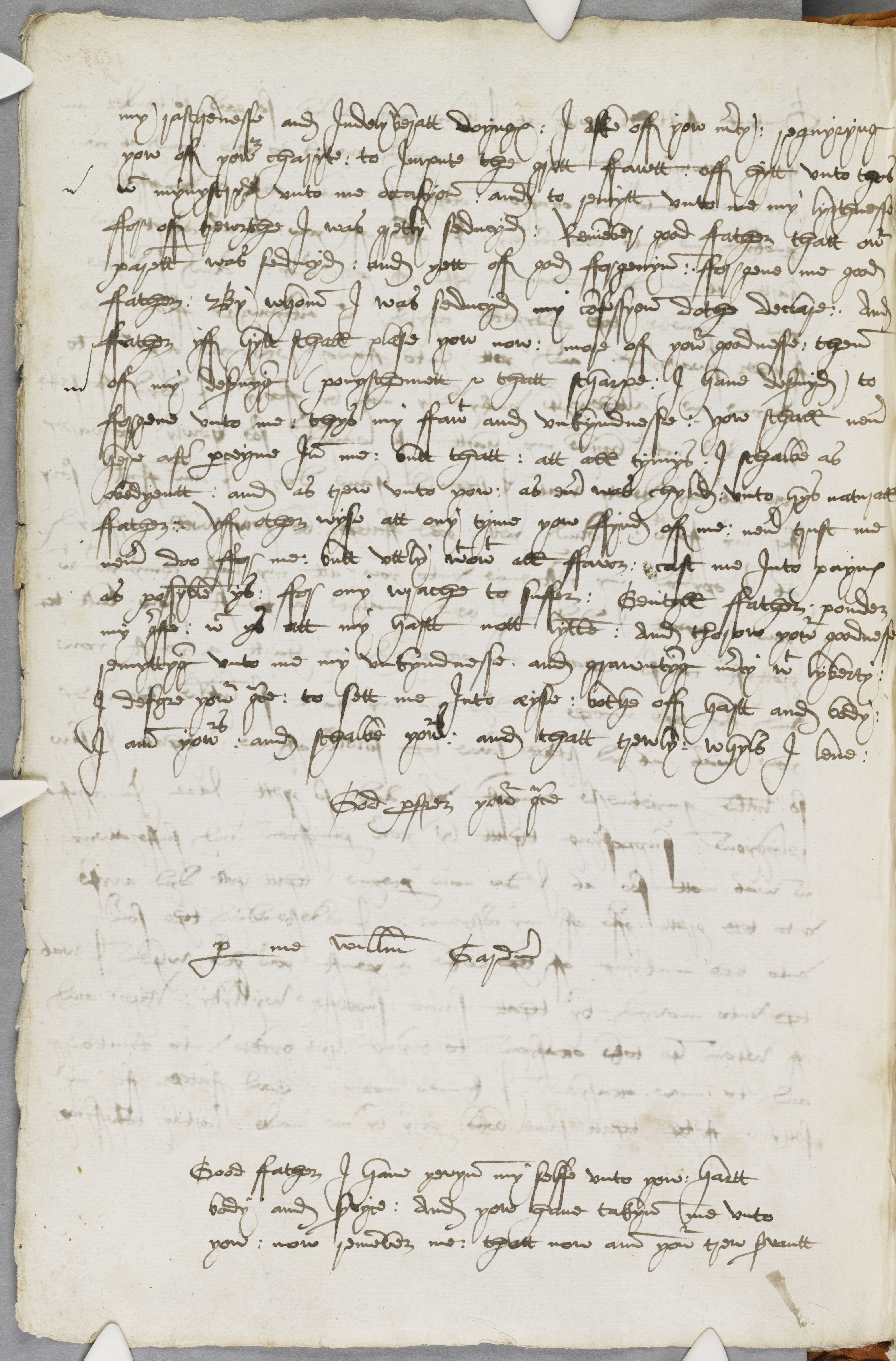my raschenesse and Indelyberatt doynges : I aske off yow mercy : requyryng yow off yowr charyte : to Impute the grett ffawtt : off hytt unto thes wich mynystryd unto me occasyon : and to remytt unto me my lygthnesse ffor off trewgthe I was gretly seducyd : Remember good ffather thatt owr parentt was seducyd : and yett off god fforgevyn : fforgeve me good ffather : By whom I was seducyd my confessyon dothe declare : And ffather yff hytt schall plaese yow now : more off yowr goodnesse : then