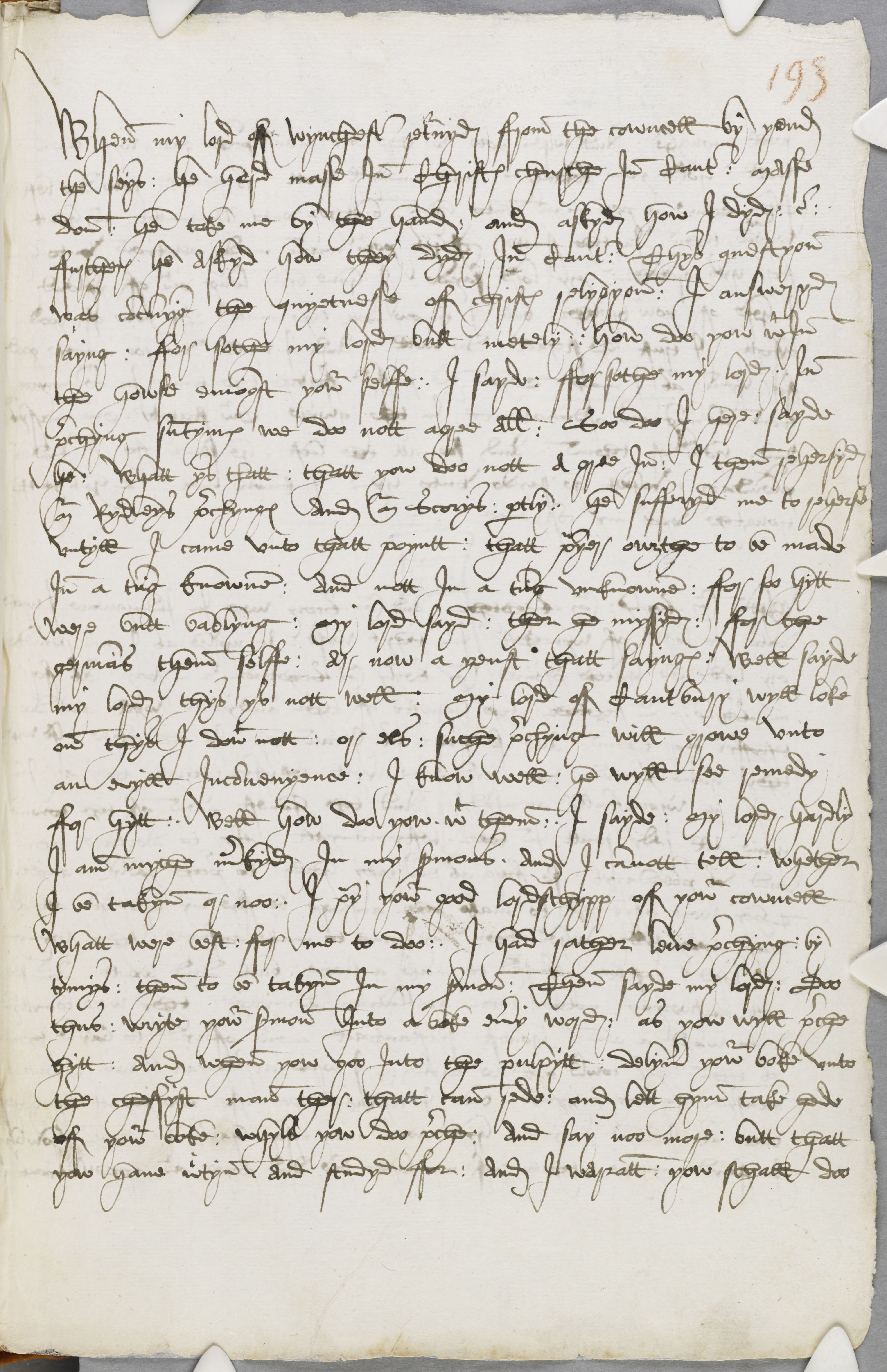 When my lord off wynchester returnyd ffrom the cowncell by yond the seys : he herd masse In Christes churche In canterbury : masse don : he take me by the hand : and askyd how I dyd : & ffurther he askyd how they dyd In Canterbury : Thys questyon was concernyng the quyetnesse off Christes relygyon : I answeryd sayng : ffor sothe my lord but metely :: how doo yow within the howse emongst yowr selffe. I sayde : ffor sothe my lord In prechyng sumtymes we doo nott agree all : Soo doo I here : sayde he : Whatt ys thatt : thatt yow doo nott A gree In : I then rehersyd mr Rydleys prechynges And mr Scorys partly : he sufferyd me to reherse untyll I came unto thatt poyntt : thatt prayer owgthe to be made In a tung knowne : and nott In a tung unknowne : ffor soo hytt were but bablyng : my lord sayd : ther he myssyd : ffor the germans them selffe : Ar now a yenst thatt saynges : Well sayde my lord thys ys nott well : my lord off Canterbury wyll loke on thys I dowt nott : or els : suche prechyng will growe unto an evyll Inconvenyence : I know well : he wyll see remedy ffor hytt :. Well how doo yow with them :. I sayde : my lord hardly I am myche markyd In my sermons. And I cannott tell : Whether I be takyn or noo: I pray yowr good lordschypp off yowr cowncell whatt were best : ffor me to doo : . I had rather leve prechyng : by tymys : then to be takyn In my sermon : Then sayde my lord : Doo thus : wryte yowr sermon Into a boke every word : as yow wyll preche hytt : And when yow goo Into the pulpytt : delyver yowr boke unto the cheffyst man ther : thatt can rede : and lett hym take hede off yowr boke : whyle yow doo preche : And say noo more : butt thatt yow have writyn : And studyd ffor : And I warrantt : yow schall doo