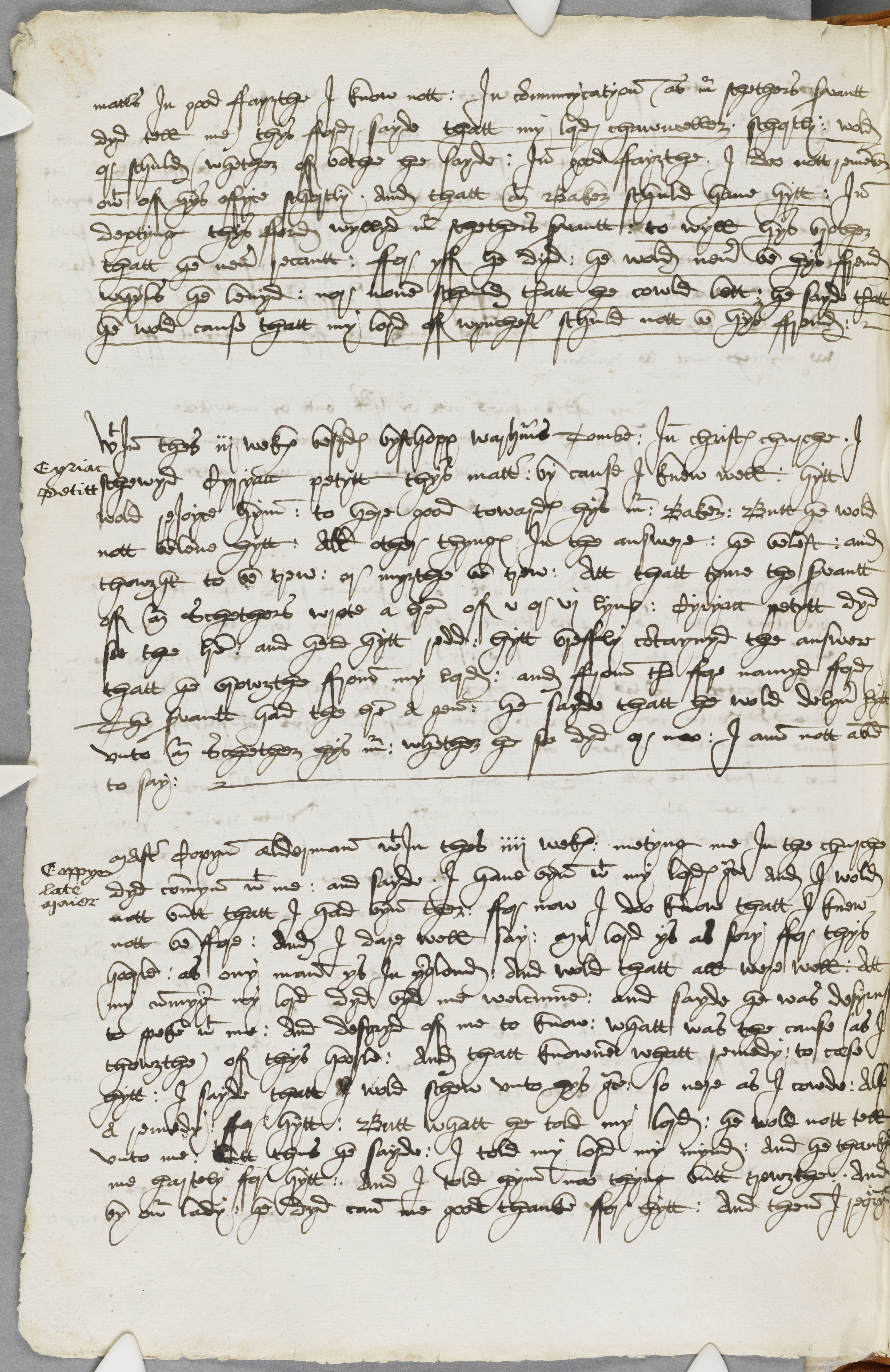 WithIn thes iii wekes besydes byschopp warhams Tombe : In christes churche. I schewyd Cyryacc petytt thys matter : by cause I know well : hytt wold rejoyce hym : to here good towardes hys master Baker : Butt he wold nott beleve hytt : All other thynges In the answere : he beleft : and thowght to be trew : or mygthe be trew : Att thatt tyme the servantt off mr Schethers wrote a lettre off v or vi lynes: Cyryacc petytt dyd see the lettre : and herd hytt redd : hytt breffly contaynyd the answere thatt he browghte ffrom my lord: and ffrom the ffore namyd fford The servantt had the lettre a gen : he sayde thatt he wold delyver hytt unto mr Schether hys master : whether he soo dyd or noo : I am not able to say : Master Copyn alderman within thes iiii wekes : metyng me In the churche