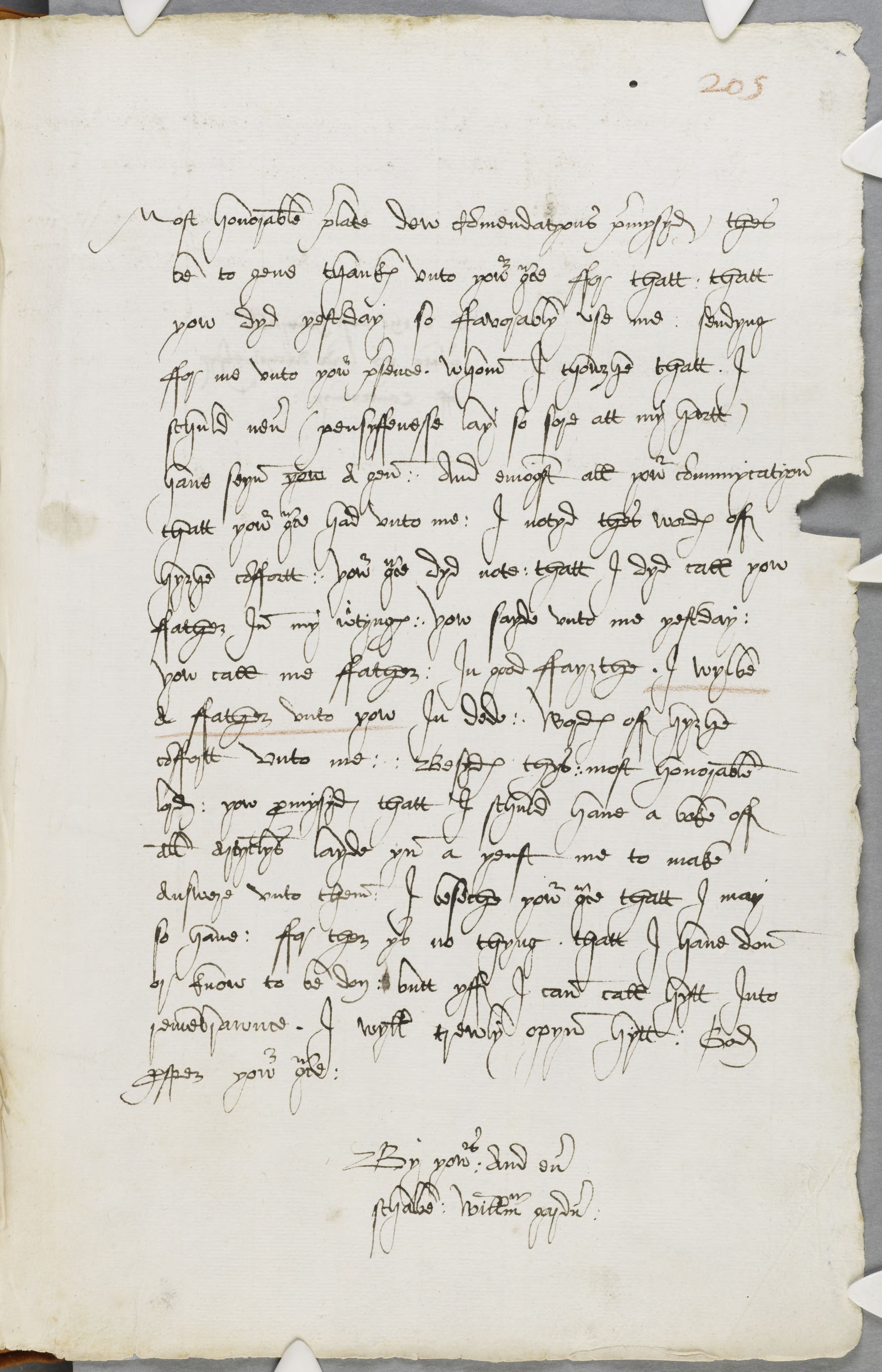 Most honorable prelate dew commendacyons premysyd, thes be to geve thankes unto yowr grace ffor thatt : thatt yow dyd yesterday so ffavorably use me : sendyng ffor me unto yowr presence. whom I thoughte thatt. I schuld never (pensyffenesse lay so sore att my hartt) have seyn yow a gen : And emongst all yowr communycatyon thatt yowr grace had unto me : I notyd thes wordes off hyghe conffortt : yowr grace dyd note : thatt I dyd call yow ffather In my writynges : yow sayde unto me yesterday : yow call me ffather : In good ffaygthe. I wylbe A ffather unto yow In dede : Wordes off hyghe conffortt unto me : : Besydes thys most honorable lord : you promysyd thatt I schuld have a boke off all Artyclys layde yn a yenst me to make Answere unto them : I beseche yowr grace thatt I may so have : ffor ther ys no thyng. thatt I have don or know to be don : butt yff I can call hytt Into remembrawnce. I wyll trewly opyn hytt : God prosper yowr grace :