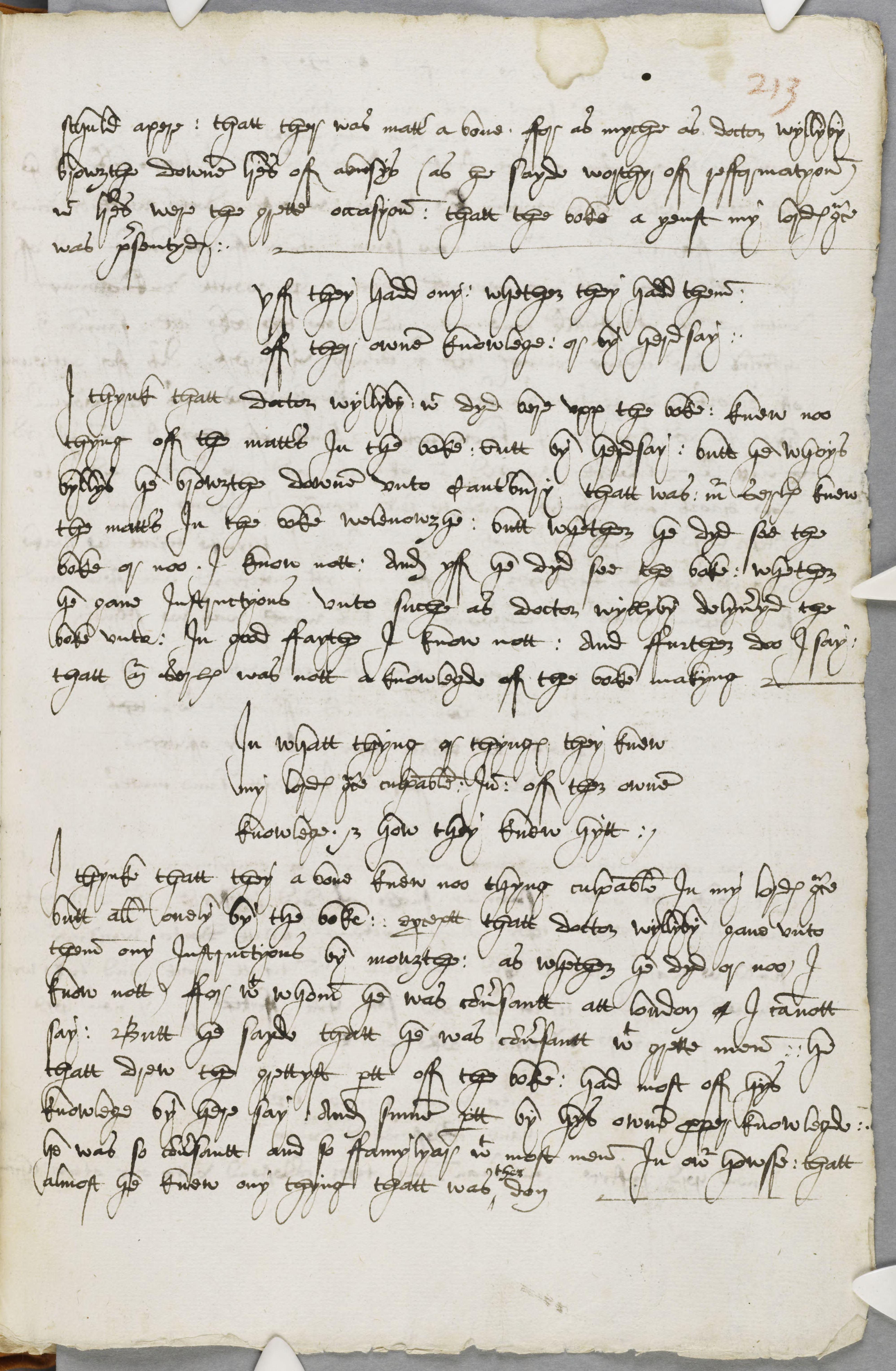 I thynke thatt they a bove knew noo thyng culpable In my lordes grace butt all onely by the boke : exceptt thatt doctor wyllyby gave unto them any Instructyons by mowgthe : as whether he dyd or noo (I know nott) ffor with whom he was conversantt att london I cannott say : Butt he sayde thatt he was conversantt with grette men : he that drew the grettyst partt off the boke : had most off hys knowlege by here say : And summe partt by hys owne proper knowlegde : he was so conversantt and so ffamylyar with most men In owr howsse : thatt almost he knew any thyng thatt was ther don.